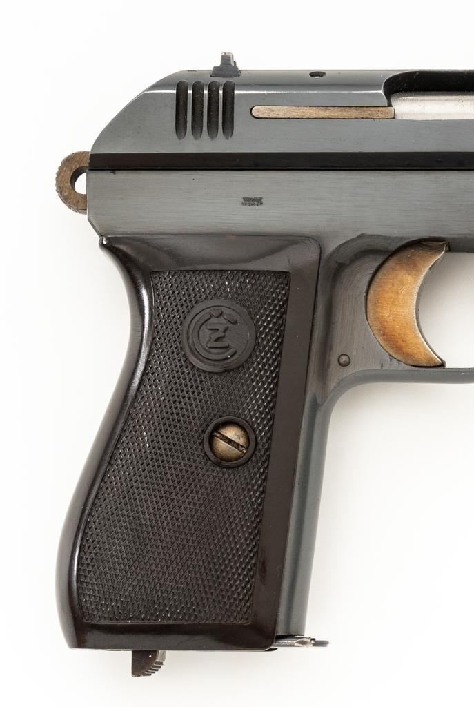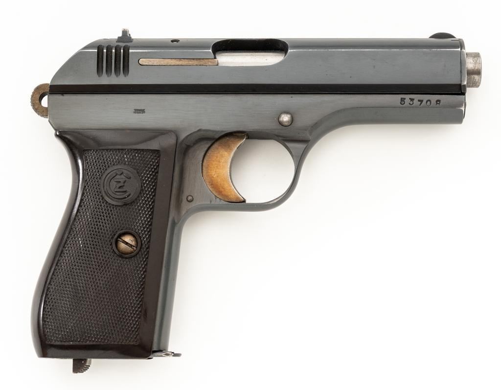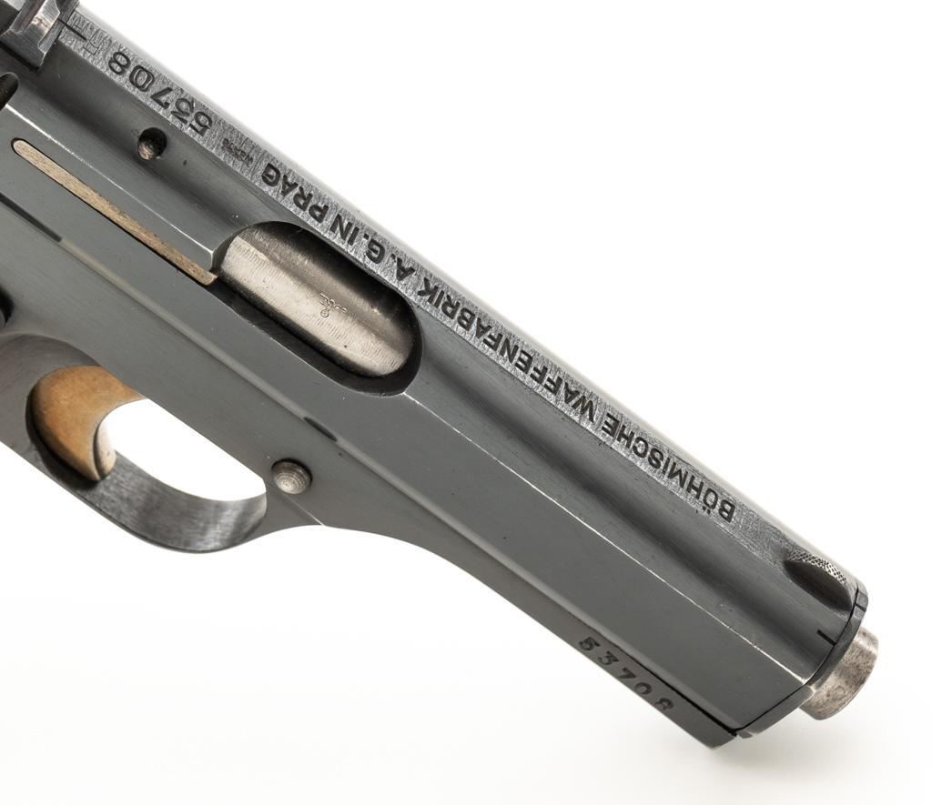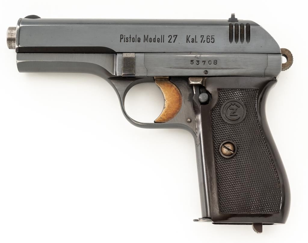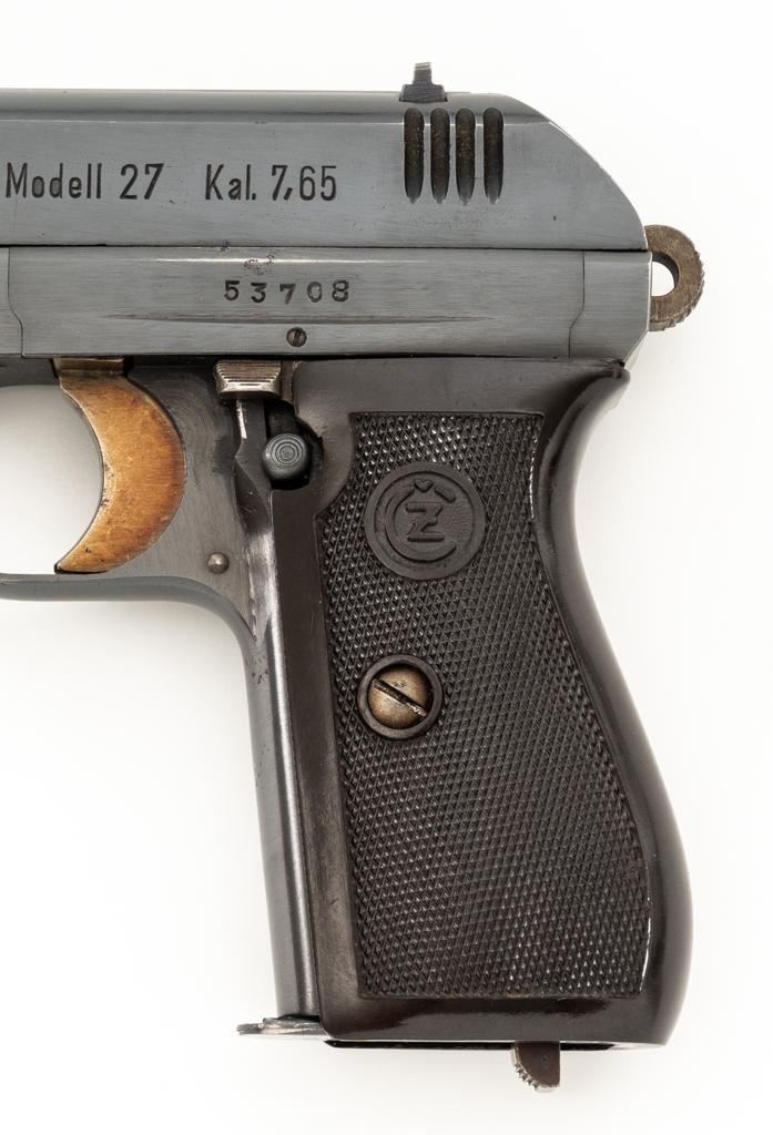 WWII German Proofed Czech Model 27 Semi-Automatic Pistol, #53708, .32 ACP cal., 3.9'' barrel, blued finish with straw colored small parts, checkered dark brown plastic one-piece grip embossed with ''CZ'' logos on each side, blade front sight, and fixed rear sight with ''V''-notch. Includes one magazine with dark phosphate finished body, marked ''P.Mod.27'' on the blued floorplate. Pistol was made during World War II under German occupation and is marked ''Pistole Modell 27 Kal.7,65'' on left side of the slide. Top rib is marked ''BOHMISCHE WAFFENFABRIK A.G.IN PRAG/(Eagle)WaA76/53708''. There is an additional ''(Eagle)WaA76'' stamped on right side of the frame and Nazi eagle firing proof stamped on the barrel at the ejection port. Matching numbers. No visible import marks. Condition overall is near excellent, retaining approx. 96%-97% blue, with light edgewear to the slide and barrel bushing; intermittent salt and pepper blemishes. Approx. 70%-75% straw colors remain, showing thinning and toning mainly to the extractor. Grip is in excellent condition with very light handling marks. Action operates smoothly. Bore is bright with very good, defined rifling. Magazine displays moderate operating wear. Est.: $500-$700. (C&R/PPT)