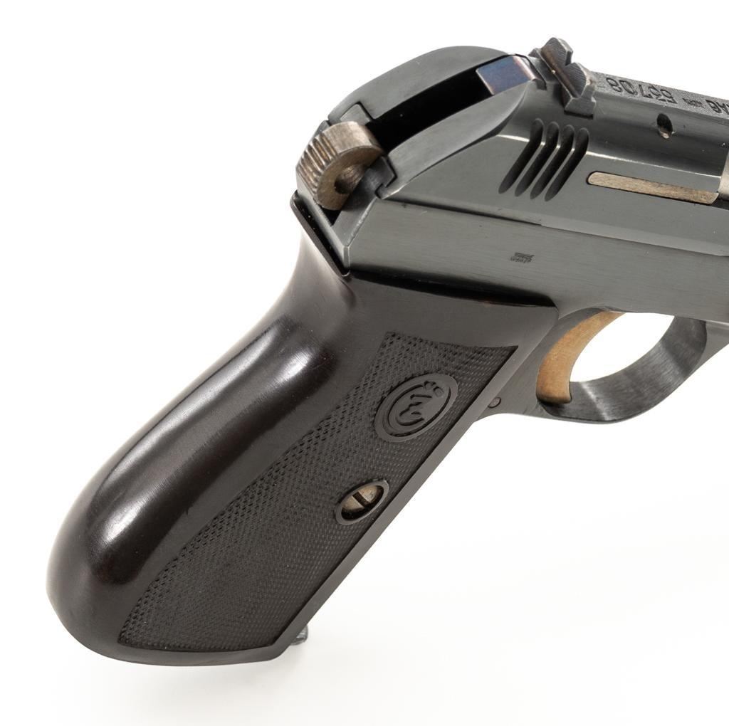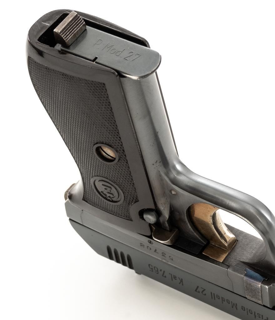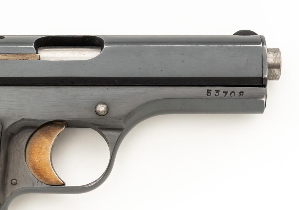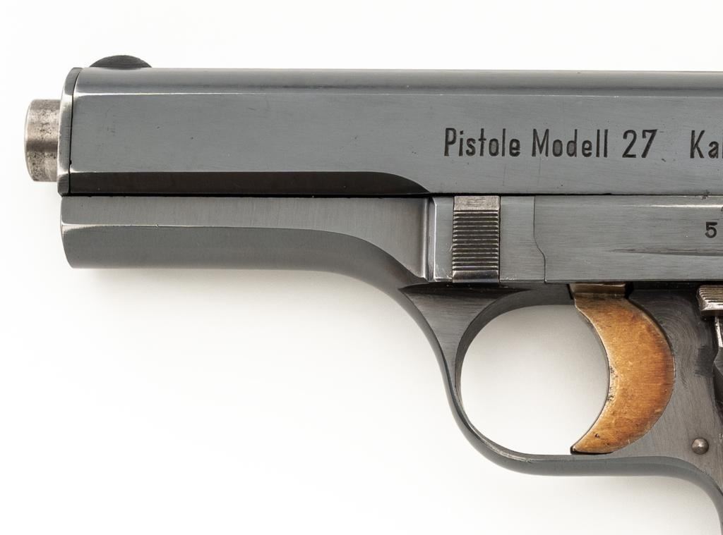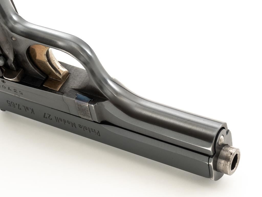 WWII German Proofed Czech Model 27 Semi-Automatic Pistol, #53708, .32 ACP cal., 3.9'' barrel, blued finish with straw colored small parts, checkered dark brown plastic one-piece grip embossed with ''CZ'' logos on each side, blade front sight, and fixed rear sight with ''V''-notch. Includes one magazine with dark phosphate finished body, marked ''P.Mod.27'' on the blued floorplate. Pistol was made during World War II under German occupation and is marked ''Pistole Modell 27 Kal.7,65'' on left side of the slide. Top rib is marked ''BOHMISCHE WAFFENFABRIK A.G.IN PRAG/(Eagle)WaA76/53708''. There is an additional ''(Eagle)WaA76'' stamped on right side of the frame and Nazi eagle firing proof stamped on the barrel at the ejection port. Matching numbers. No visible import marks. Condition overall is near excellent, retaining approx. 96%-97% blue, with light edgewear to the slide and barrel bushing; intermittent salt and pepper blemishes. Approx. 70%-75% straw colors remain, showing thinning and toning mainly to the extractor. Grip is in excellent condition with very light handling marks. Action operates smoothly. Bore is bright with very good, defined rifling. Magazine displays moderate operating wear. Est.: $500-$700. (C&R/PPT)