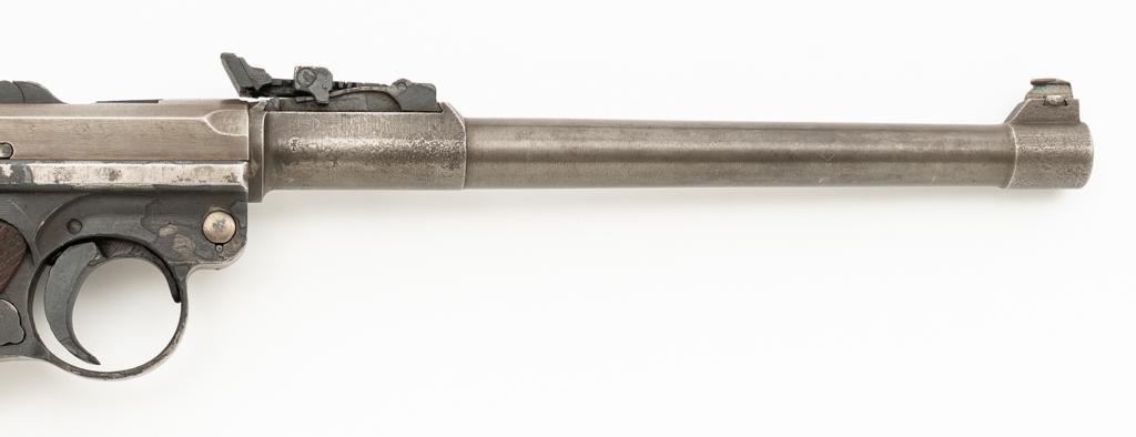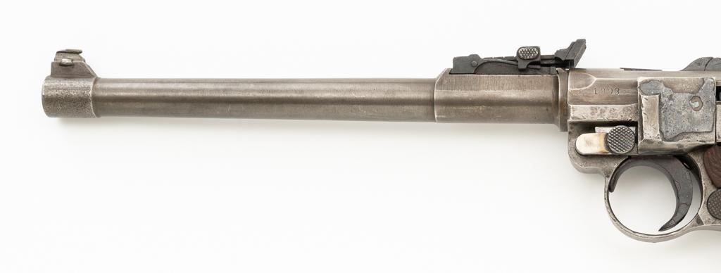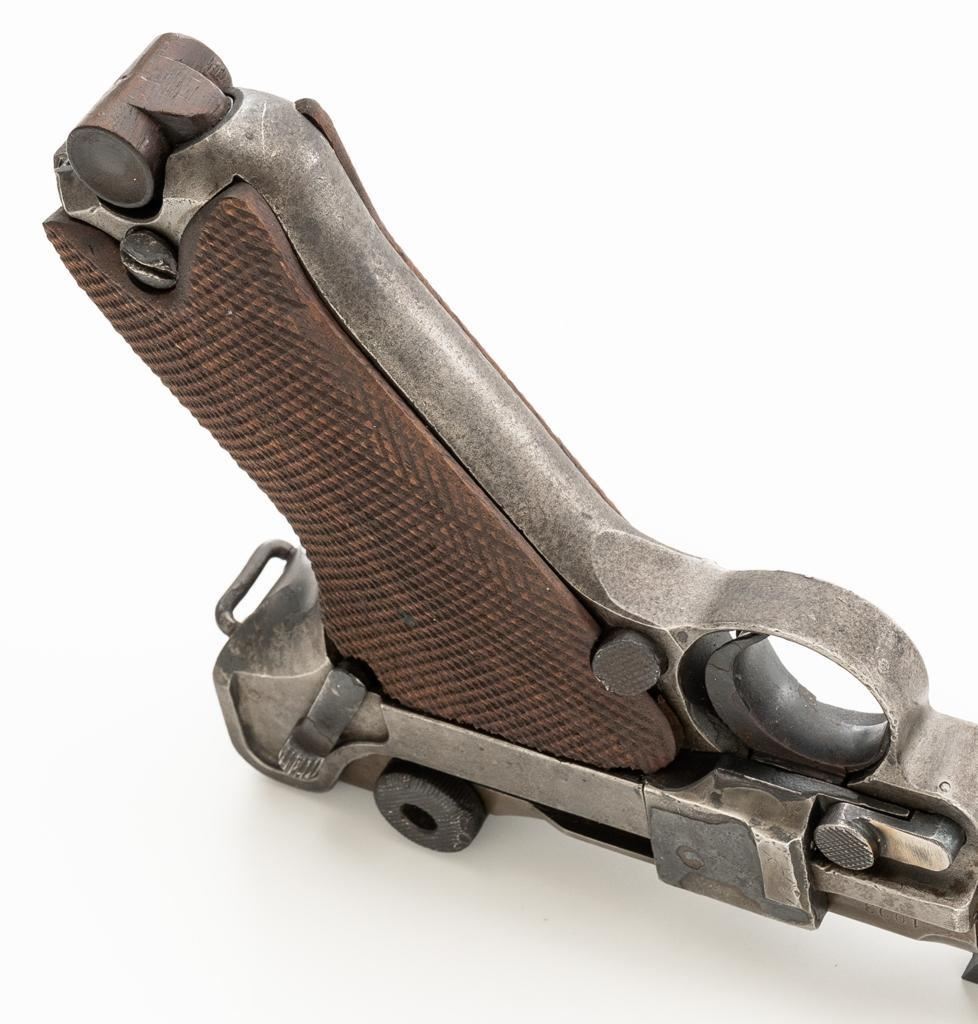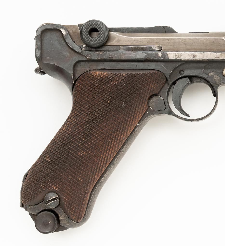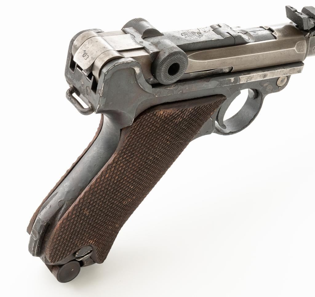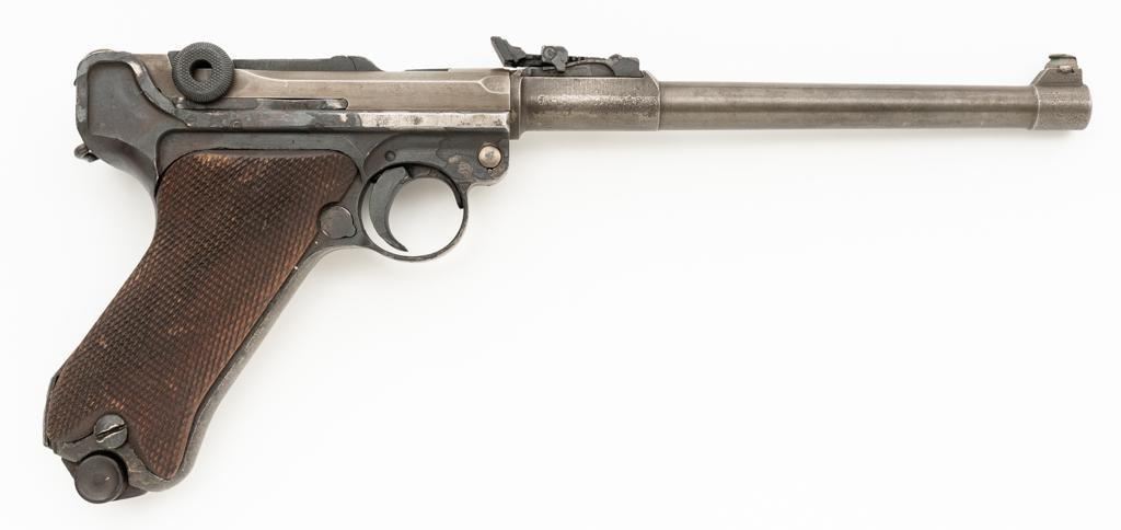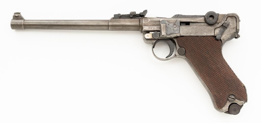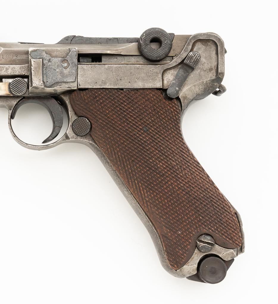 DWM 1917 Dated Artillery Model Luger Semi-Automatic Pistol, #1003L, 9mm cal., 8'' barrel, blued finish, checkered walnut grips, replacement bead front sight, and adjustable tangent rear sight with ''V''-notch, graduated to 800 meters. Blued magazine is a modern replacement with a plastic follower and a hardwood base. Toggle link is marked ''DWM'' and the top of the chamber is faintly marked ''1917''. Visible matching numbers. No visible import marks. Condition overall is fair. Finish has been partially cleaned from the metal, with remaining finish present on both sides of the frame. The cleaned areas on the barrel and receiver have now toned darker. Grips are modern replacements and are in very good condition, with a few areas of flattening to the checkering on the right side. Action cycles but the action and safety both need repair. Bore is dark with pitting and worn rifling. Est.: $600-$800. (C&R)
