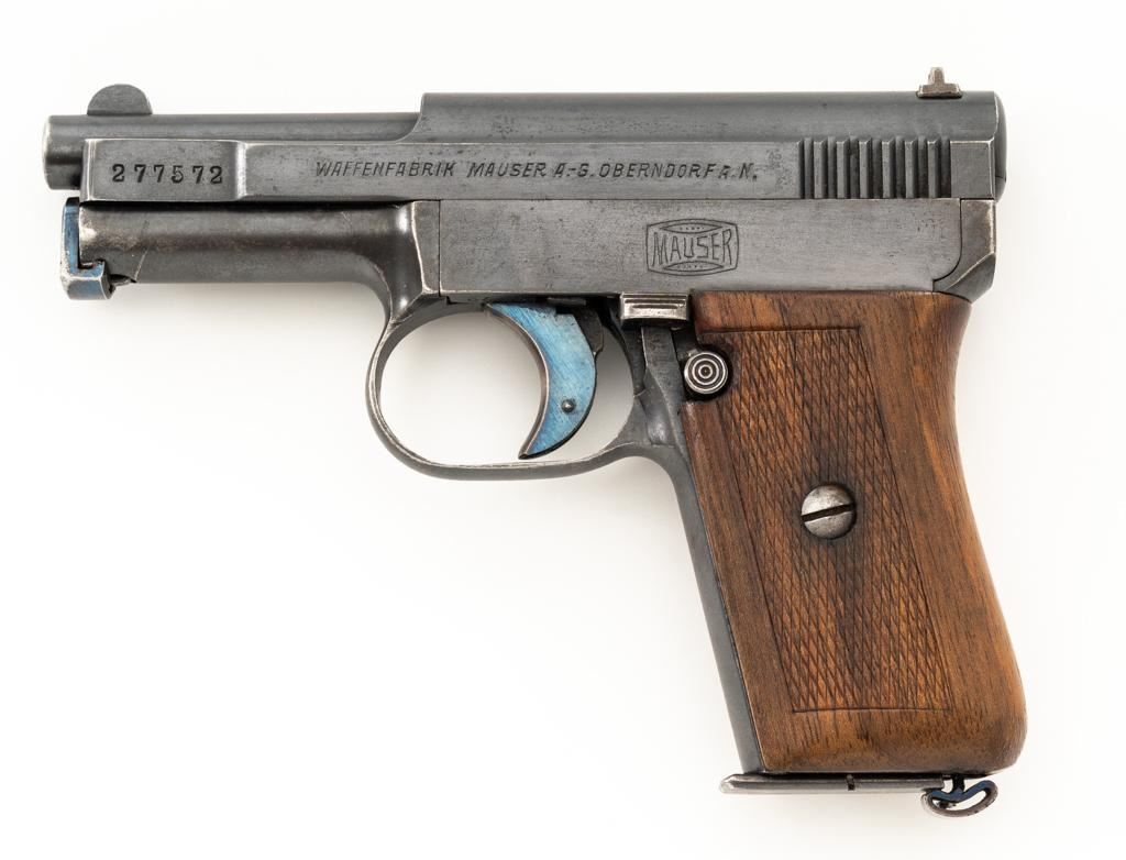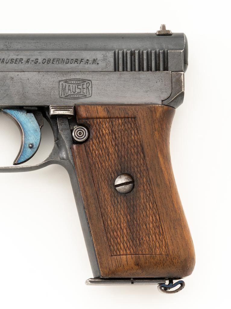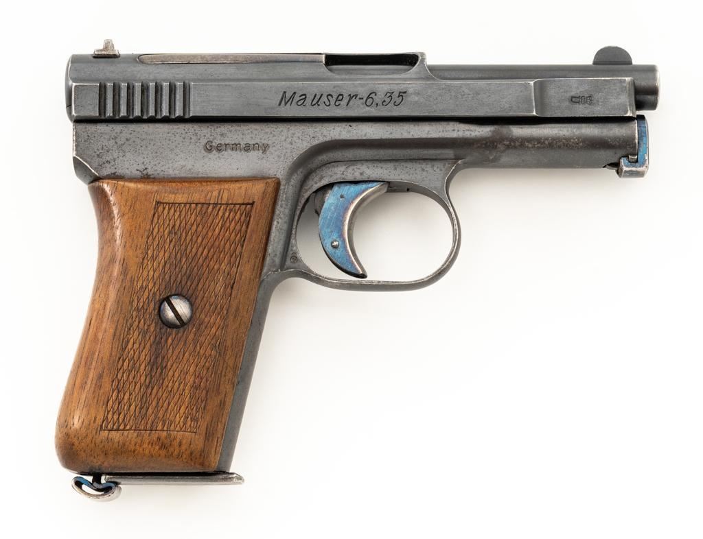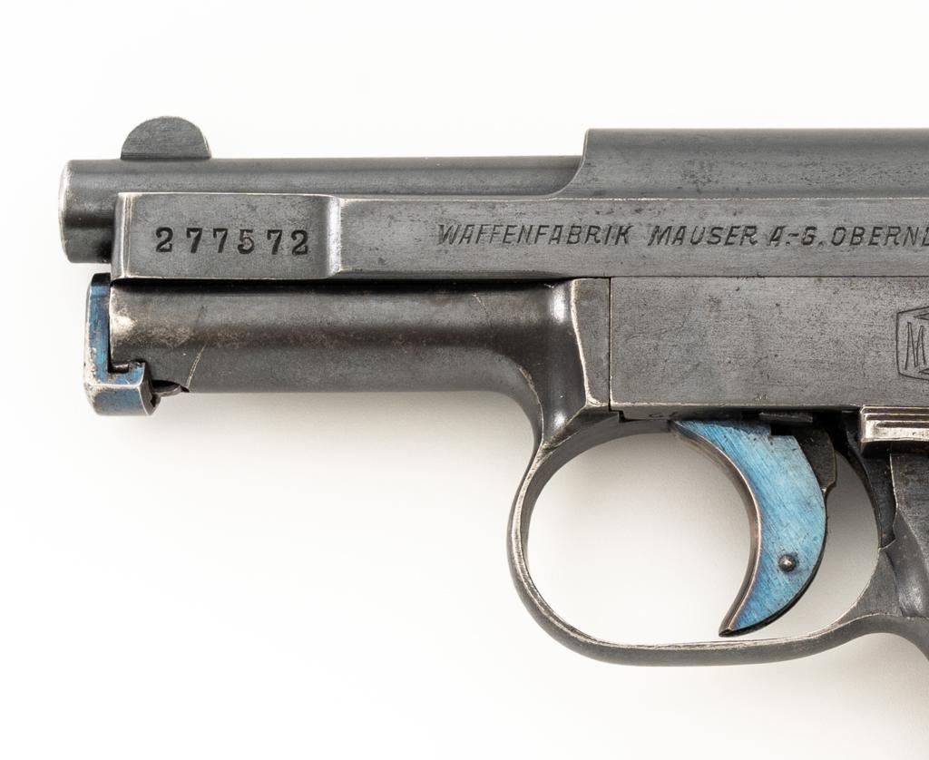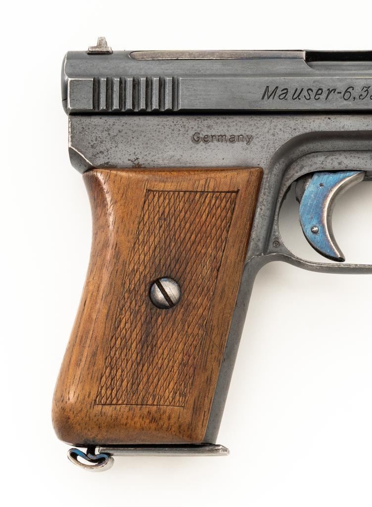 Mauser Model 1910 Semi-Automatic Pistol, #277572, .25 ACP cal., 3.1'' barrel, blued finish, checkered hardwood one-piece grip, blade front sight and fixed rear sight with ''V''-notch. Includes on unmarked magazine with bright steel body and blued floor plate. Pistol is marked ''WAFFENFABRIK MAUSER A.-G.OBERNDORF A.N.'' on left side of the slide and ''Mauser-6,35'' with a ''(Crown)U'' proof stamp on the right side. There is a Mauser logo on left side of the frame. Right side of the frame is marked ''GERMANY''. Condition overall is very good, retaining approx. 85% blue, showing brown toning with patina spots and frosting to the right side of the frame. Grip with an even color and a couple of handling marks, mainly to the back and right side. Action operates smoothly. Bore is bright with well-defined rifling. Magazine shows moderate age and wear, with some patina to the body. Est.: $300-$500. (C&R/PPT)