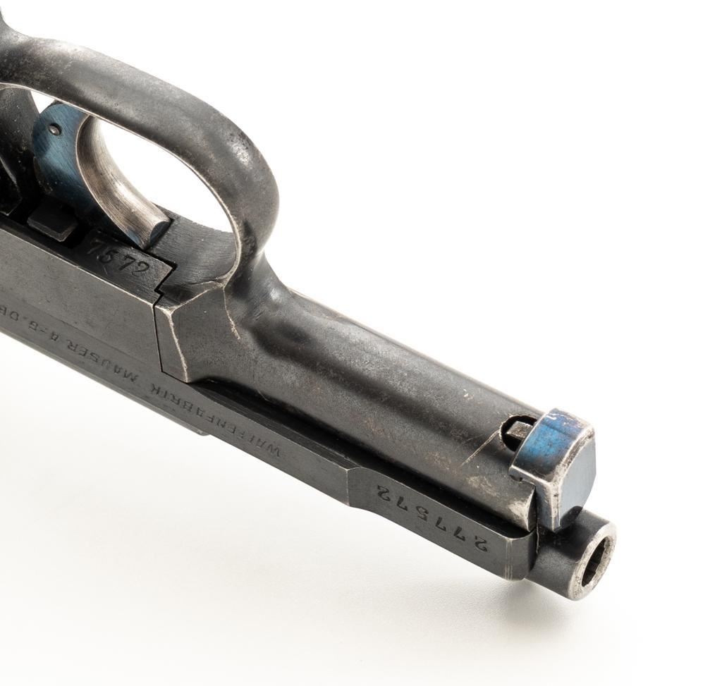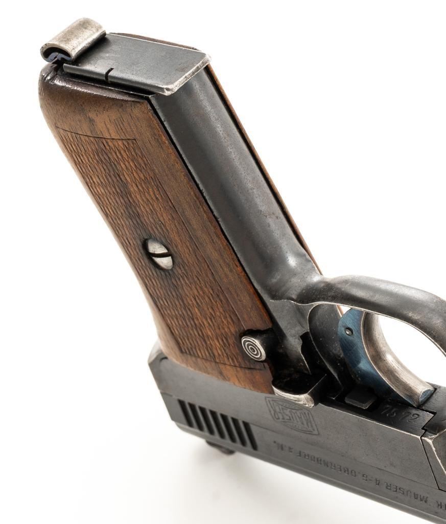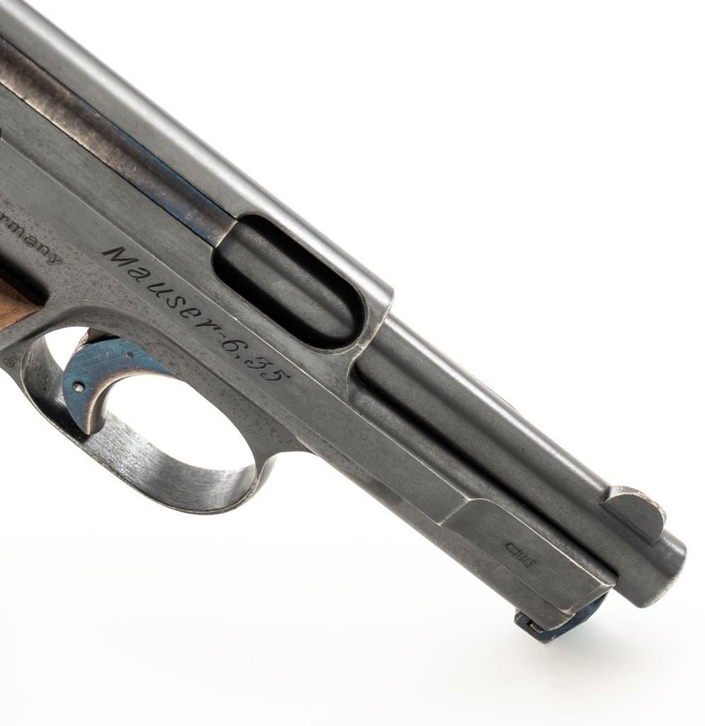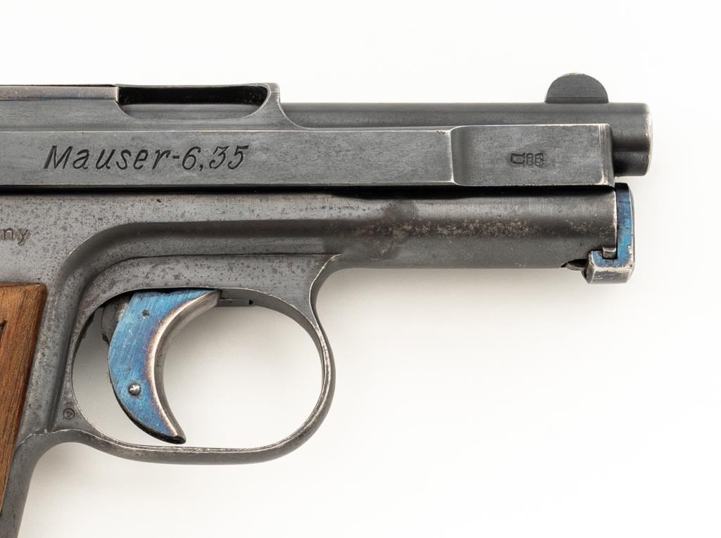 Mauser Model 1910 Semi-Automatic Pistol, #277572, .25 ACP cal., 3.1'' barrel, blued finish, checkered hardwood one-piece grip, blade front sight and fixed rear sight with ''V''-notch. Includes on unmarked magazine with bright steel body and blued floor plate. Pistol is marked ''WAFFENFABRIK MAUSER A.-G.OBERNDORF A.N.'' on left side of the slide and ''Mauser-6,35'' with a ''(Crown)U'' proof stamp on the right side. There is a Mauser logo on left side of the frame. Right side of the frame is marked ''GERMANY''. Condition overall is very good, retaining approx. 85% blue, showing brown toning with patina spots and frosting to the right side of the frame. Grip with an even color and a couple of handling marks, mainly to the back and right side. Action operates smoothly. Bore is bright with well-defined rifling. Magazine shows moderate age and wear, with some patina to the body. Est.: $300-$500. (C&R/PPT)