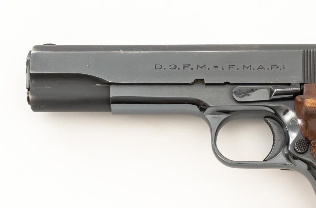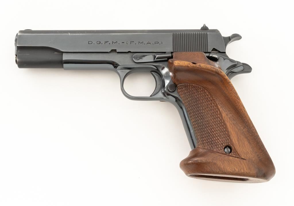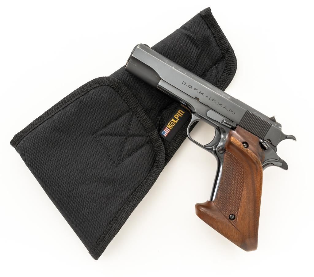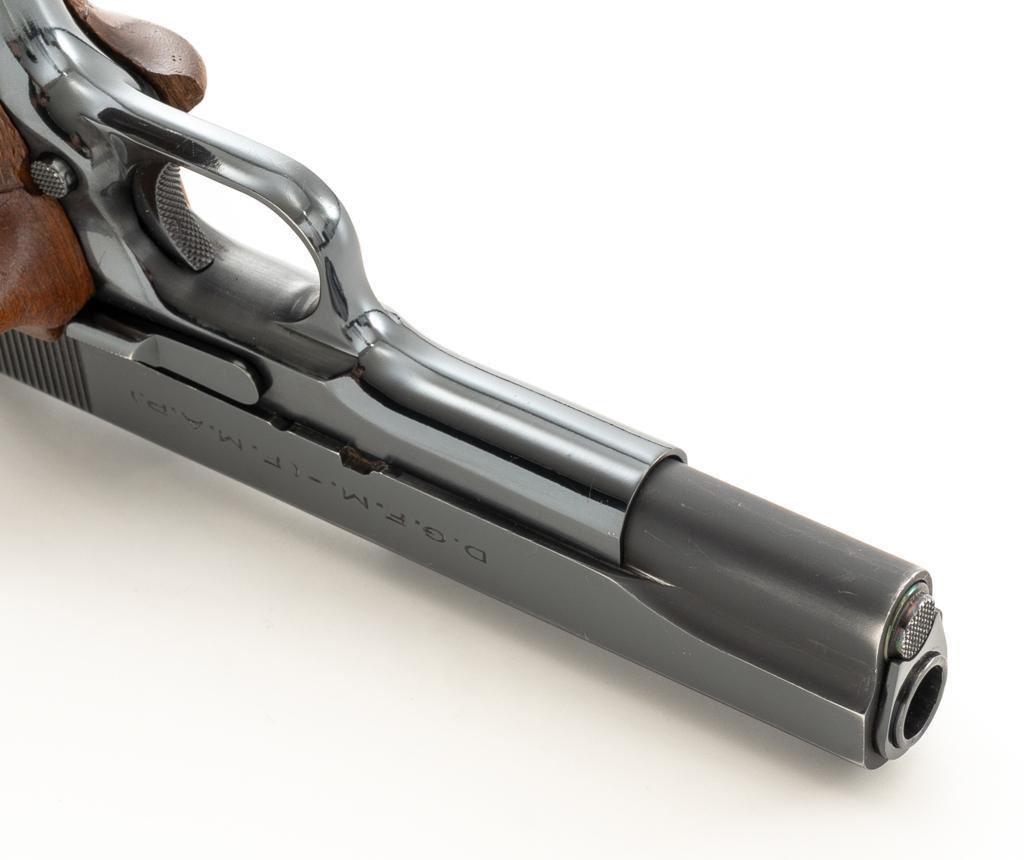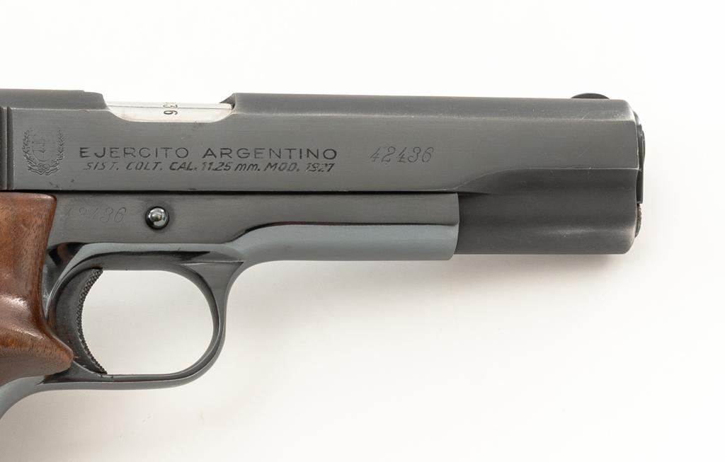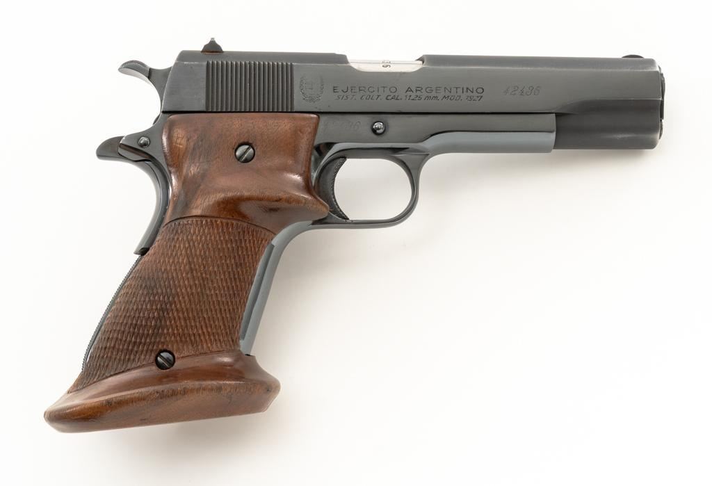 Sistema Colt Argentine Model 1927 Semi-Automatic 1911 Pistol, #42436, .45 ACP cal., 5'' barrel, blue finish, checkered walnut two-piece oversize right hand target grips, blade front and drift adjustable ''U''-notch rear sight, with one 7-round blue steel magazine with non-matching serial number. Pistol features a replacement recoil spring. No visible import marks. Matching visible serial numbers. Marked ''D.G.F.M.-(F.M.A.P.)'' on the left side of the slide. Includes a right handed Kolpin nylon flap holster; in excellent condition. Pistol is in fine overall condition as arsenal refinished, retaining approx. 96%-97% toning finish, with holster wear at the muzzle and along the slide. Markings are slightly soft, with the Argentine crest partially polished off. Grips with sharp checkering. Action functions well and locks up securely. Bore is very good with well-defined rifling. Est.: $600-$800. (C&R/PPT)