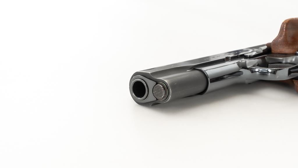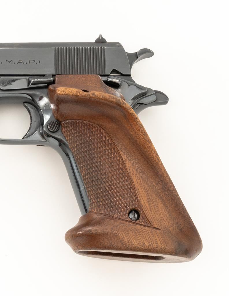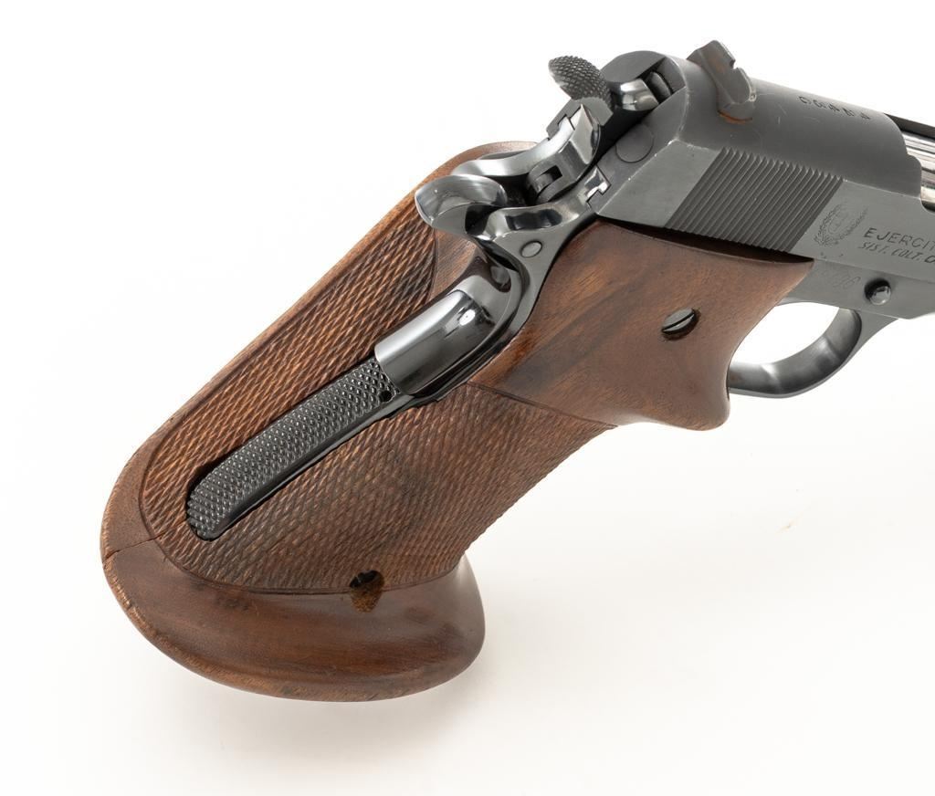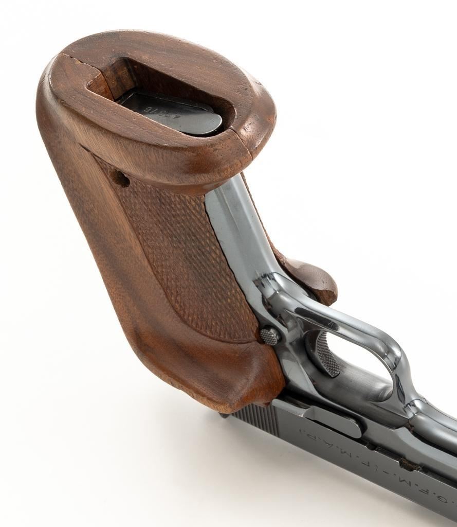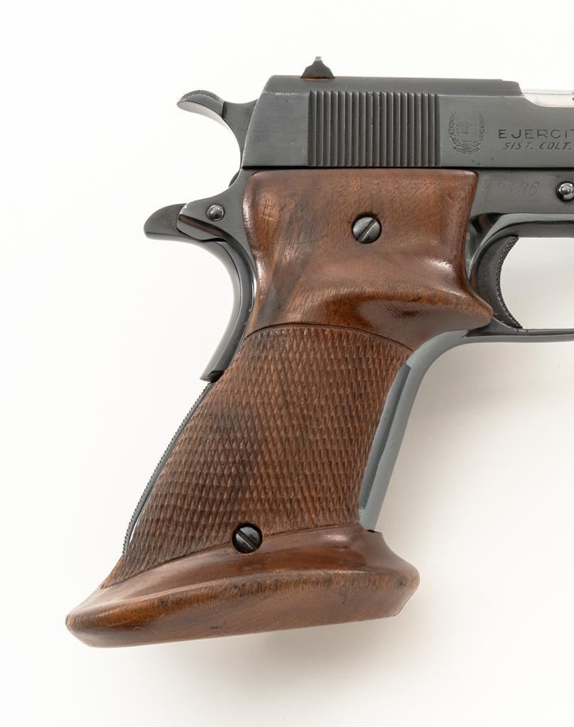 Sistema Colt Argentine Model 1927 Semi-Automatic 1911 Pistol, #42436, .45 ACP cal., 5'' barrel, blue finish, checkered walnut two-piece oversize right hand target grips, blade front and drift adjustable ''U''-notch rear sight, with one 7-round blue steel magazine with non-matching serial number. Pistol features a replacement recoil spring. No visible import marks. Matching visible serial numbers. Marked ''D.G.F.M.-(F.M.A.P.)'' on the left side of the slide. Includes a right handed Kolpin nylon flap holster; in excellent condition. Pistol is in fine overall condition as arsenal refinished, retaining approx. 96%-97% toning finish, with holster wear at the muzzle and along the slide. Markings are slightly soft, with the Argentine crest partially polished off. Grips with sharp checkering. Action functions well and locks up securely. Bore is very good with well-defined rifling. Est.: $600-$800. (C&R/PPT)