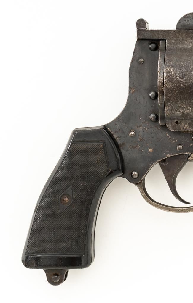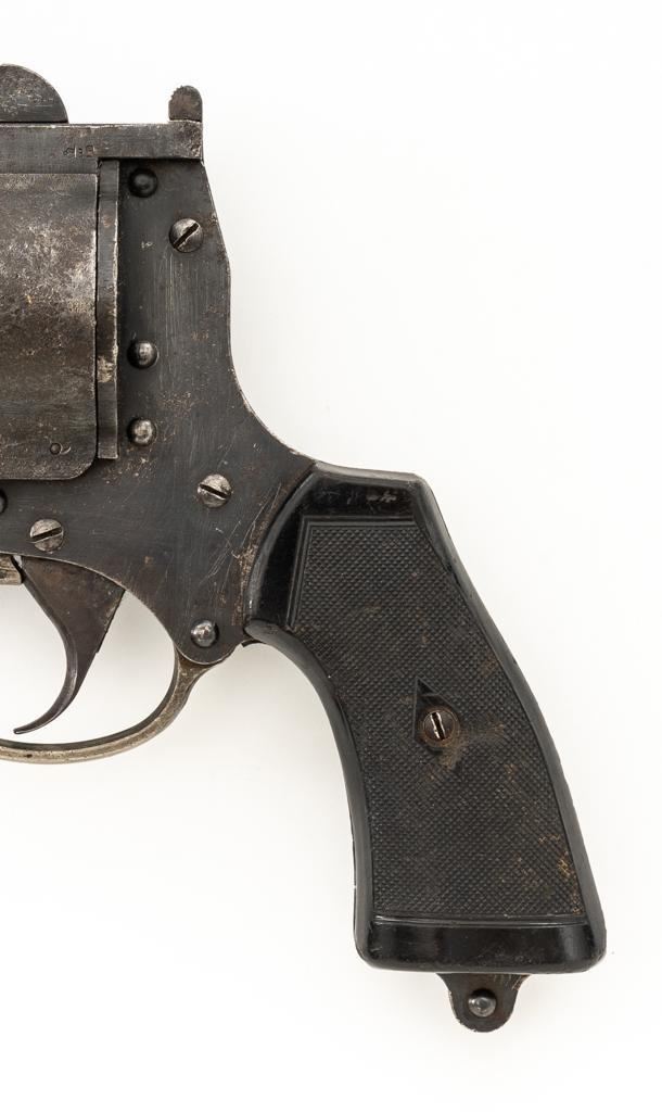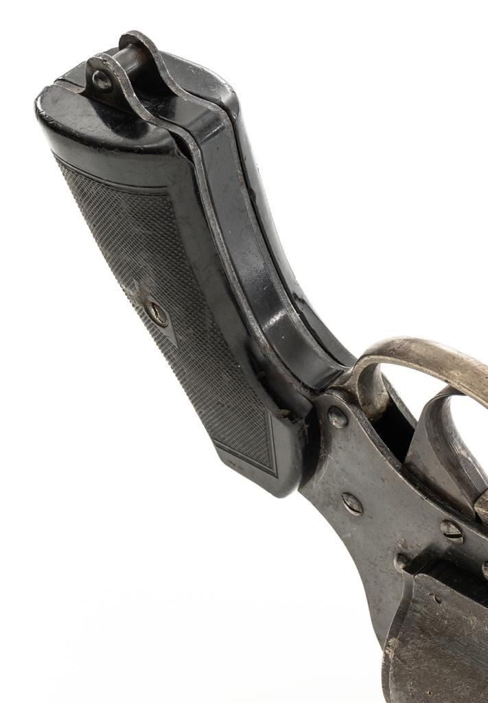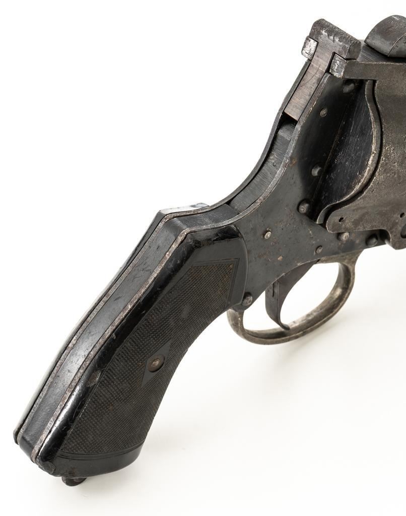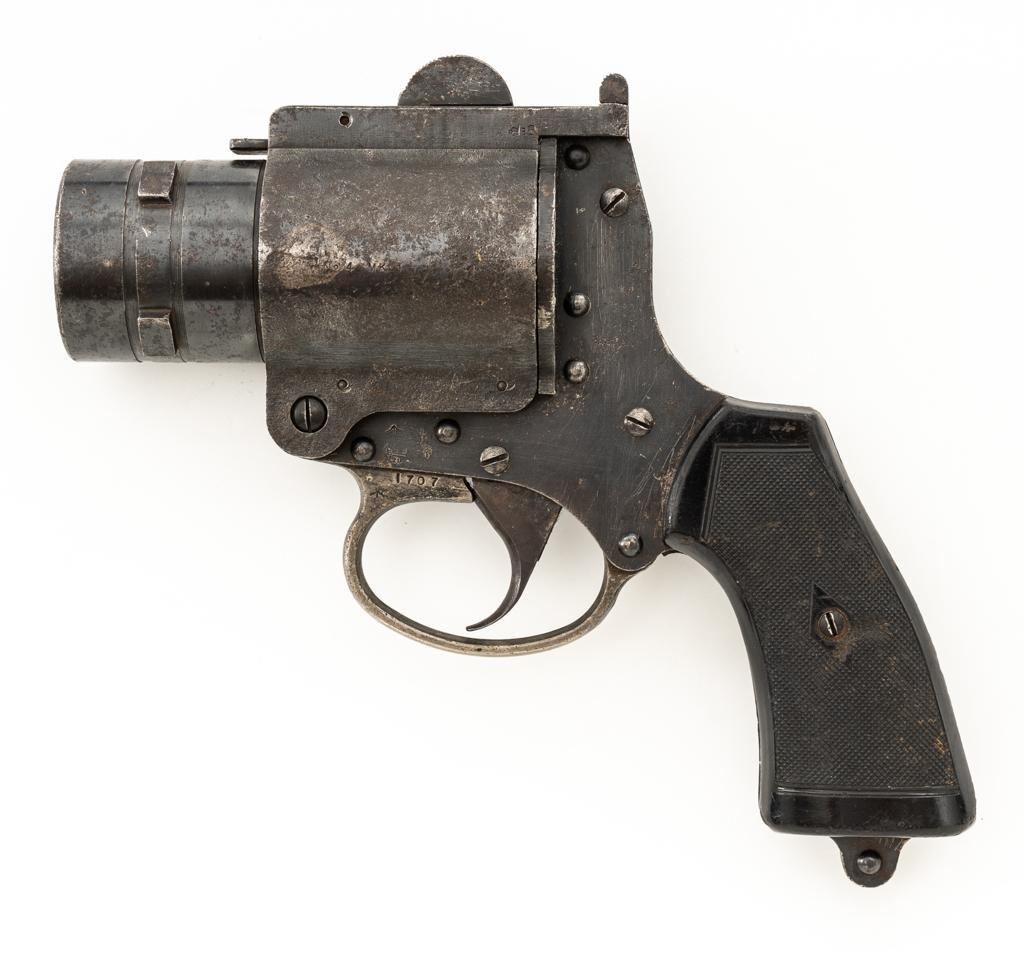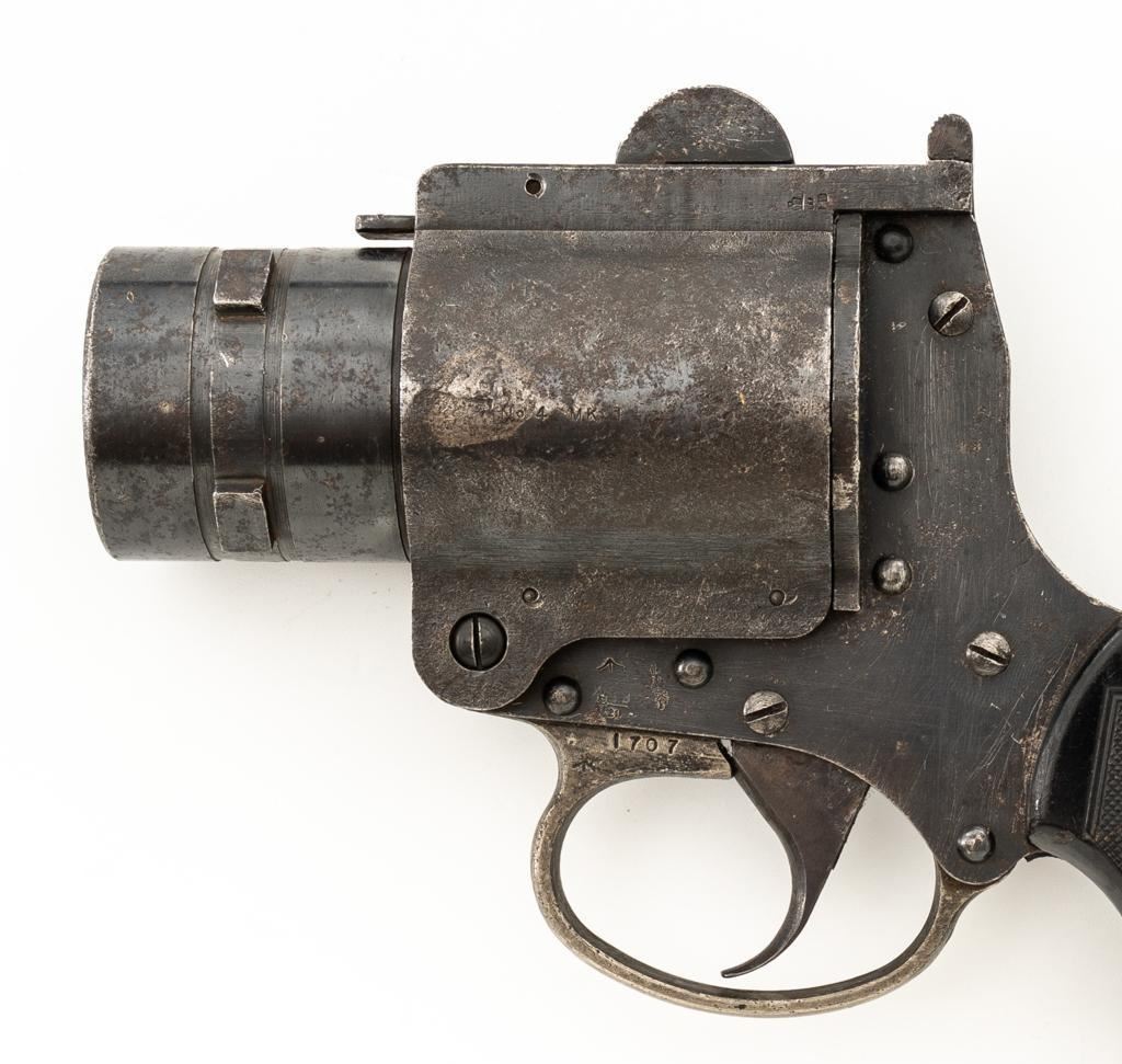 British No.4 MK 1 Single Shot Flare Pistol, #1707, 1.5'' bore, 4.1'' smoothbore barrel, blued finish, checkered black plastic grips, no sights. Marked ''No 4 MK1'' on left side of the barrel and stamped with a ''(Broad Arrow)''/M.I.D./18/MMC2/44'' on the top. There is a ''(Broad Arrow)'' and crowned proof stamps on left side of the frame. Condition overall is good, with areas of patina to the barrel and frame, and wear to the trigger guard. Grips showing handling marks and flattening to the checkering, as well as a few small chips missing from the lower right side. Action operates smoothly. Bore rates very good with areas of old patina visible, otherwise bright. Est.: $150-$250.