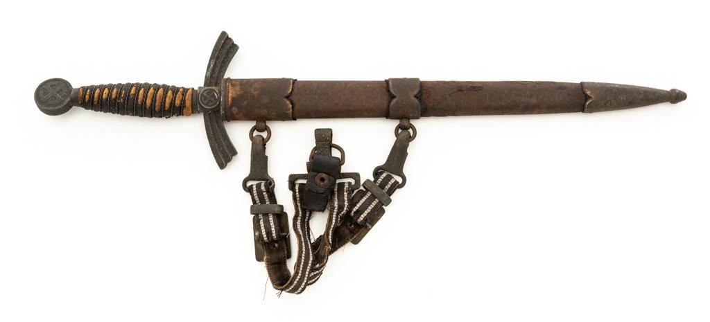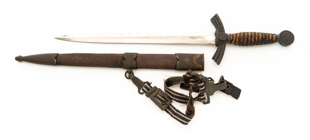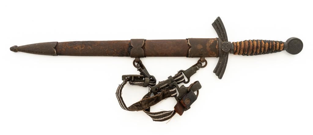 German First Model Luftwaffe Dress Dagger with Scabbard, 12.25'' blade with raised flattened center, 17.75'' OAL, aluminum pommel and crossguard with down swept wings have swastikas in the center and the wooden grip is covered with Moroccan leather wrapped with two strand wire. The blade is etched ''Fridericus'' over a stamped ''Solingen''. Blade condition is very good, retaining its original factory cross grain, now showing intermittent dark spots and scratches. The blade is slightly bent and there are small impact marks to one side. Guard and pommel are in fair condition, now a dark color with a rough texture. Handle is in poor condition and retains only traces of its blue leather. Wire remains tightly in place. Scabbard is in poor condition showing only remnants of its blue leather, now with rust and corrosion. Hanger is in fair condition with fraying to the silver thread. Belt hanger is torn off and missing. Est.: $300-$500.