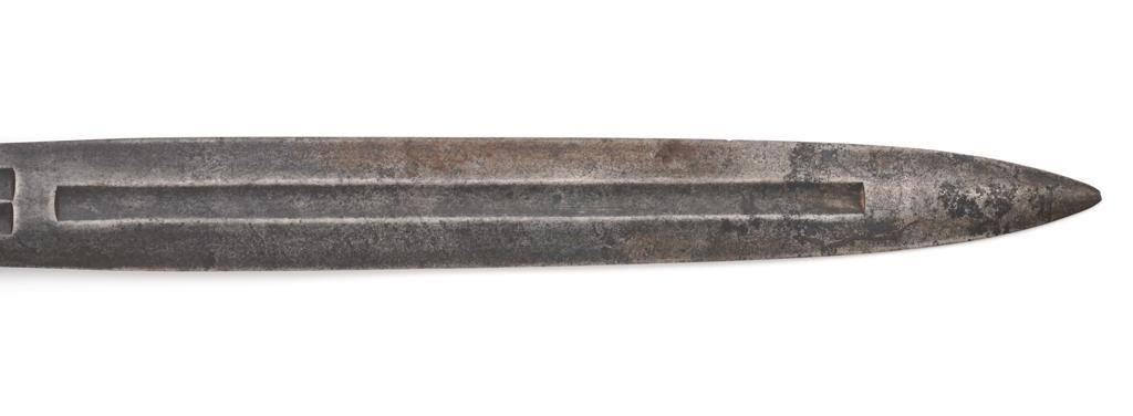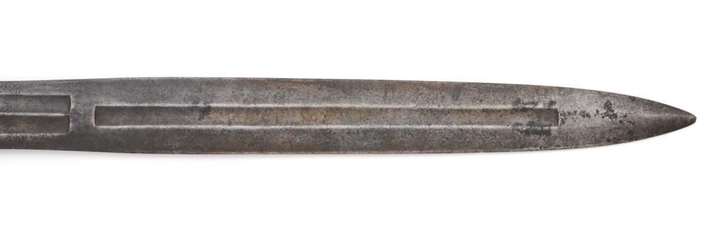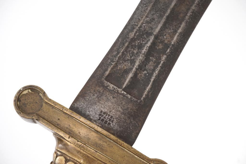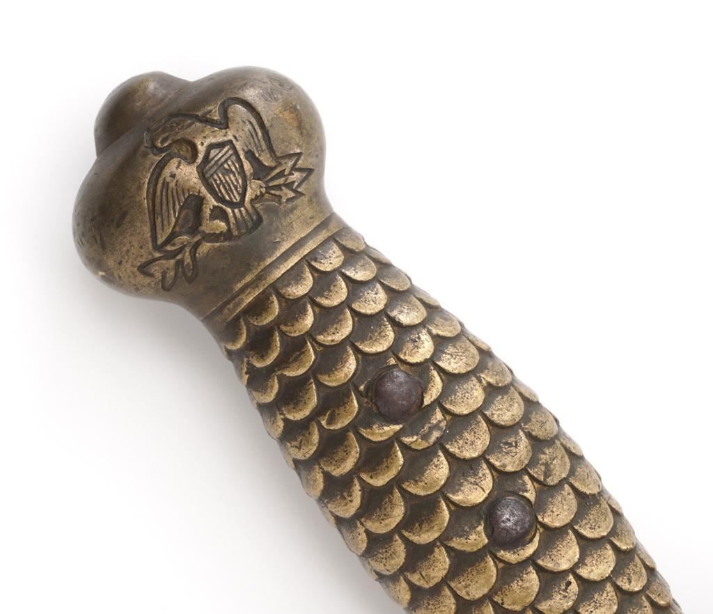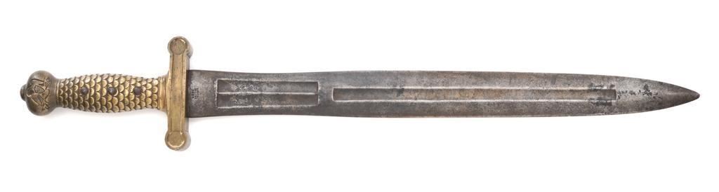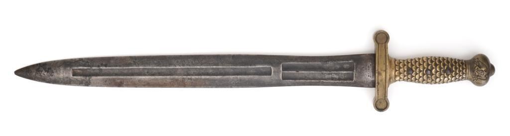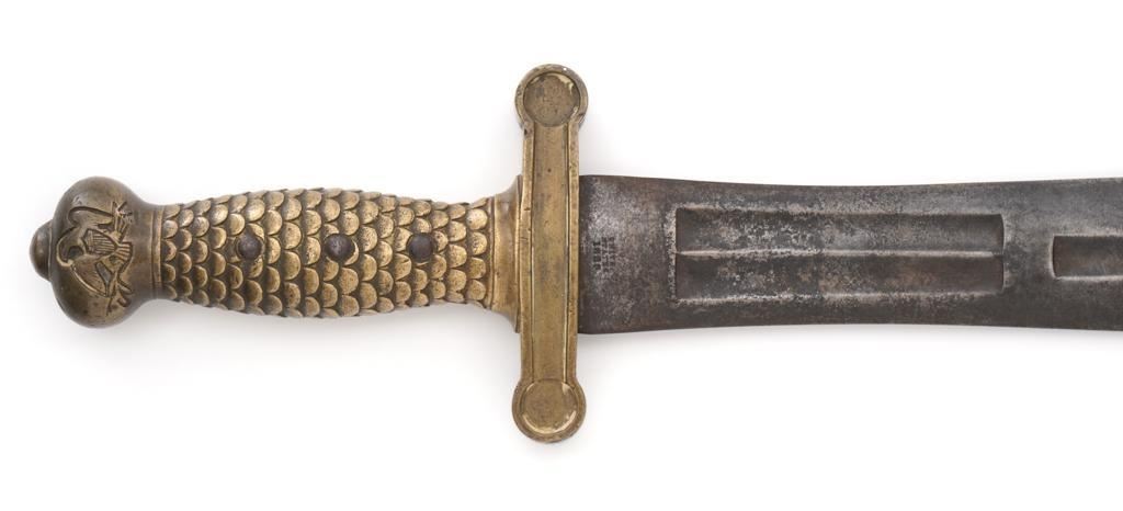 U.S. M1833 Artillery Sword, no scabbard, 19'' double edged blade with multiple fullers, 25'' OAL. Blade is marked ''UNITED STATES/1836'' and ''N.P.AMES''. Top of the guard is marked ''HKC'', ''ORD'', and ''LS''. Brass grip with fish scale pattern and an eagle on both sides at the pommel. Condition is good, blade with general darkening and areas of light erosion/pitting; point is rounded. Brass shows moderate toning and handling marks. Est.: $300-$500.