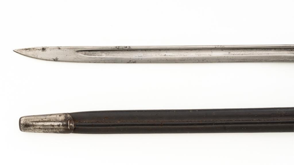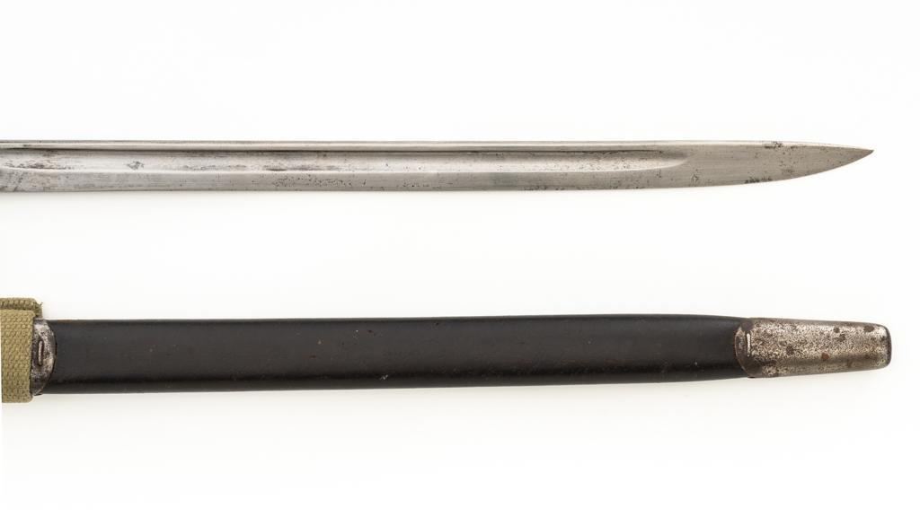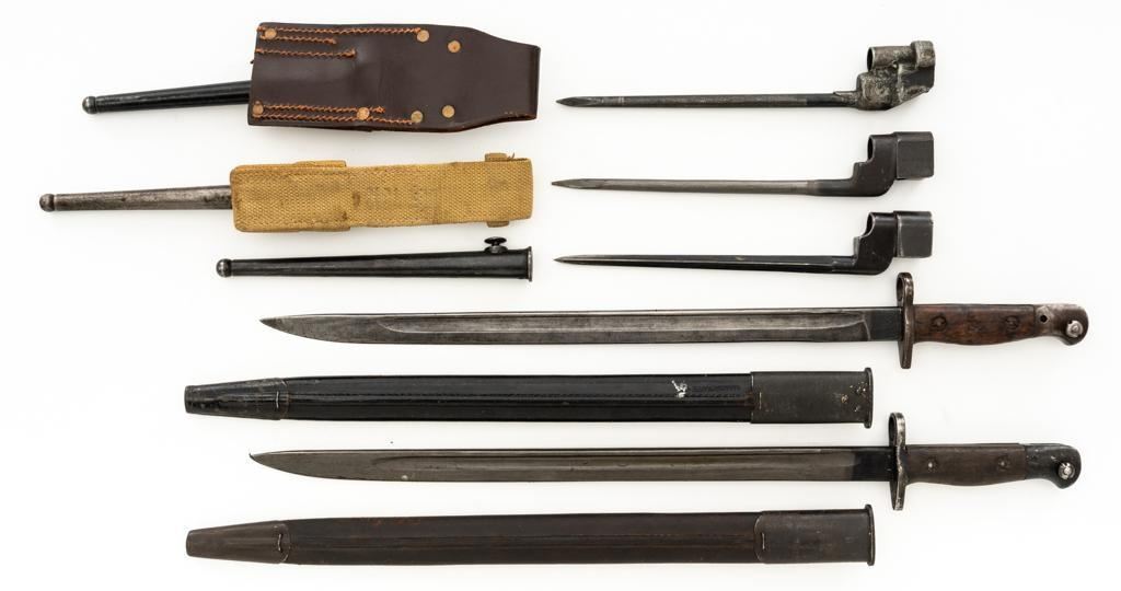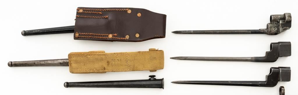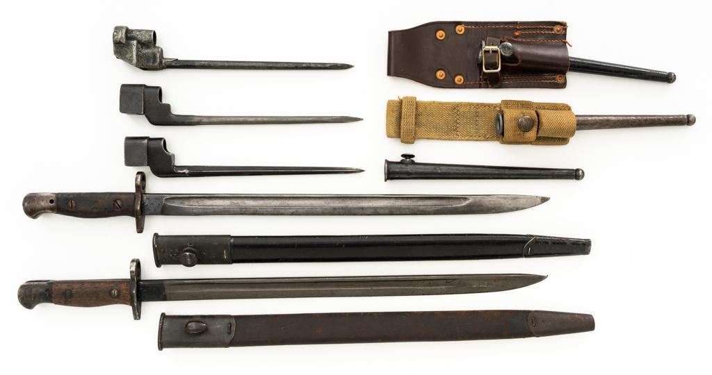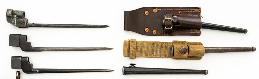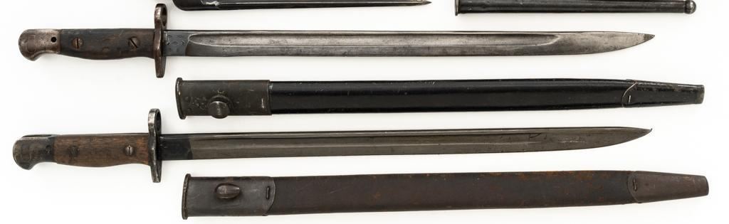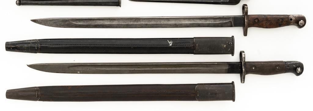 Lot of Five (5) British Bayonets and Scabbards: 1.) Early British No.4 Mk 1 Cruciform Blade Bayonet and Scabbard, 8'' four sided cruciform blade and socket, forged as one unit, blued finish. Made by Singer Manufacturing Co. and marked ''G(Crown)R/No 4 MK I/S.M.''.''U.S.2'' on the socket and the replaced release latch is marked with a Stevens/Savage ''(Block)S''. Condition is fine, showing light wear to the bluing, and small nicks to the edges of the blade. Latch operates smoothly. Steel scabbard is in good condition, with scratches and patina to the tube. This early design was later replaced by the Mark II with a round blade to simplify production. 2.) Pattern 1907 marked ''MOLE'' and ''7 18''. Condition is good, the blade shows nicks and has been sharpened and polished. Body of the Australian scabbard has been painted black and is in good condition. 3.) Pattern 1907 marked ''WILKINSON'' and ''9 15''. Condition is very good with a dark phosphate blade, with no nicks, and good grips. Australian scabbard is good. 4.) No.4 Mk III marked ''M158''. Condition is good with most of the blackened finish removed. Brown leather frog is very good. 5.) Canadian No.4 Mk II marked ''No 4 MK II/LB''. Condition is very good. Scabbard and frog are in good condition. Est.: $400-$600/lot.