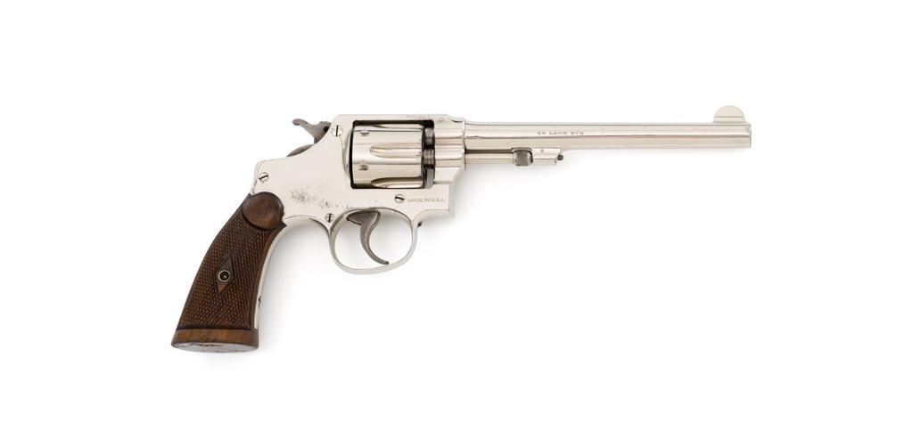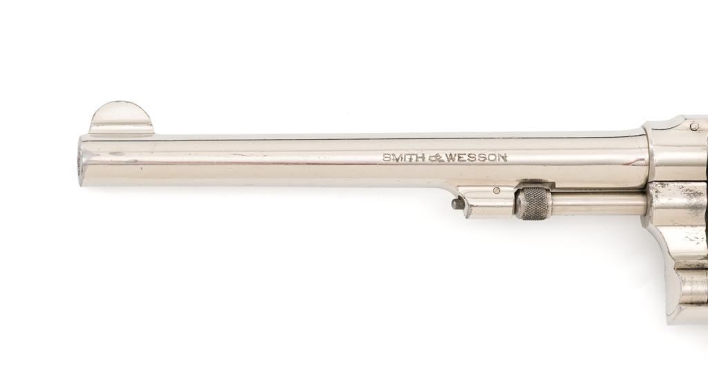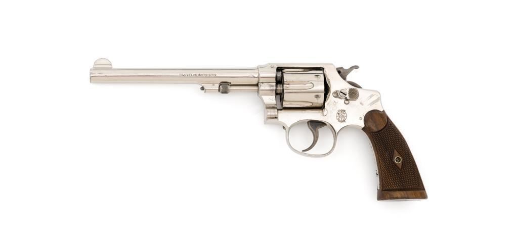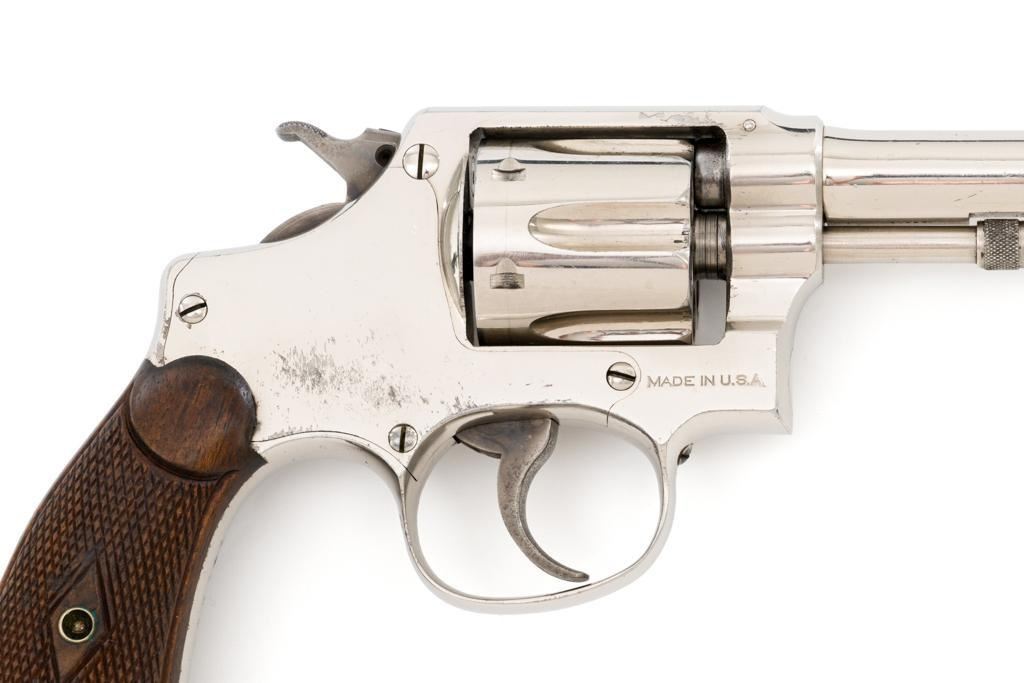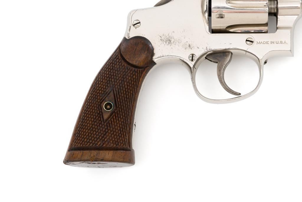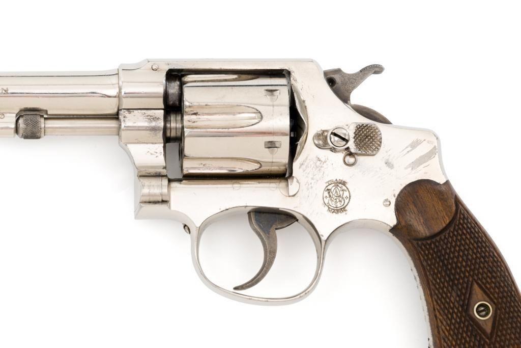 Pre-War Smith & Wesson .32 Regulation Police Double Action Revolver, #489141, .32 S&W Long cal., 6'' pinned barrel, nickel finish, case hardened hammer and trigger; factory checkered diamond center square-butt convex top non-medallion grips that numbered to the gun, with patent ''June 5, 1917'' on bottom of the left grip. Forged round blade front sight and standard square-notch rear sight. Matching numbers on front of grip, cylinder, and barrel flat. Condition is fine retaining approx. 92%-94% factory nickel finish with scattered light scratching, small area of cleaned pitting and flaking on the right top strap and left upper grip frame; cylinder has a light index line. There is cleaned pitting on the grips frame, hidden by the grips. Case colors on hammer and trigger have turned a dark gray patina. Action is smooth and locks up tight. Bore is bright with well-defined rifling. Est.: $500-$700 (C&R/PPT)