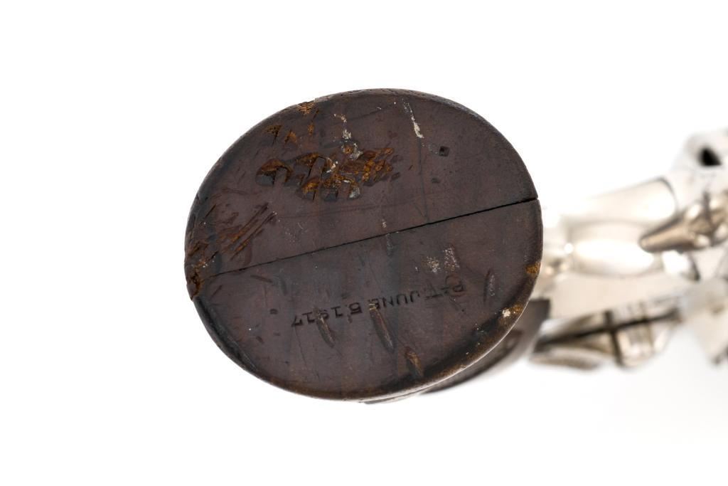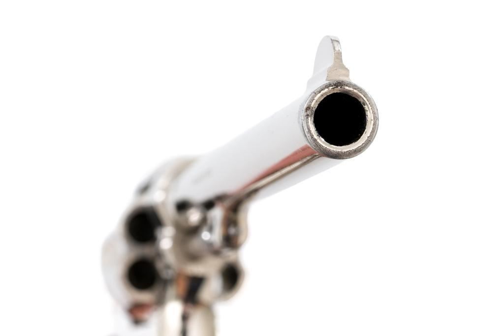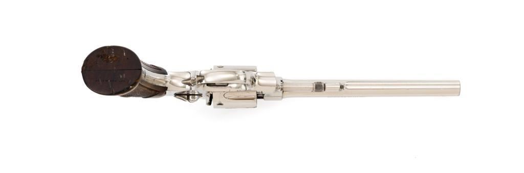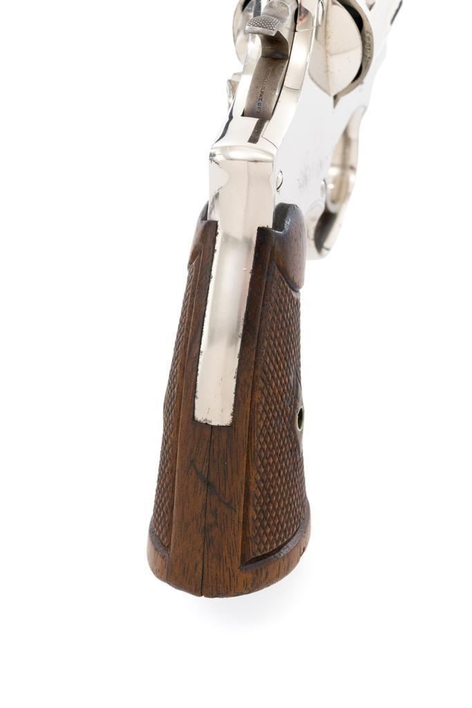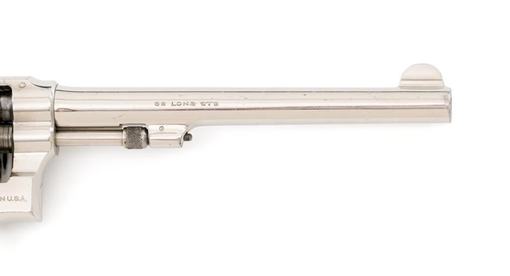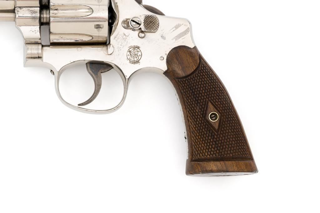 Pre-War Smith & Wesson .32 Regulation Police Double Action Revolver, #489141, .32 S&W Long cal., 6'' pinned barrel, nickel finish, case hardened hammer and trigger; factory checkered diamond center square-butt convex top non-medallion grips that numbered to the gun, with patent ''June 5, 1917'' on bottom of the left grip. Forged round blade front sight and standard square-notch rear sight. Matching numbers on front of grip, cylinder, and barrel flat. Condition is fine retaining approx. 92%-94% factory nickel finish with scattered light scratching, small area of cleaned pitting and flaking on the right top strap and left upper grip frame; cylinder has a light index line. There is cleaned pitting on the grips frame, hidden by the grips. Case colors on hammer and trigger have turned a dark gray patina. Action is smooth and locks up tight. Bore is bright with well-defined rifling. Est.: $500-$700 (C&R/PPT)