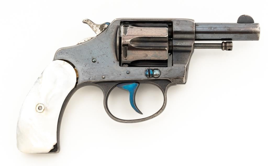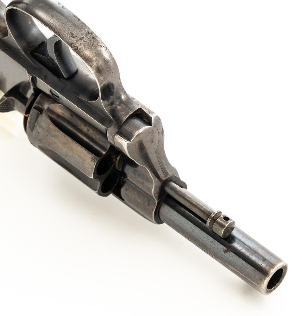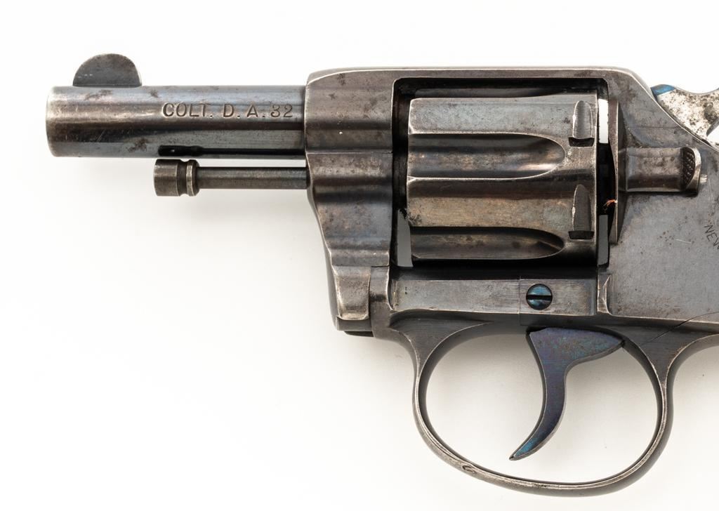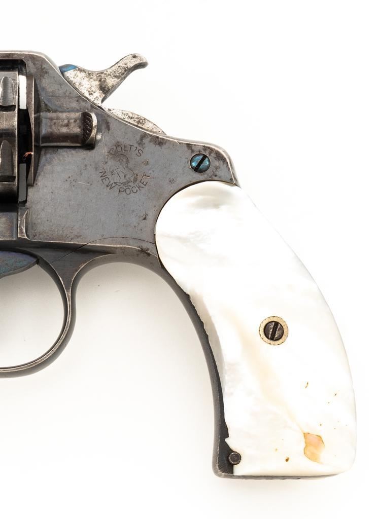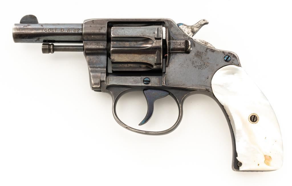 Colt New Pocket Double Action Revolver, #15318, .32 Colt cal., 2.5'' barrel, blue finish, smooth pearl two-piece grips, half-round blade front and fixed ''U''-notch rear sight. Trigger and backside of the hammer are fire blued. Factory markings are clear, with the crane and frame marked with assembly number ''224''. Mfg'd 1900. Revolver is in very good overall condition, retaining approx. 90%-92% thinning finish, with scattered spots of light corrosion, edgewear to the frame and cylinder, and thinning along the barrel. Fire blued finish is bright. Grips are in very good condition with edgewear, small chips at the bases, and slightly proud fit. Action functions well and locks up securely. Bore is good with visible rifling, areas of light frosting and erosion. Est.: $300-$500. (C&R)