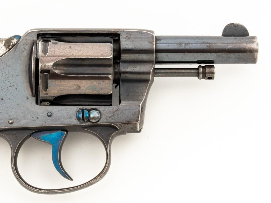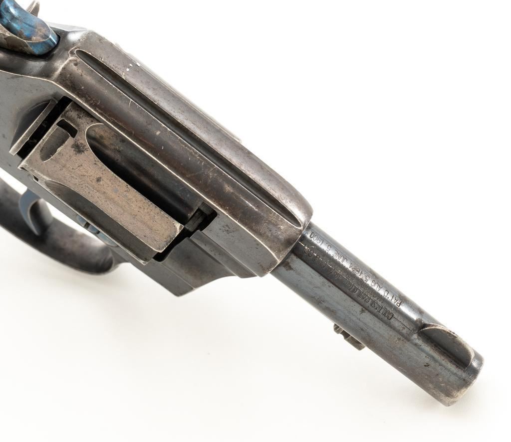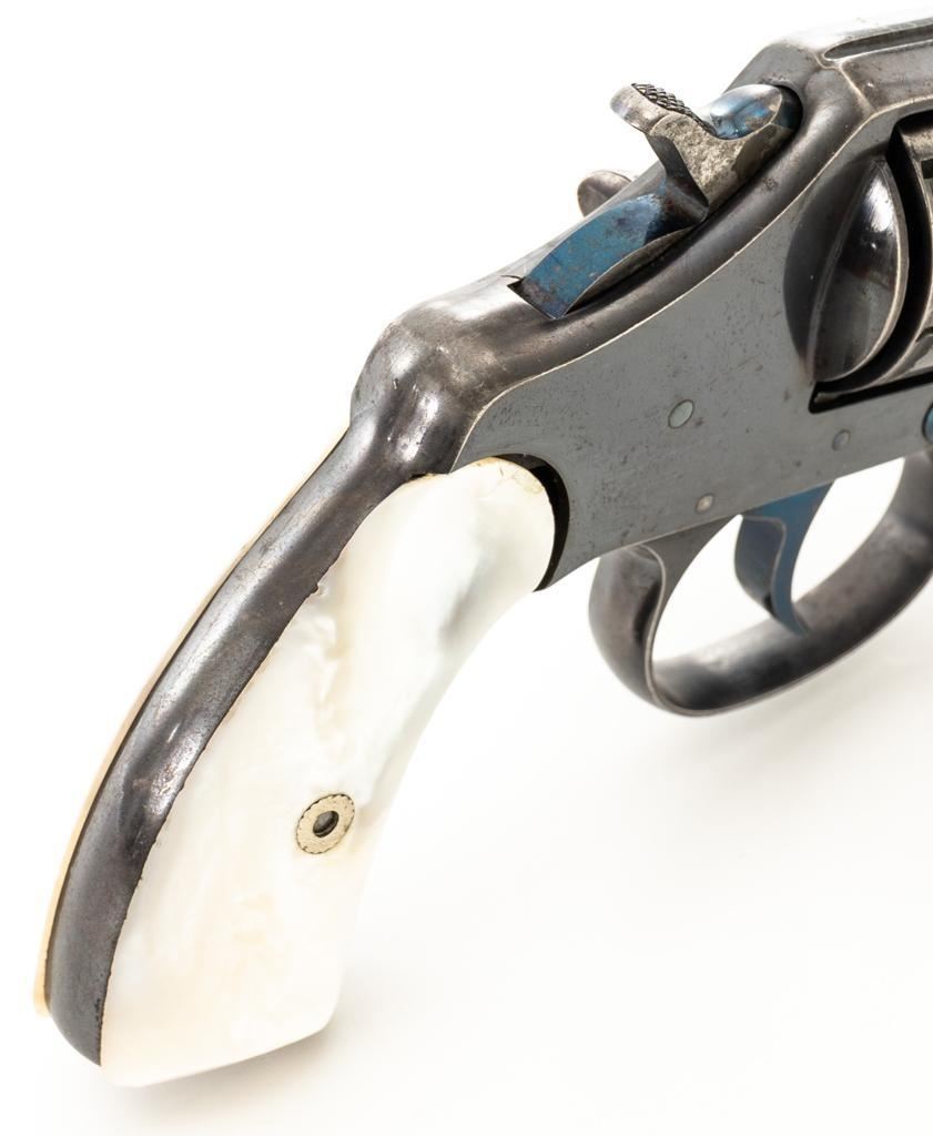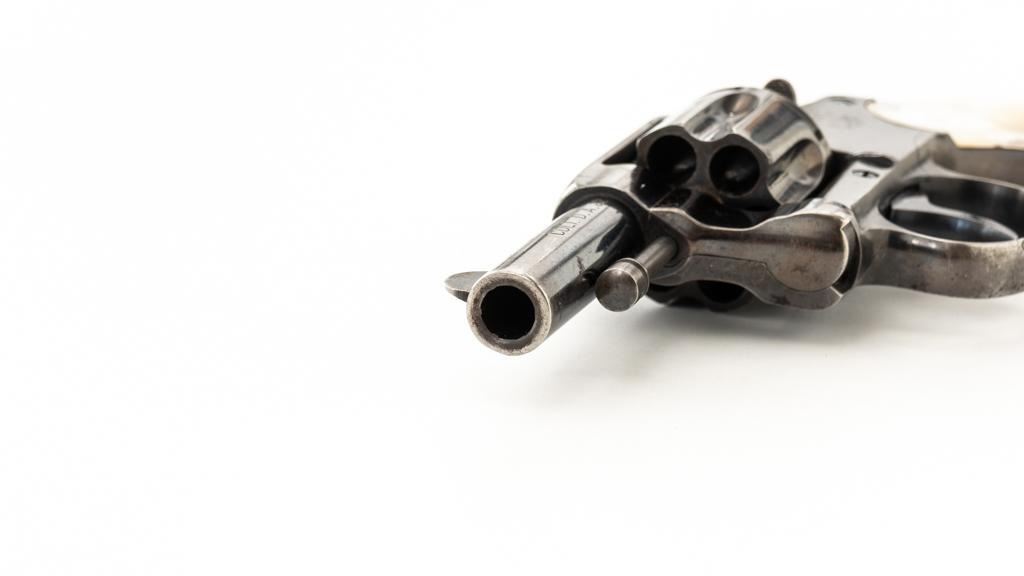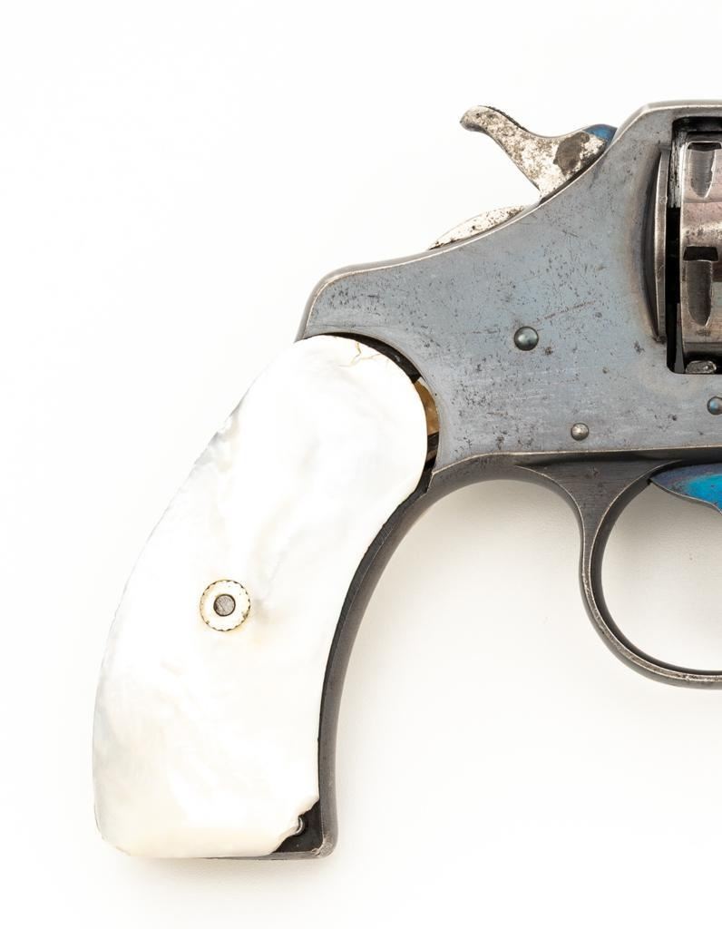 Colt New Pocket Double Action Revolver, #15318, .32 Colt cal., 2.5'' barrel, blue finish, smooth pearl two-piece grips, half-round blade front and fixed ''U''-notch rear sight. Trigger and backside of the hammer are fire blued. Factory markings are clear, with the crane and frame marked with assembly number ''224''. Mfg'd 1900. Revolver is in very good overall condition, retaining approx. 90%-92% thinning finish, with scattered spots of light corrosion, edgewear to the frame and cylinder, and thinning along the barrel. Fire blued finish is bright. Grips are in very good condition with edgewear, small chips at the bases, and slightly proud fit. Action functions well and locks up securely. Bore is good with visible rifling, areas of light frosting and erosion. Est.: $300-$500. (C&R)