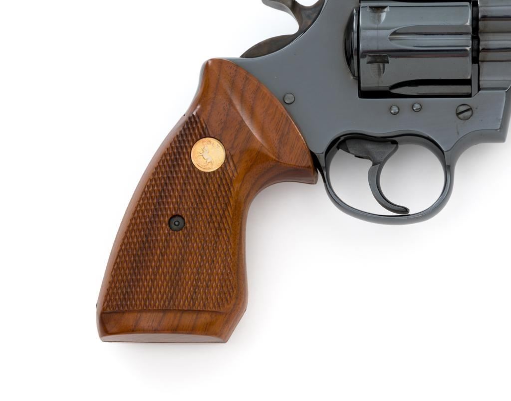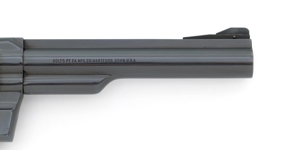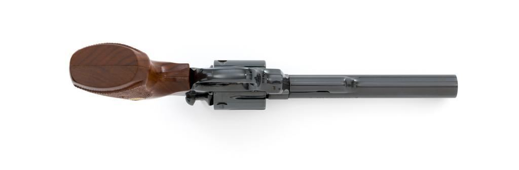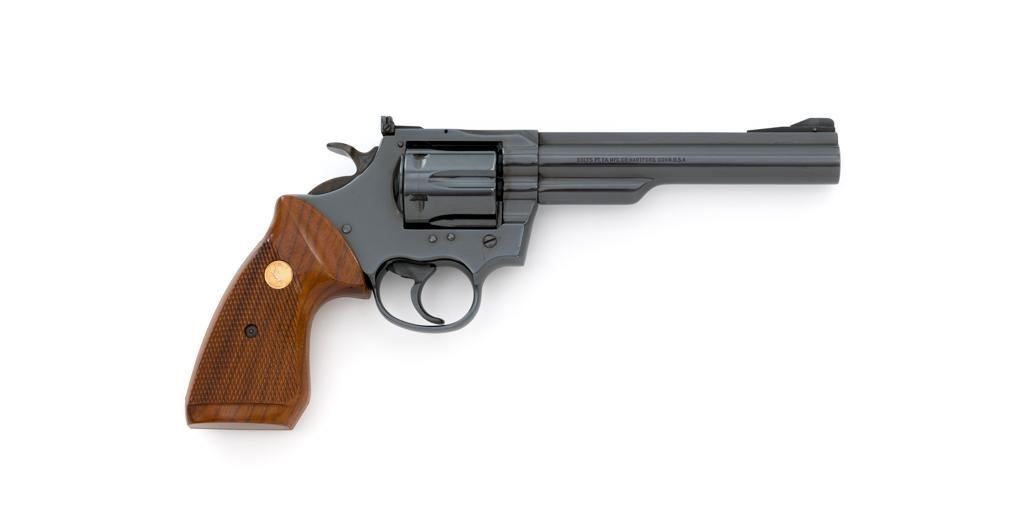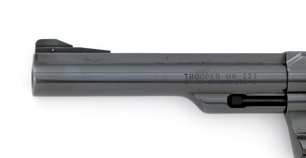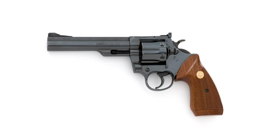 Colt Trooper MK III Double Action Revolver, #L99349, .357 Mag. cal., 6" barrel, blue finish, checkered walnut two-piece grips with Colt medallions, serrated ramped blade front and adjustable square-notch rear sight. Mfg'd 1978. Revolver is in excellent overall condition, retaining approx. 98%-99% factory finish. There are light handling marks and a small amount of thinning at the muzzle; cylinder has a faint index line. Grips with a few light handling marks. Action is smooth and locks up securely. Bore is bright with well-defined rifling. Est.: $700-$900. (Modern) (Not available to Calif. residents.)
