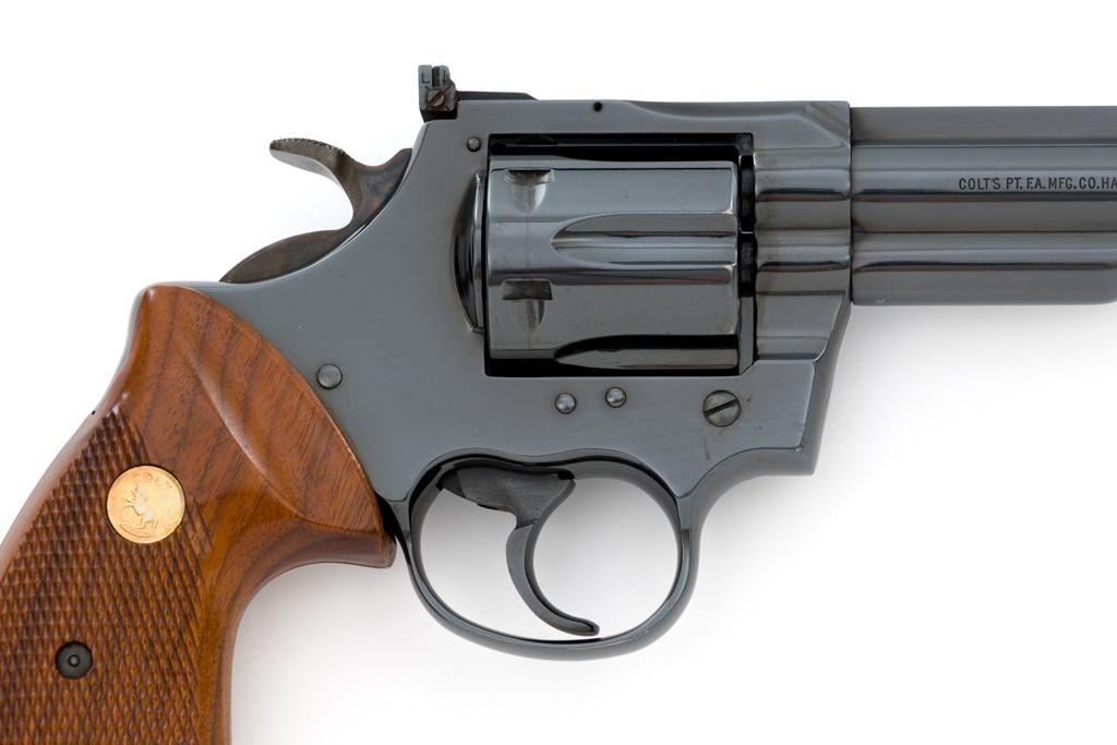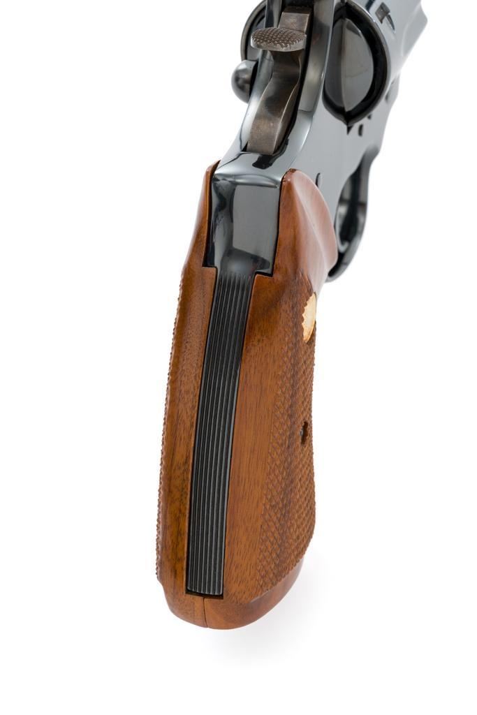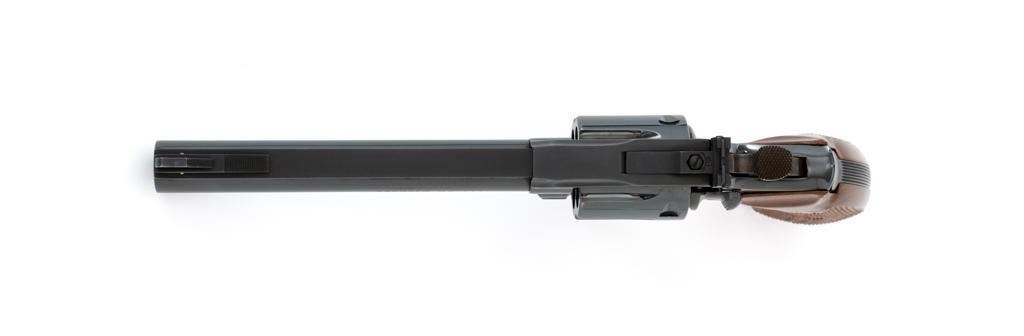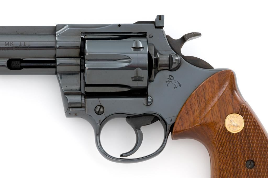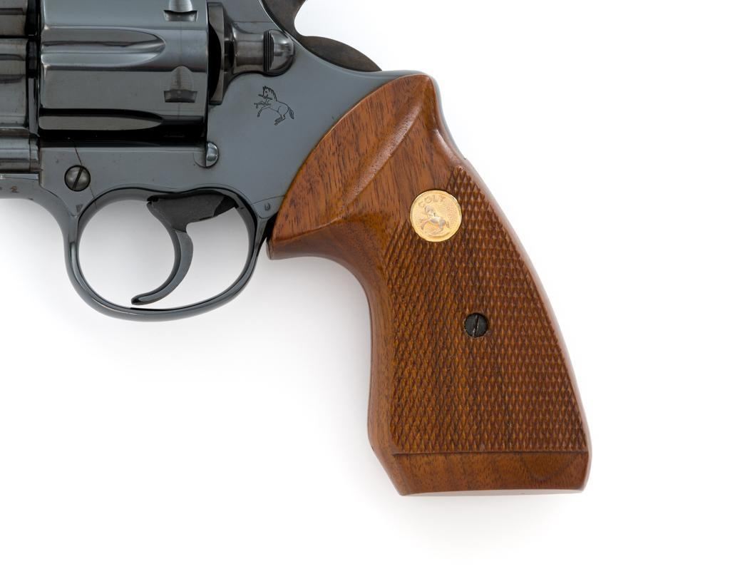 Colt Trooper MK III Double Action Revolver, #L99349, .357 Mag. cal., 6" barrel, blue finish, checkered walnut two-piece grips with Colt medallions, serrated ramped blade front and adjustable square-notch rear sight. Mfg'd 1978. Revolver is in excellent overall condition, retaining approx. 98%-99% factory finish. There are light handling marks and a small amount of thinning at the muzzle; cylinder has a faint index line. Grips with a few light handling marks. Action is smooth and locks up securely. Bore is bright with well-defined rifling. Est.: $700-$900. (Modern) (Not available to Calif. residents.)