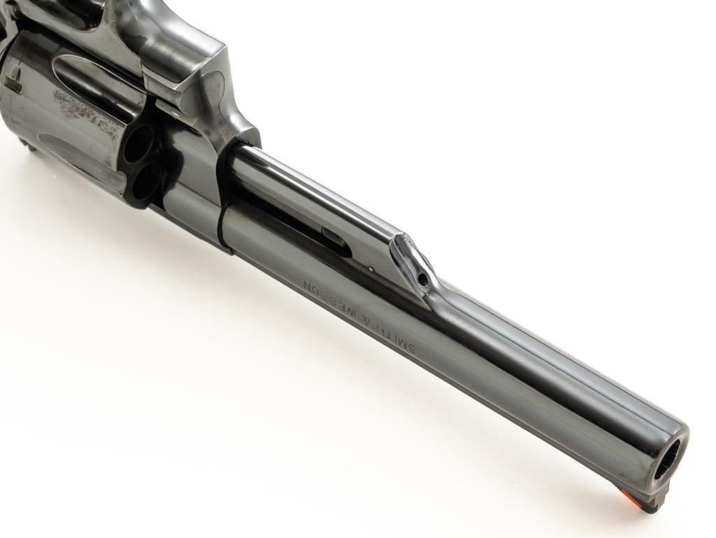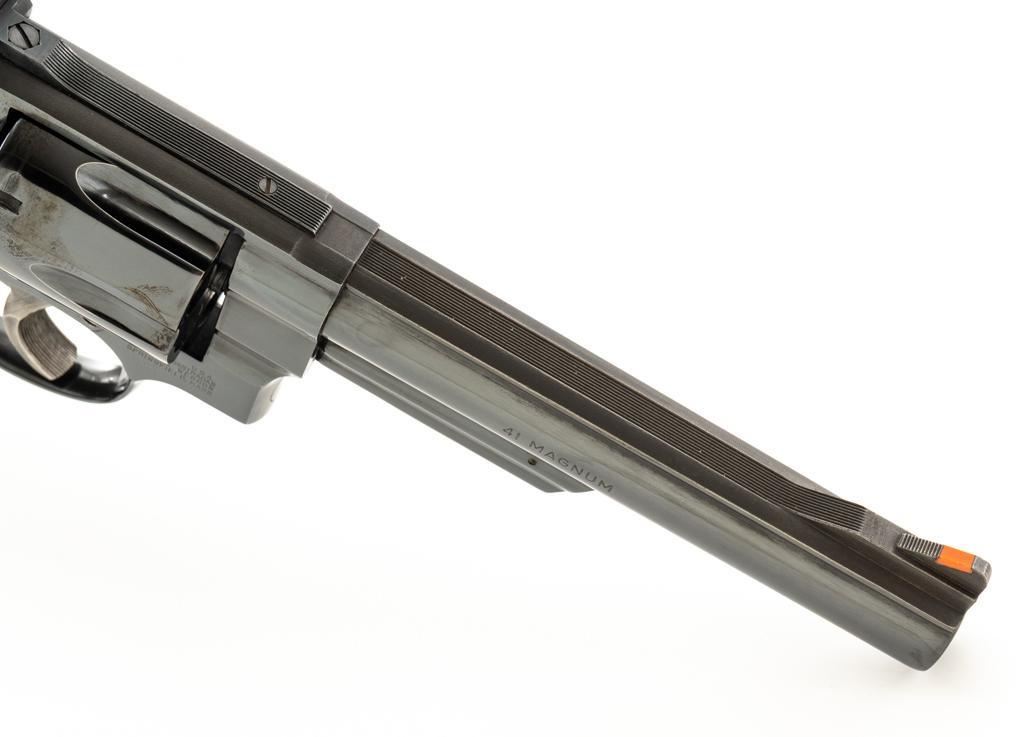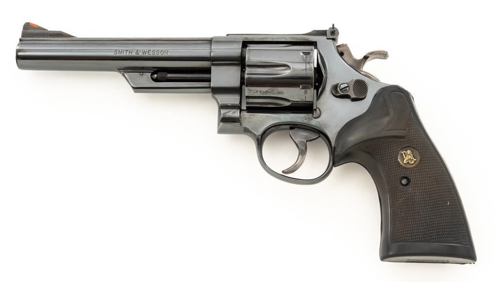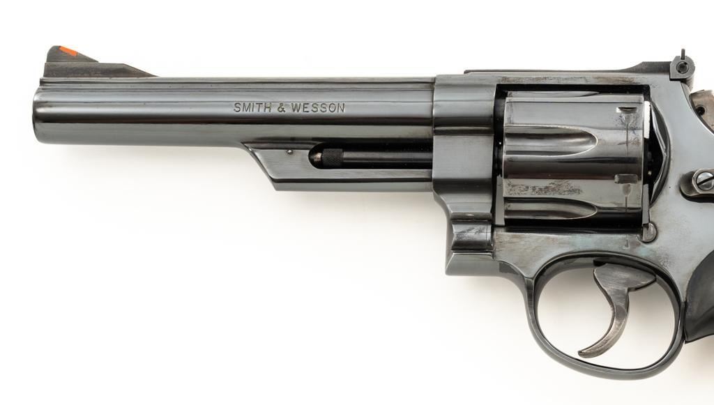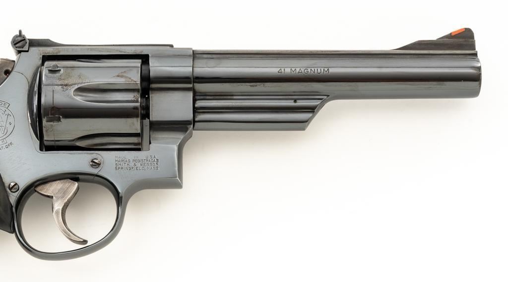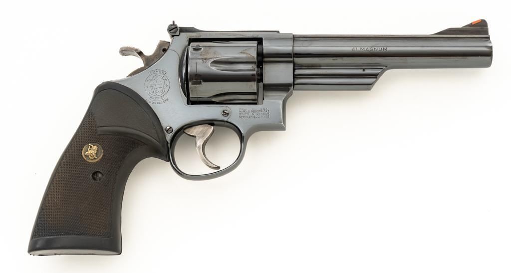 Smith & Wesson Model 57-1 Double Action Revolver, #AJP9315, .41 Mag. cal., 6" barrel, blue finish, replacement Pachmayr ''Presentation'' grips, red ramp front sight and adjustable white outline square-notched rear sight; color case hardened target hammer and target trigger. Mfg'd circa 1982-1988. Condition is near excellent, retaining approx. 97%-98% factory blue, with light handling marks, and a faint index line to cylinder. Factory lettering is crisp. Most of the case color on the hammer and trigger have faded. Grips are in very good condition, with only a few very minor handling marks; they have begun to take on a purplish hue. Action cycles smoothly, cylinder locks up well but there is a very small amount of play. Bore is bright with well-defined rifling. Est.: $800-$1,000. (Modern) (Not available to Calif. residents.)