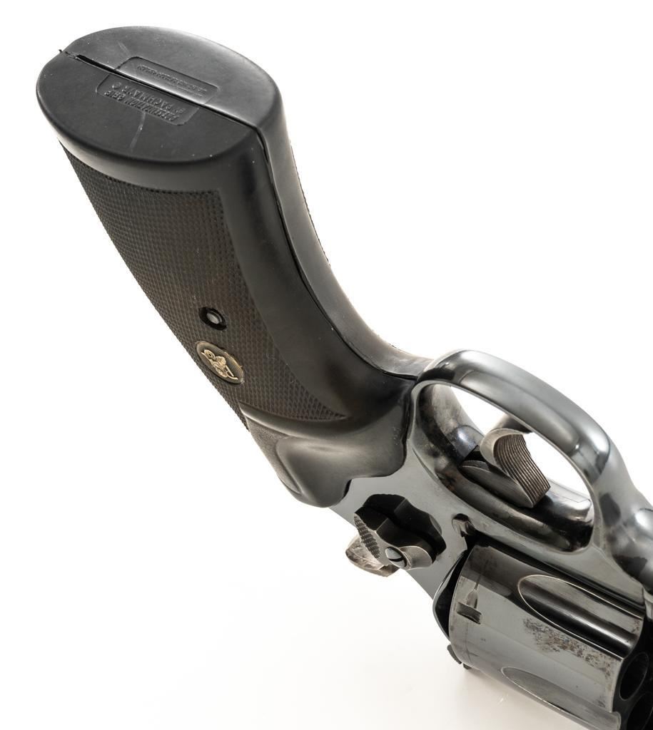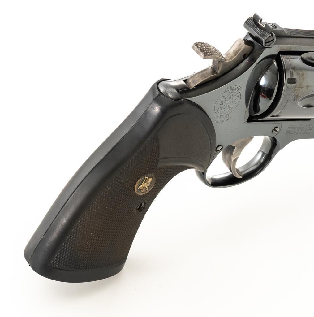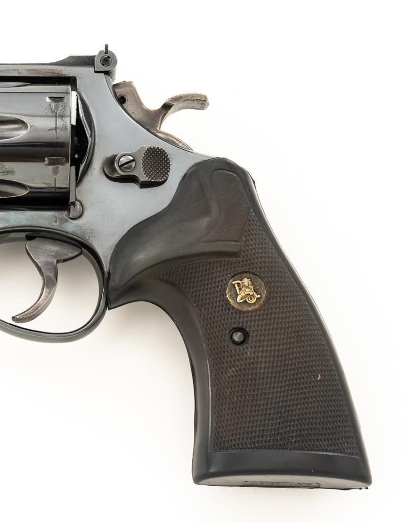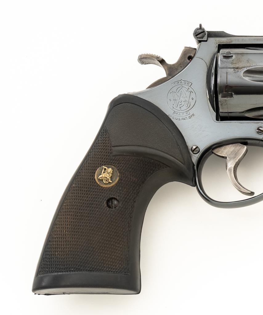 Smith & Wesson Model 57-1 Double Action Revolver, #AJP9315, .41 Mag. cal., 6" barrel, blue finish, replacement Pachmayr ''Presentation'' grips, red ramp front sight and adjustable white outline square-notched rear sight; color case hardened target hammer and target trigger. Mfg'd circa 1982-1988. Condition is near excellent, retaining approx. 97%-98% factory blue, with light handling marks, and a faint index line to cylinder. Factory lettering is crisp. Most of the case color on the hammer and trigger have faded. Grips are in very good condition, with only a few very minor handling marks; they have begun to take on a purplish hue. Action cycles smoothly, cylinder locks up well but there is a very small amount of play. Bore is bright with well-defined rifling. Est.: $800-$1,000. (Modern) (Not available to Calif. residents.)