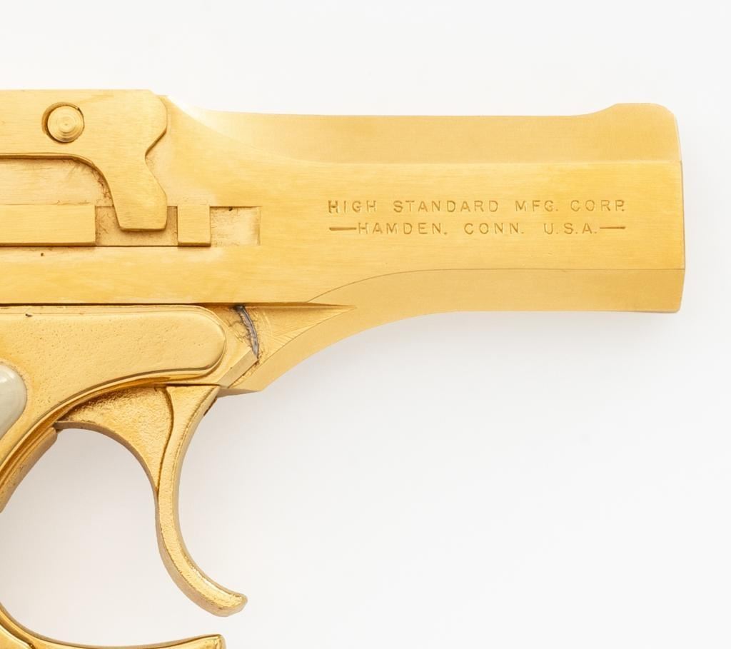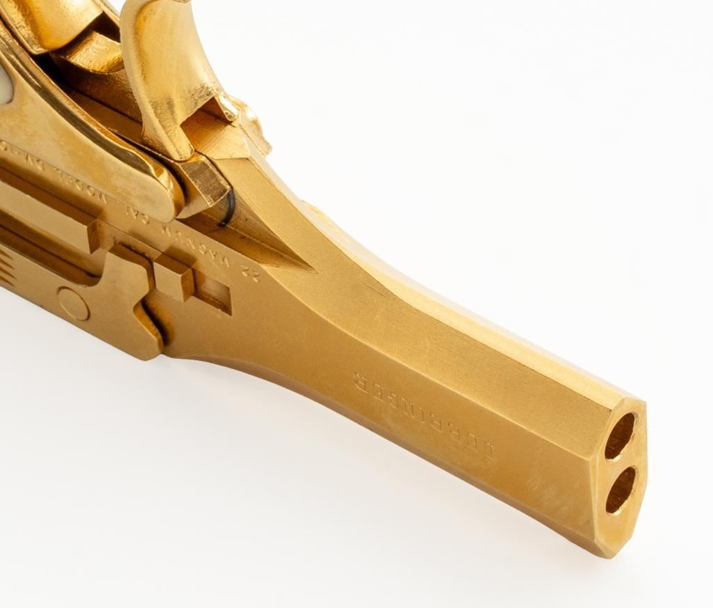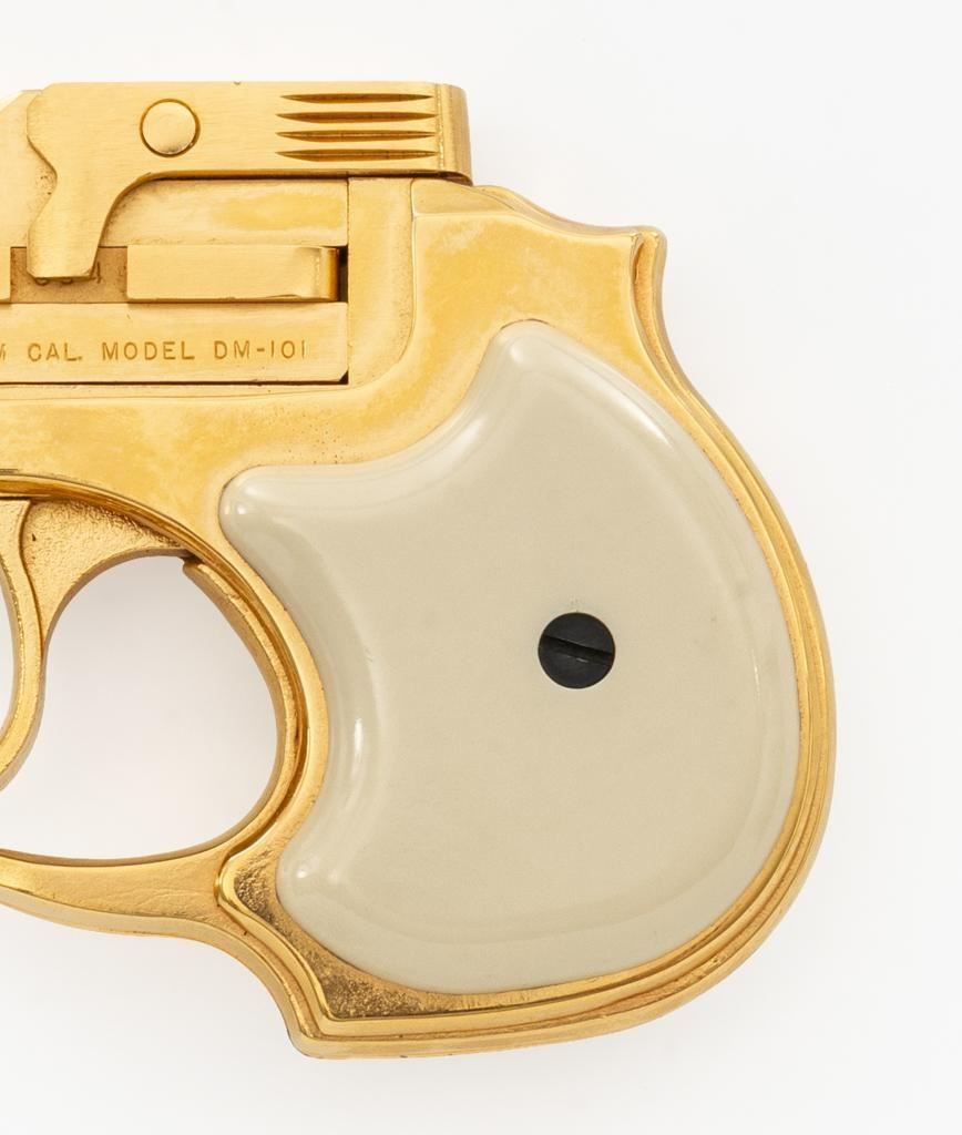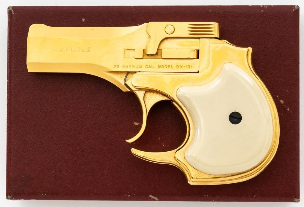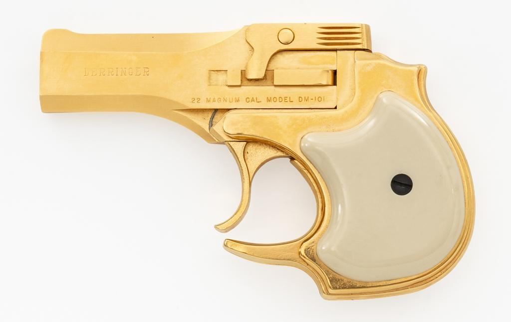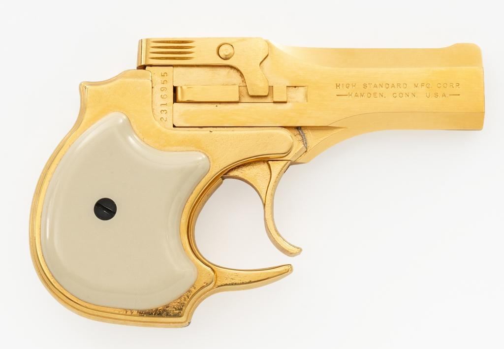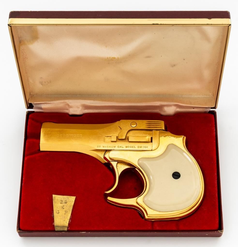 High Standard Model DM-101 Over/Under Derringer, #2316955, .22 WMR cal., 3.5" barrels, gold plated finish, smooth simulated ivory plastic two-piece grips, low profile blade front, and fixed square-notched rear sight. Mfg'd 1971. Includes a clam shell presentation case with red interior. Derringer is in near excellent condition, with light handling and storage marks, grips show little use. Action functions well and locks up securely. Bores are bright. Est.: $300-$400. (C&R/PPT)
