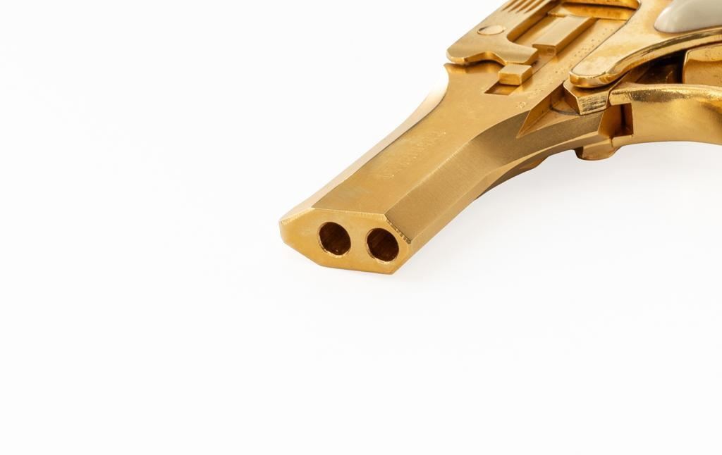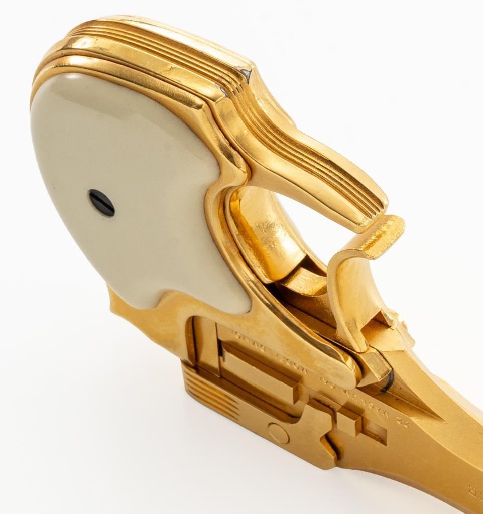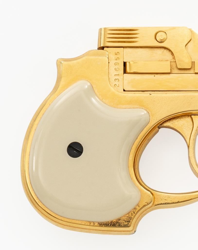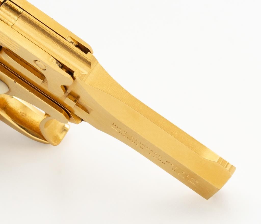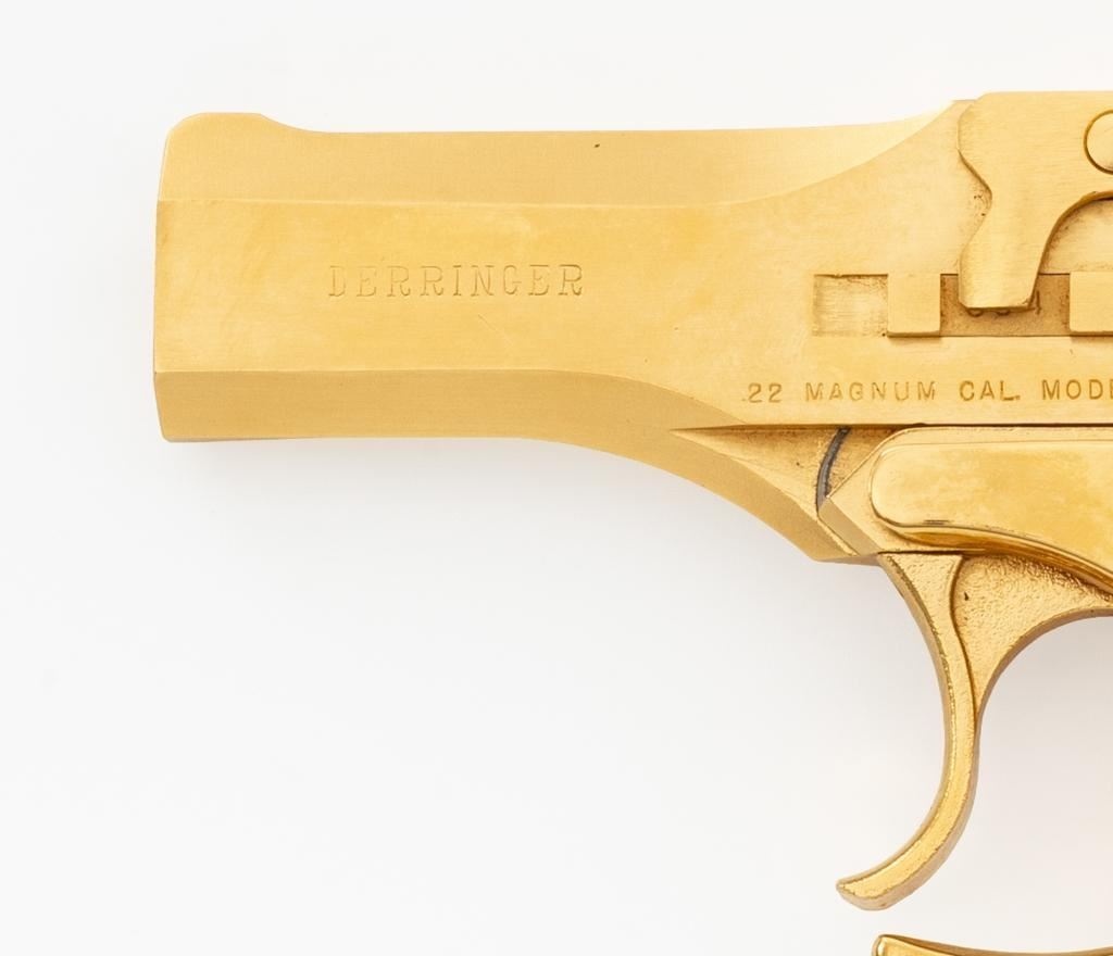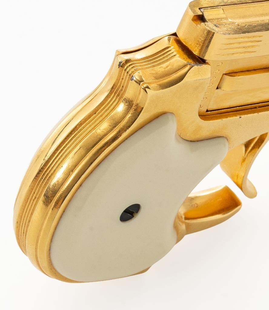 High Standard Model DM-101 Over/Under Derringer, #2316955, .22 WMR cal., 3.5" barrels, gold plated finish, smooth simulated ivory plastic two-piece grips, low profile blade front, and fixed square-notched rear sight. Mfg'd 1971. Includes a clam shell presentation case with red interior. Derringer is in near excellent condition, with light handling and storage marks, grips show little use. Action functions well and locks up securely. Bores are bright. Est.: $300-$400. (C&R/PPT)