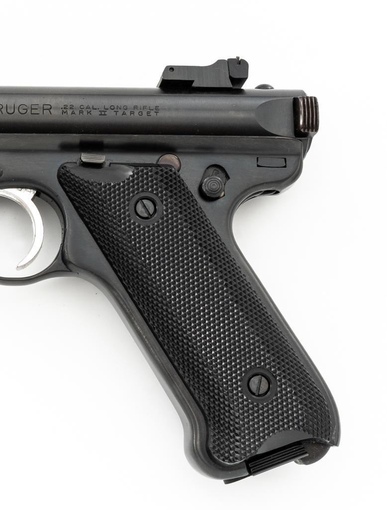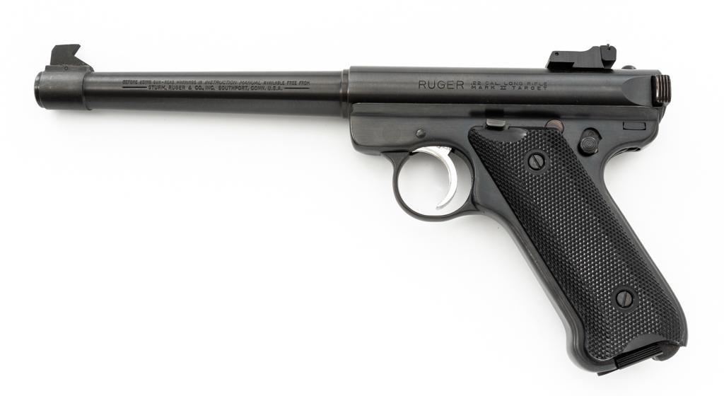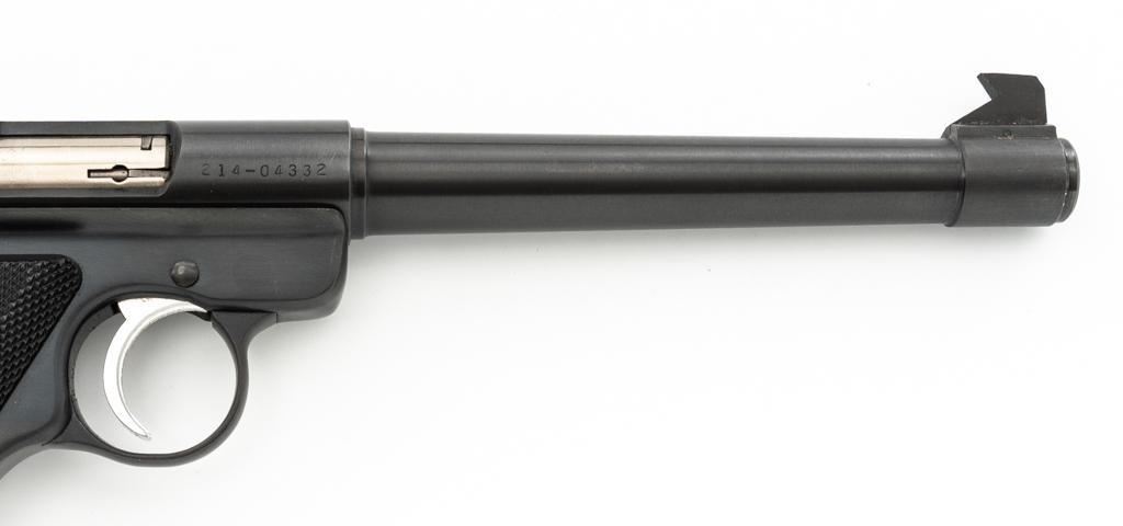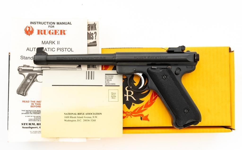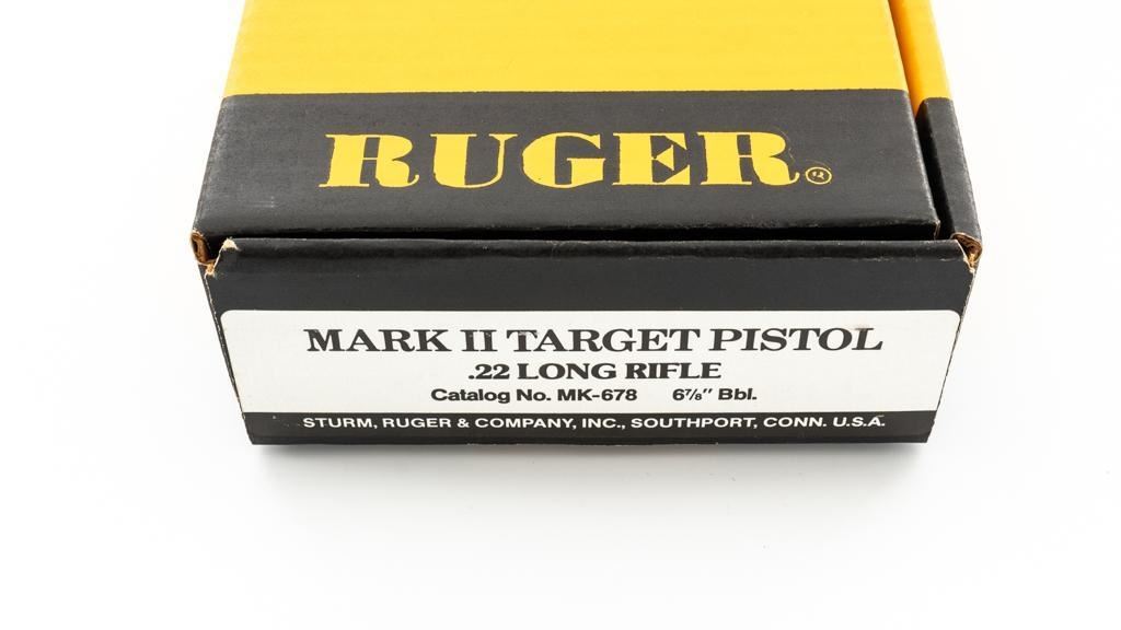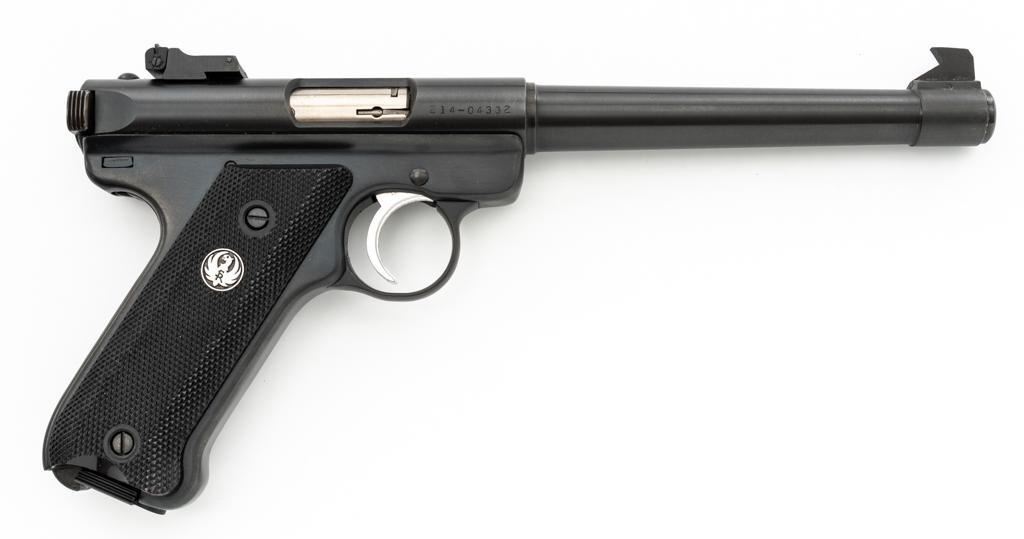 Ruger Mark II Target Semi-Automatic Pistol, #214-04332, .22 LR cal., 6.9'' tapered barrel, blue finish, checkered plastic two-piece Ruger grips, Patridge front and fully adjustable square-notch rear sight, with one 10-round blue steel Ruger magazine. Includes both the shipping box with matching end marks and Ruger factory one-piece box, instruction manual, warranty card, and other misc. factory literature. Mfg'd 1988. Pistol is in excellent overall condition, with only minor marks, showing little use. Grips with sharp checkering detail. Action is crisp and functions smoothly. Bore is mirror bright with excellent rifling. Est.: $300-$500. (Modern/PPT)
