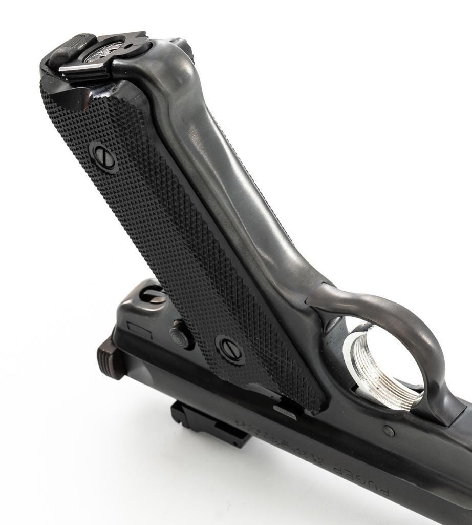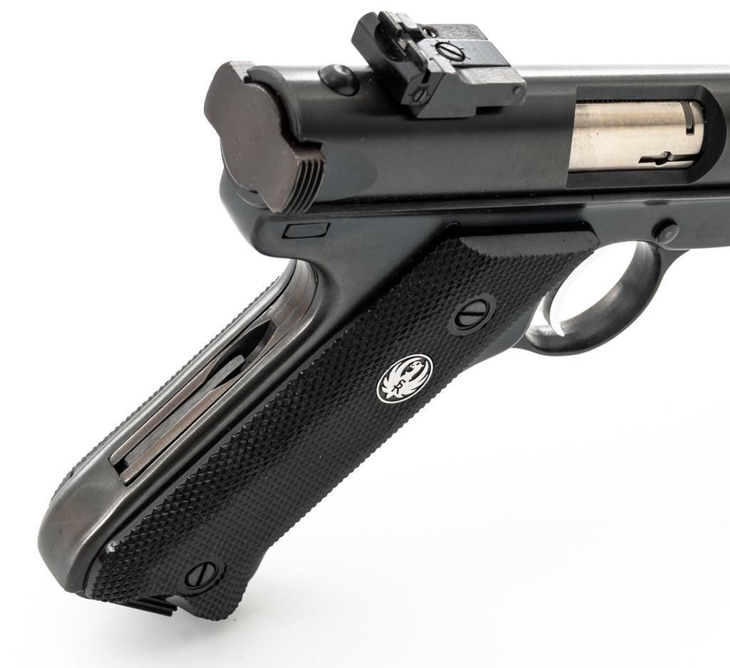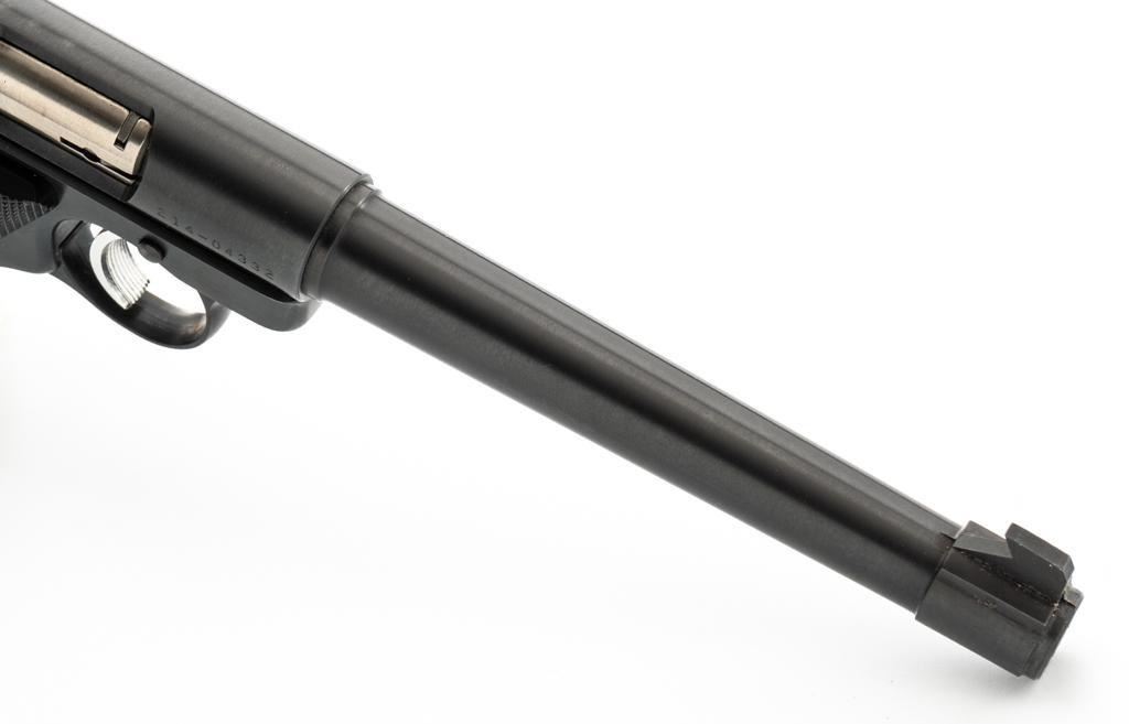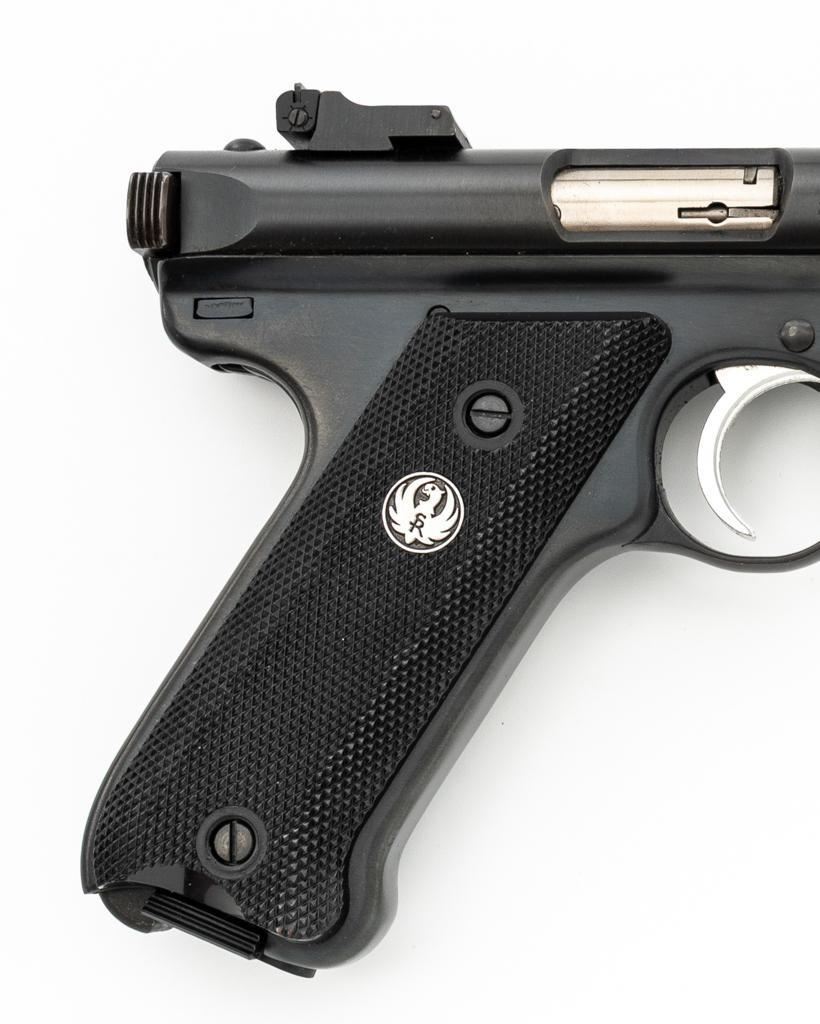 Ruger Mark II Target Semi-Automatic Pistol, #214-04332, .22 LR cal., 6.9'' tapered barrel, blue finish, checkered plastic two-piece Ruger grips, Patridge front and fully adjustable square-notch rear sight, with one 10-round blue steel Ruger magazine. Includes both the shipping box with matching end marks and Ruger factory one-piece box, instruction manual, warranty card, and other misc. factory literature. Mfg'd 1988. Pistol is in excellent overall condition, with only minor marks, showing little use. Grips with sharp checkering detail. Action is crisp and functions smoothly. Bore is mirror bright with excellent rifling. Est.: $300-$500. (Modern/PPT)