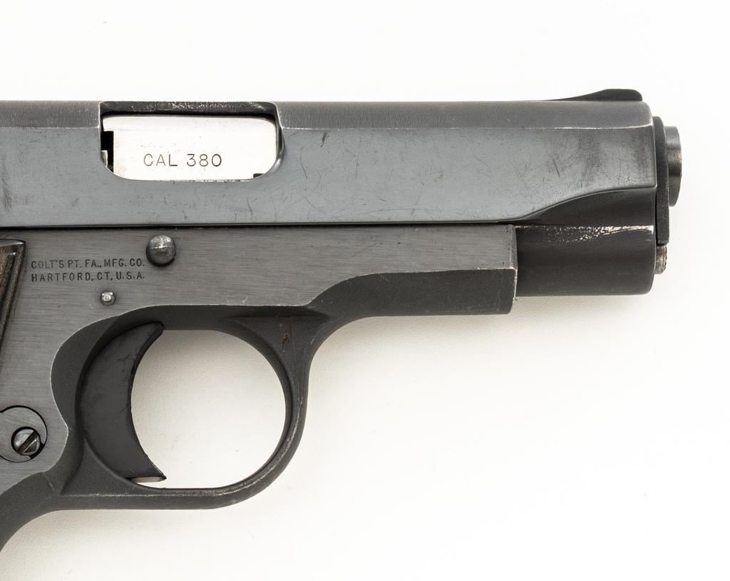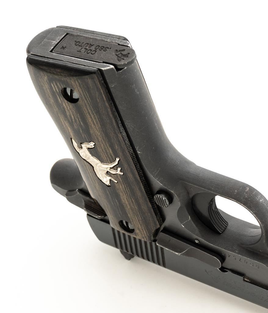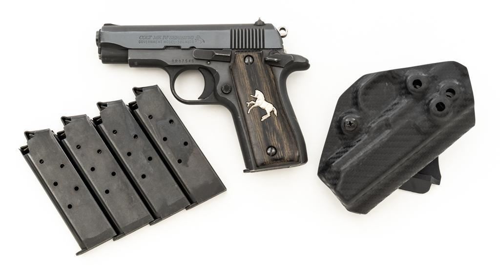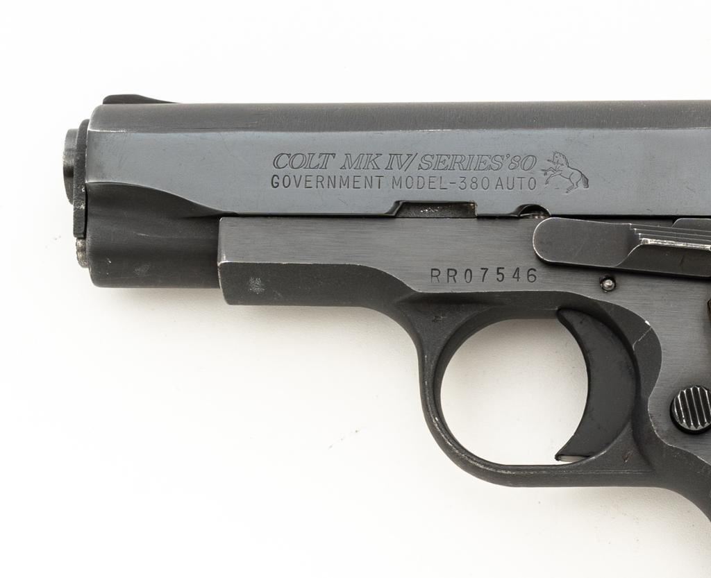 Colt MK IV Series 80 Government Model Semi-Automatic Pistol, #RR07546, .380 ACP cal., 3.25'' barrel, blue finish, smooth replacement black/gray wood grips with inlaid silver Rampant Colt on each grip, fixed ramped blade front sight, and square-notched rear sight. Includes five (5) blued Colt magazines, and black kydex right hand Koas concealment open top belt holster. Holster and magazines are all in excellent, lightly used condition. Pistol is in near excellent condition, showing light carry wear and marks to the frame and slide; overall approx. 96% factory blue remains. Grips with a few scuffs and handling marks. Action functions smoothly. Bore is near excellent with defined rifling. Est.: $700-$1,000. (Modern/PPT)