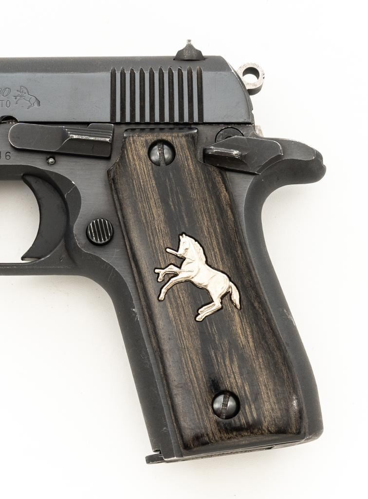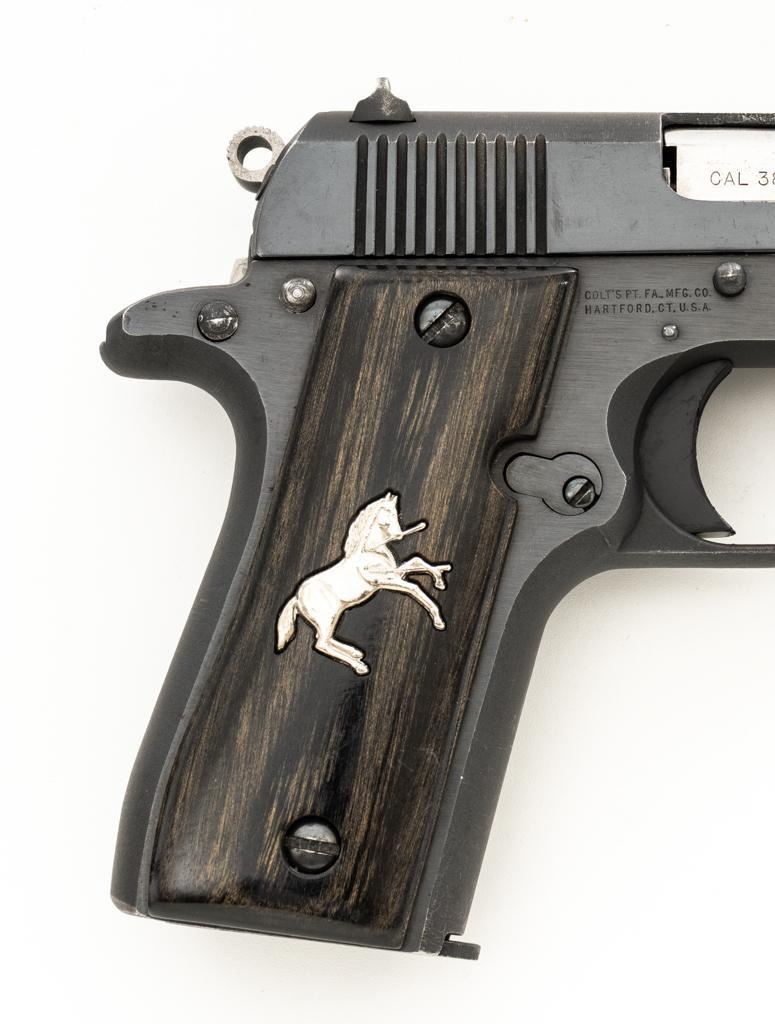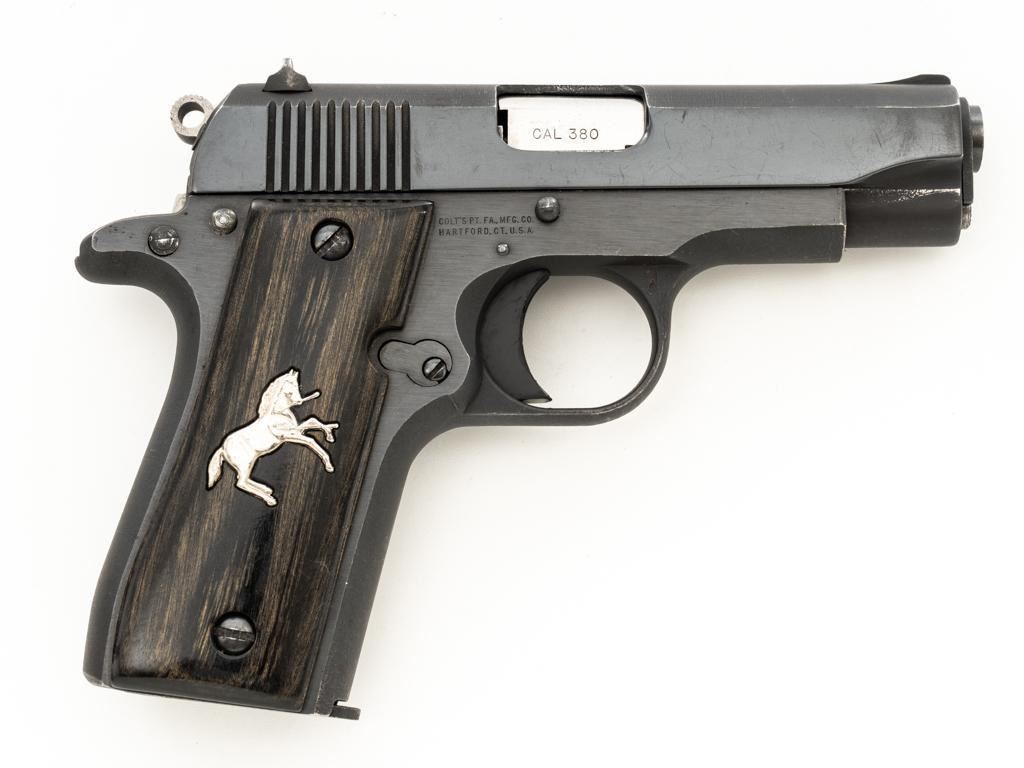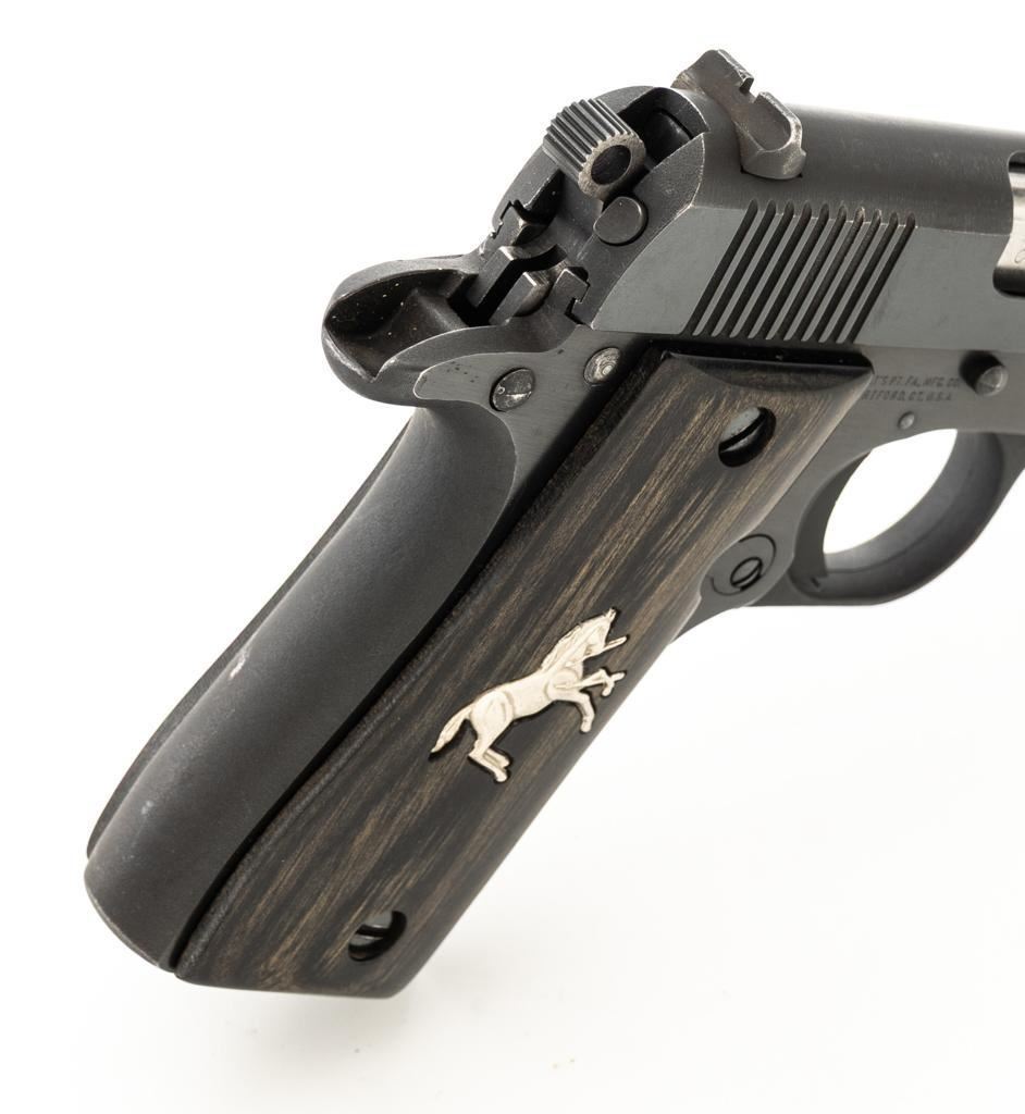 Colt MK IV Series 80 Government Model Semi-Automatic Pistol, #RR07546, .380 ACP cal., 3.25'' barrel, blue finish, smooth replacement black/gray wood grips with inlaid silver Rampant Colt on each grip, fixed ramped blade front sight, and square-notched rear sight. Includes five (5) blued Colt magazines, and black kydex right hand Koas concealment open top belt holster. Holster and magazines are all in excellent, lightly used condition. Pistol is in near excellent condition, showing light carry wear and marks to the frame and slide; overall approx. 96% factory blue remains. Grips with a few scuffs and handling marks. Action functions smoothly. Bore is near excellent with defined rifling. Est.: $700-$1,000. (Modern/PPT)