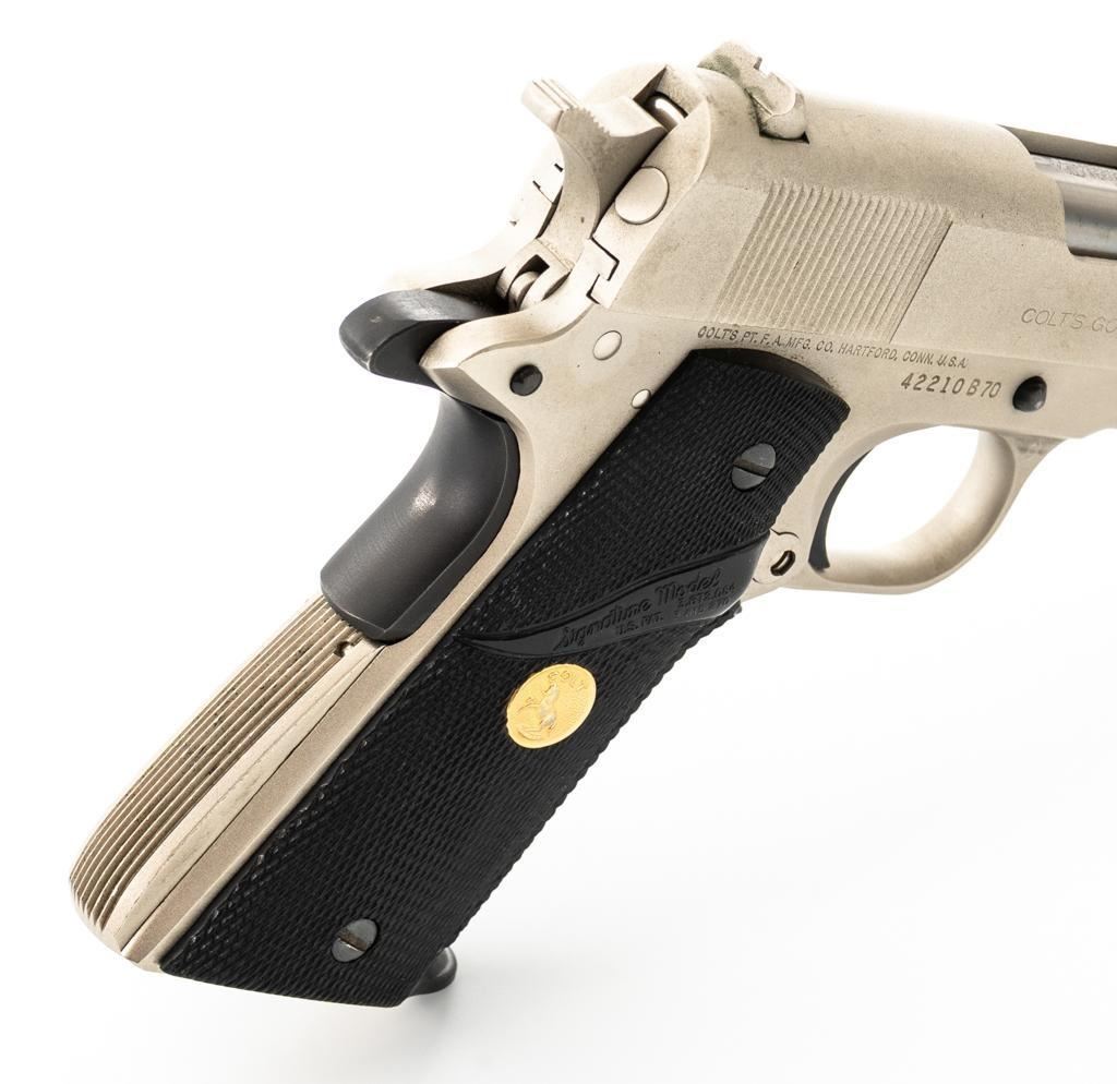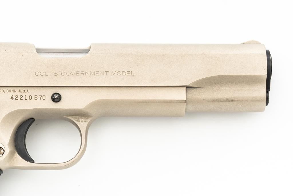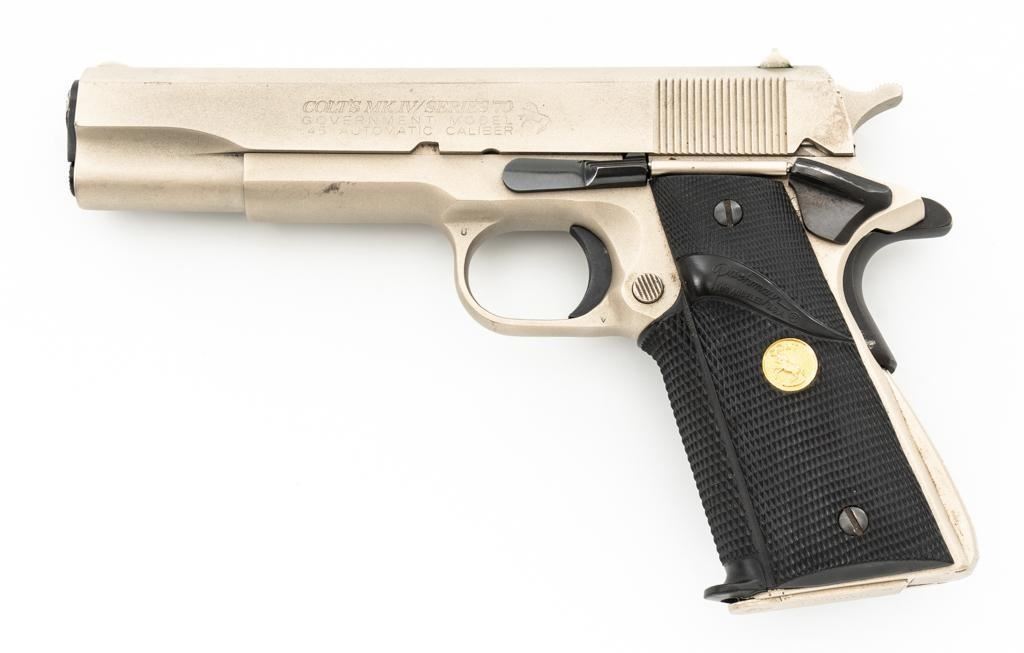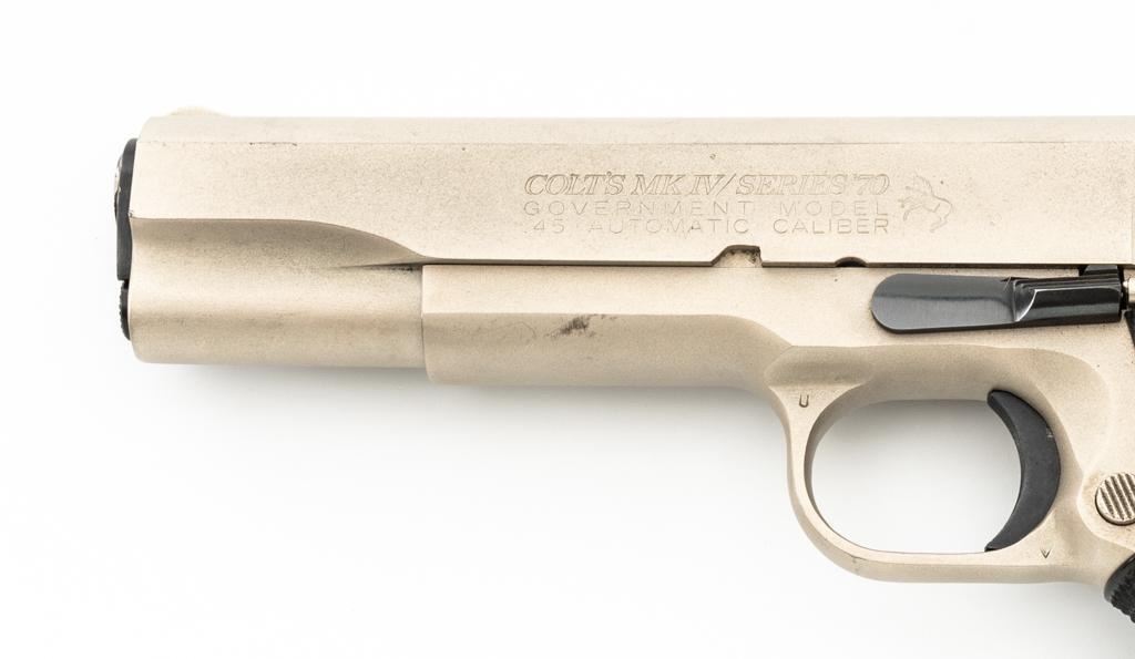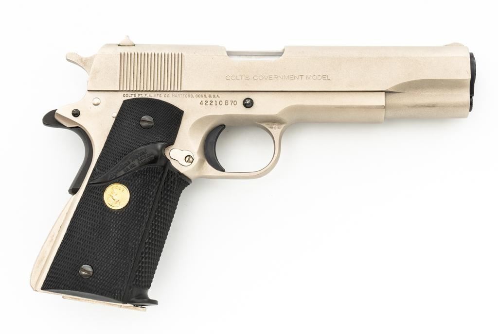 Colt MK IV Series 70 Government Model Semi-Automatic Pistol, #42210B70, .45 ACP cal., 5" barrel, electroless nickel finish, Pachmayr ''Signature'' Model wraparound rubber grips with gold Colt medallions, blade front sight, with square-notched rear sight. Barrel, barrel bushing, slide stop, grip safety, and thumb safety are blued. Barrel chamber is stamped ''-COLT .45 AUTO-/MK.IVSERIES 70''. Includes one factory nickel 7-round Colt magazine. Mfg'd 1980. Condition is near excellent. Slide shows a little mild scuffing. Factory markings are crisp. Grips are excellent appearing almost new. Action operates smoothly. Bore is bright with well-defined rifling. Est.: $900-$1,200. (Modern/PPT)