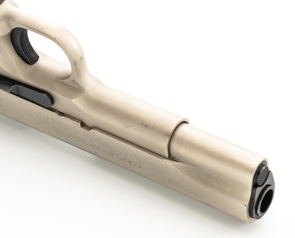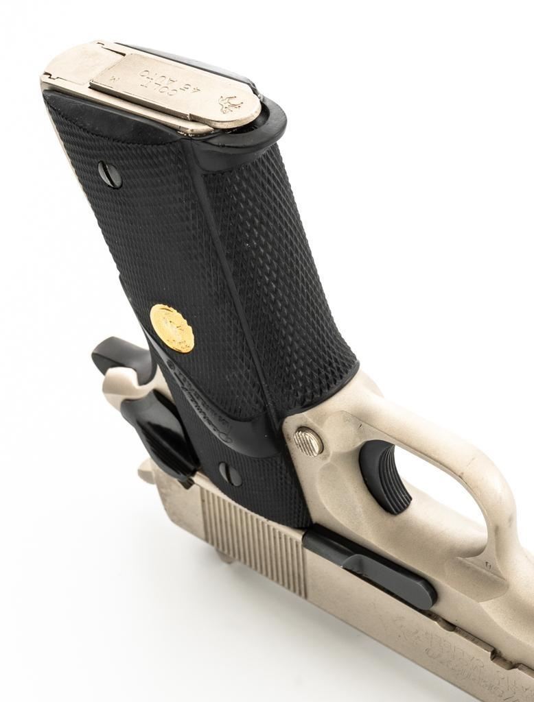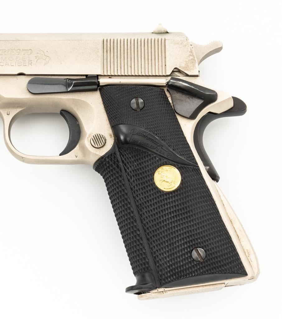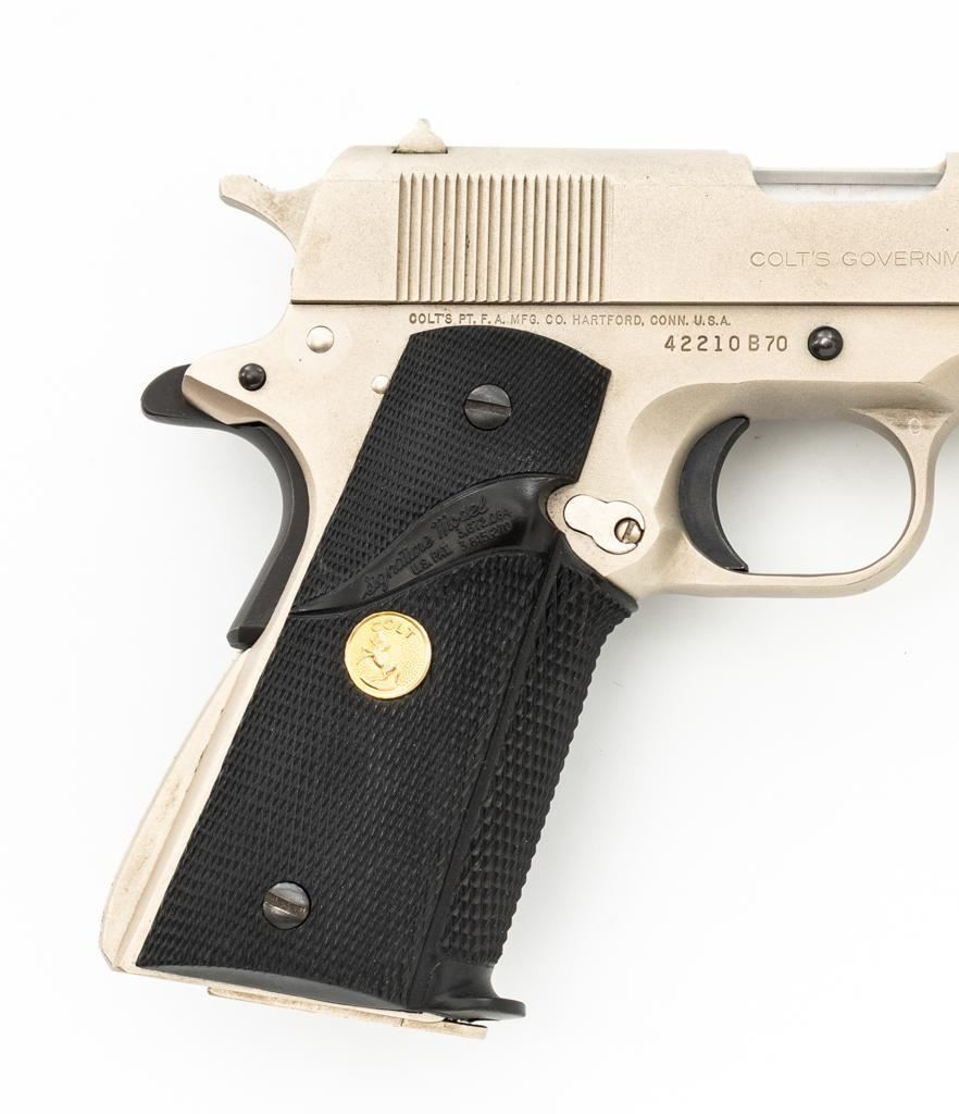 Colt MK IV Series 70 Government Model Semi-Automatic Pistol, #42210B70, .45 ACP cal., 5" barrel, electroless nickel finish, Pachmayr ''Signature'' Model wraparound rubber grips with gold Colt medallions, blade front sight, with square-notched rear sight. Barrel, barrel bushing, slide stop, grip safety, and thumb safety are blued. Barrel chamber is stamped ''-COLT .45 AUTO-/MK.IVSERIES 70''. Includes one factory nickel 7-round Colt magazine. Mfg'd 1980. Condition is near excellent. Slide shows a little mild scuffing. Factory markings are crisp. Grips are excellent appearing almost new. Action operates smoothly. Bore is bright with well-defined rifling. Est.: $900-$1,200. (Modern/PPT)