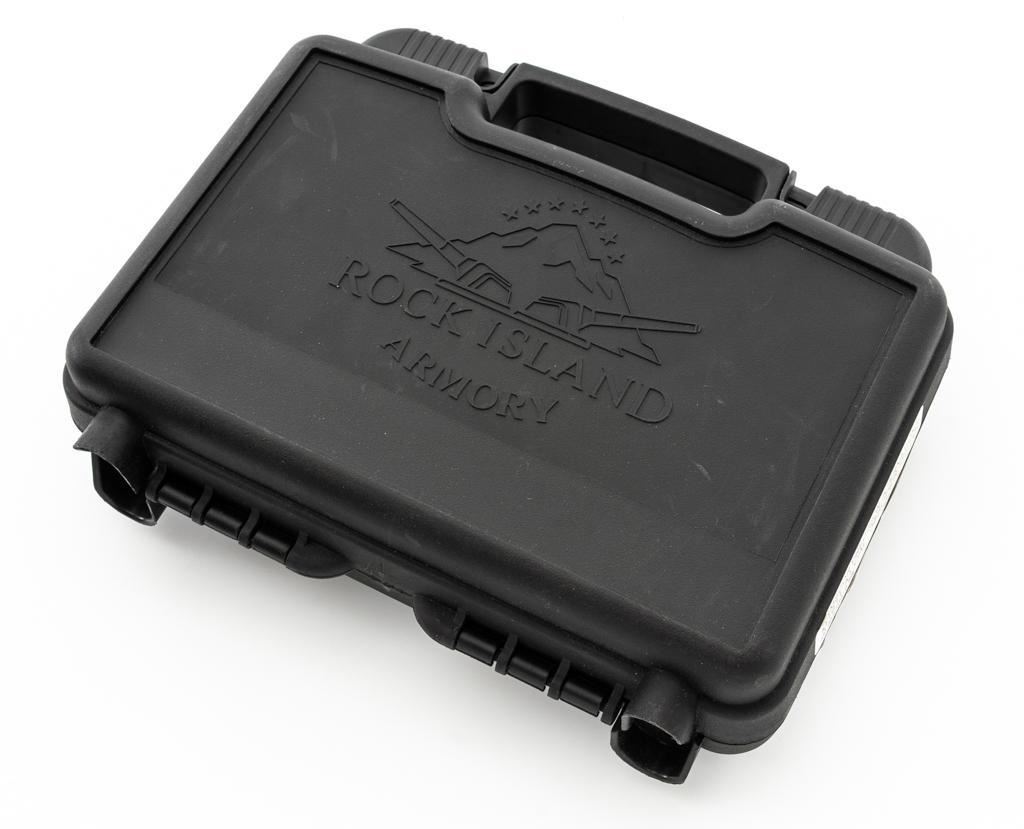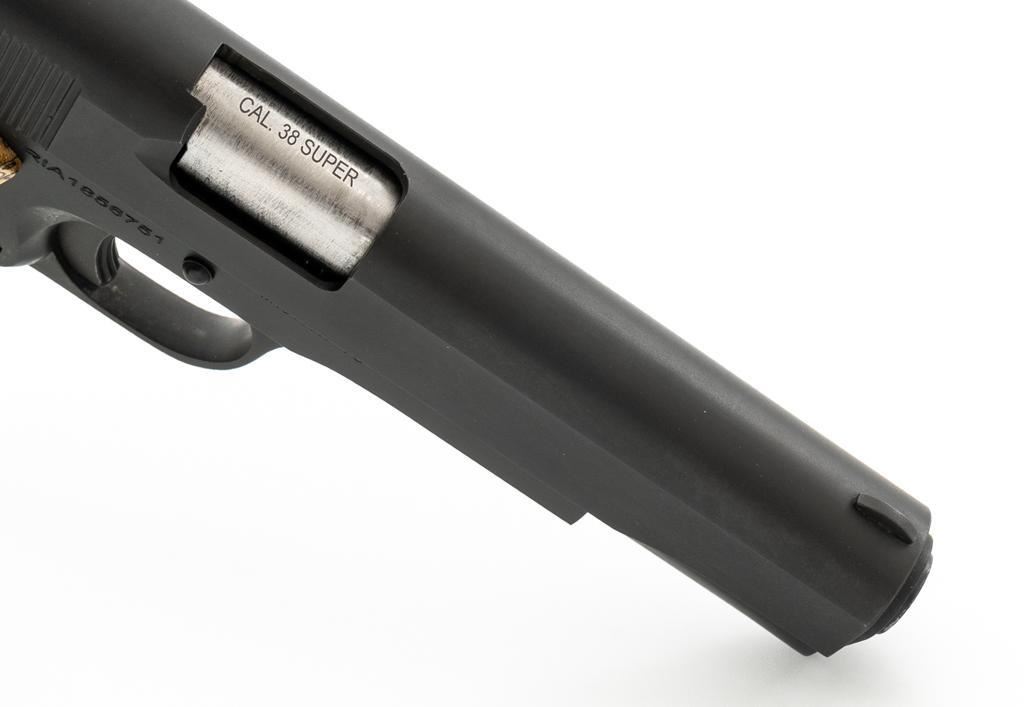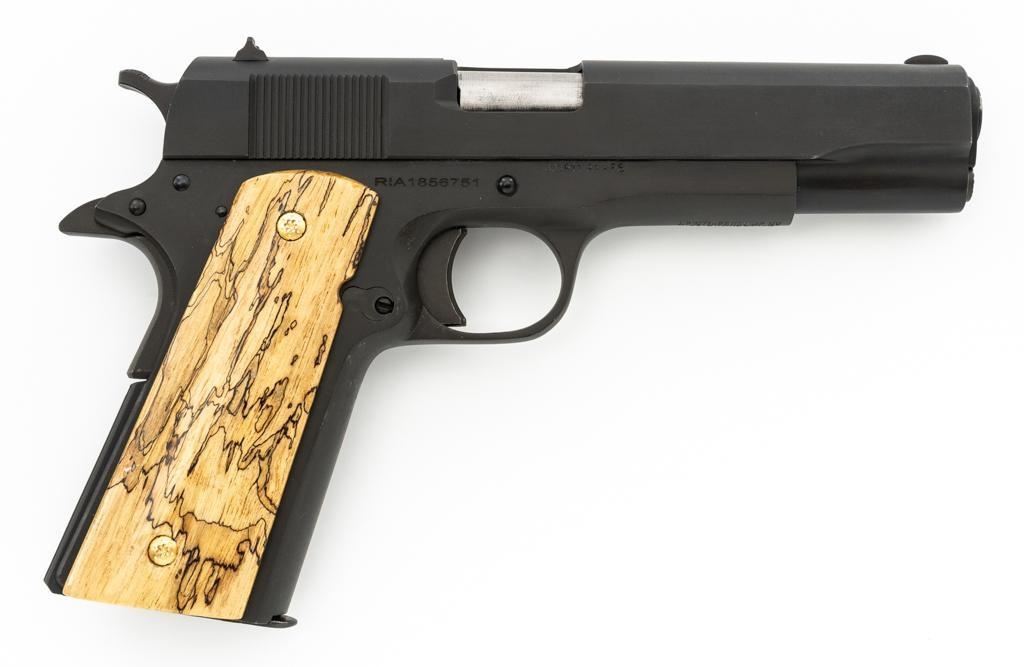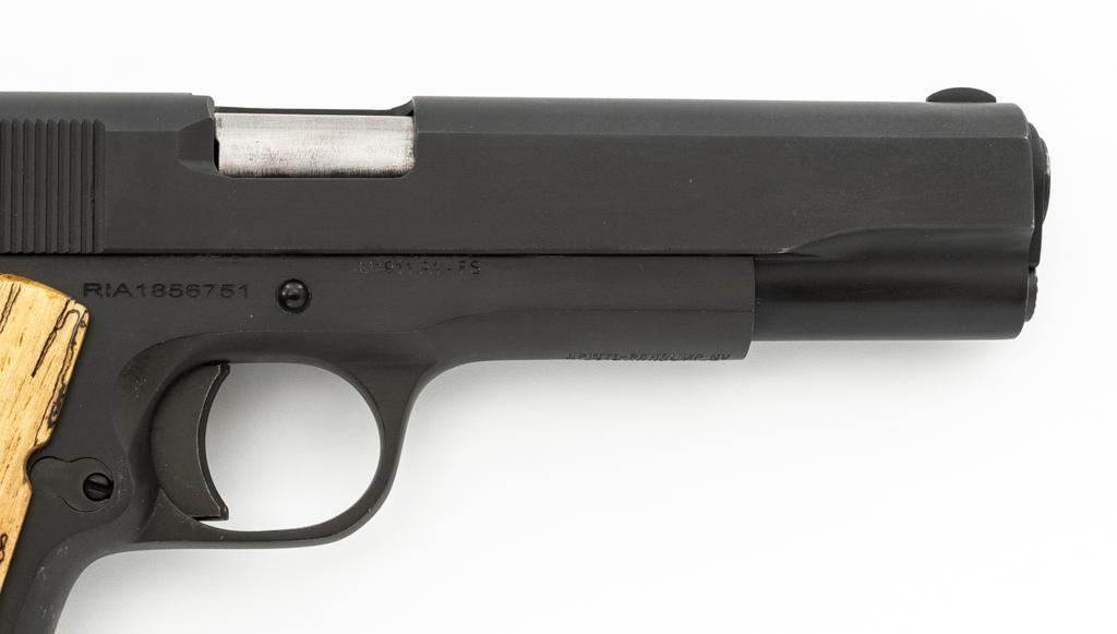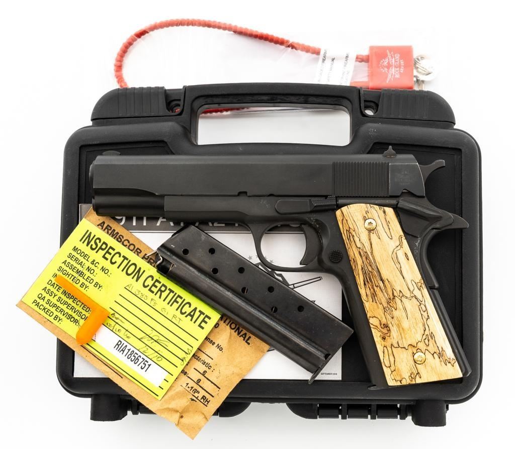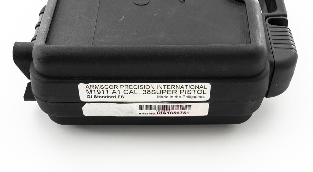 Rock Island M1911 A1-FS G.I. Standard Semi-Automatic Pistol, #RIA1856751, .38 Super cal., 5'' barrel, matte black finish, smooth spalted hardwood two-piece grips, low profile blade front sight, square-notch rear sight, with two (2) 9-round blue steel magazines. Factory markings are clear with ''API-PAHRUMP NV / ACP PHILIPPINES'' on the underside of the frame. Includes factory plastic hardcase with matching end label, instruction manual, spent test case, and cable lock. Pistol is in excellent condition, showing little use, and retaining approx. 99%+ factory finish. Outstanding grips are in excellent condition. Action operates smoothly. Bore is bright with excellent rifling, showing traces of copper residue. Est.: $400-$600. (Modern)