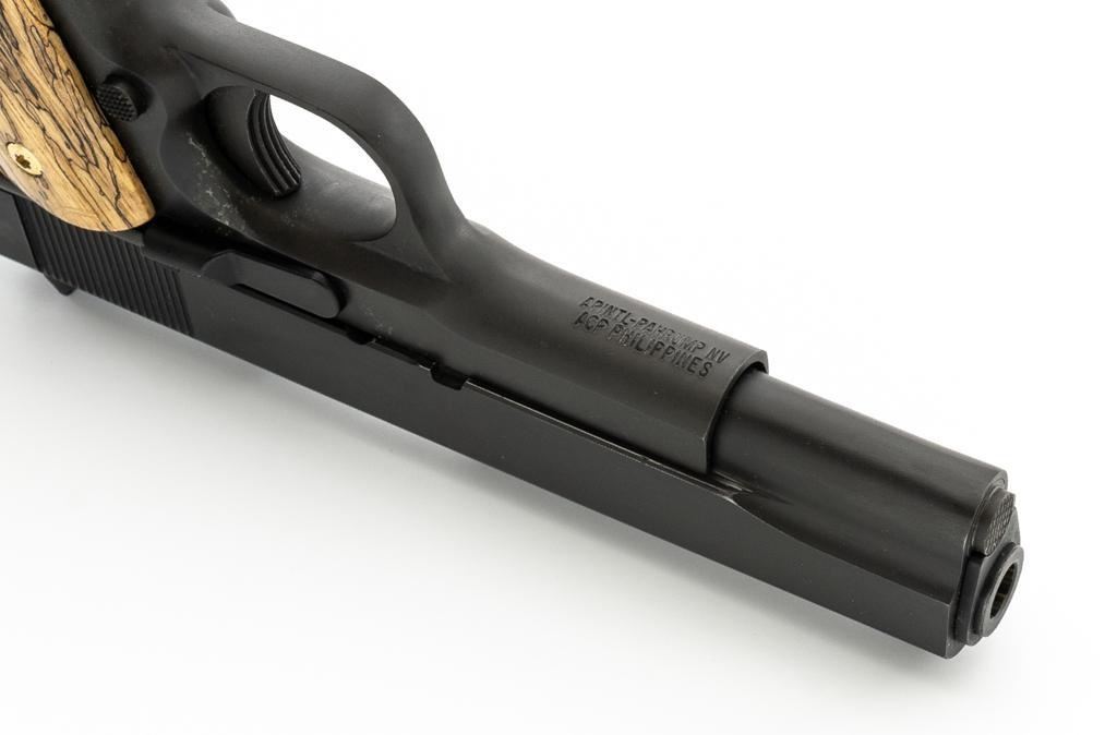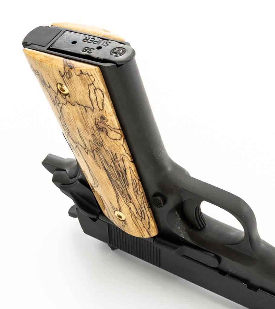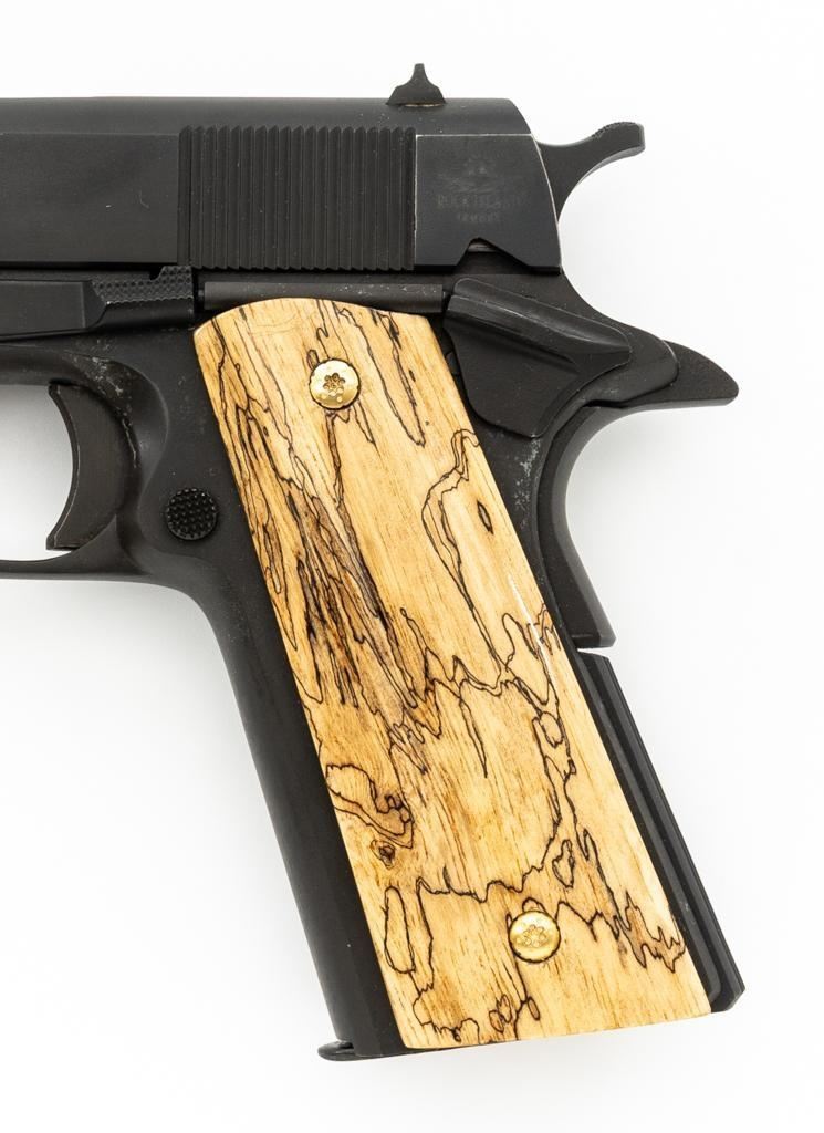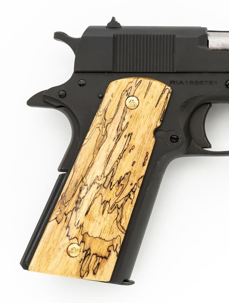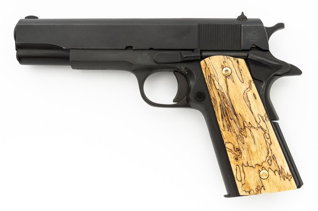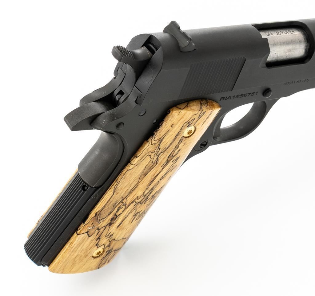 Rock Island M1911 A1-FS G.I. Standard Semi-Automatic Pistol, #RIA1856751, .38 Super cal., 5'' barrel, matte black finish, smooth spalted hardwood two-piece grips, low profile blade front sight, square-notch rear sight, with two (2) 9-round blue steel magazines. Factory markings are clear with ''API-PAHRUMP NV / ACP PHILIPPINES'' on the underside of the frame. Includes factory plastic hardcase with matching end label, instruction manual, spent test case, and cable lock. Pistol is in excellent condition, showing little use, and retaining approx. 99%+ factory finish. Outstanding grips are in excellent condition. Action operates smoothly. Bore is bright with excellent rifling, showing traces of copper residue. Est.: $400-$600. (Modern)