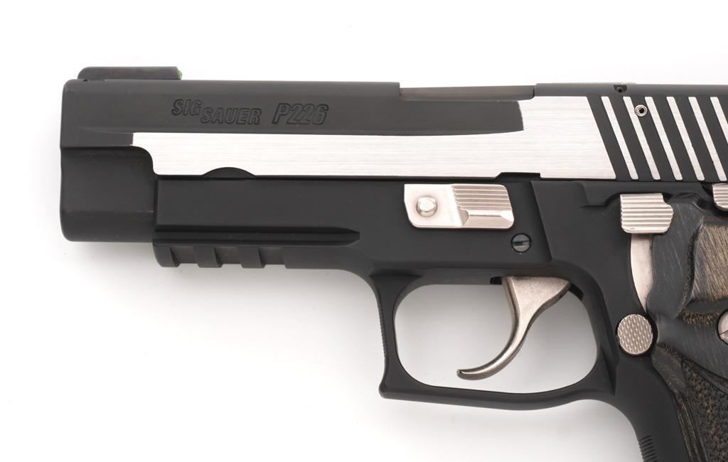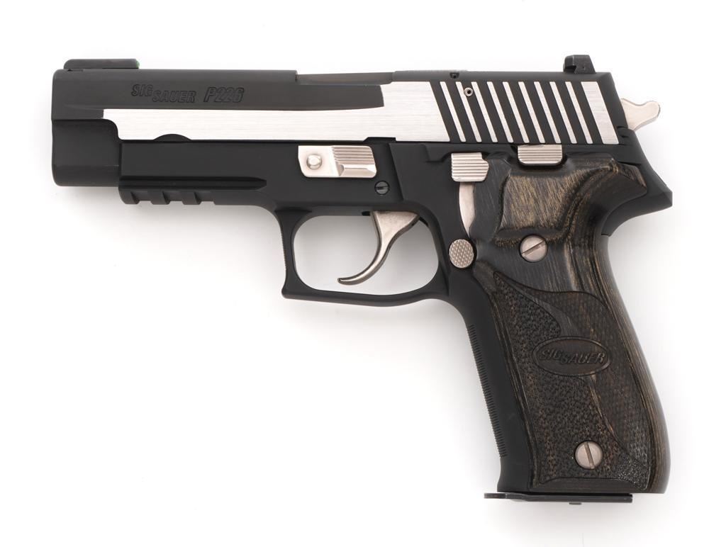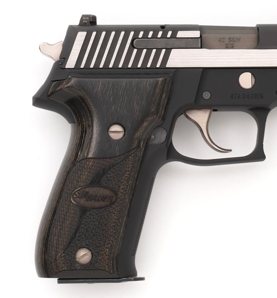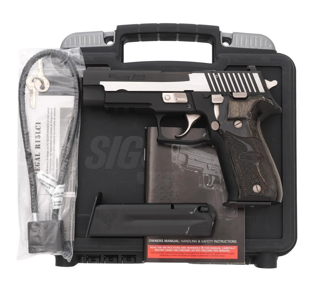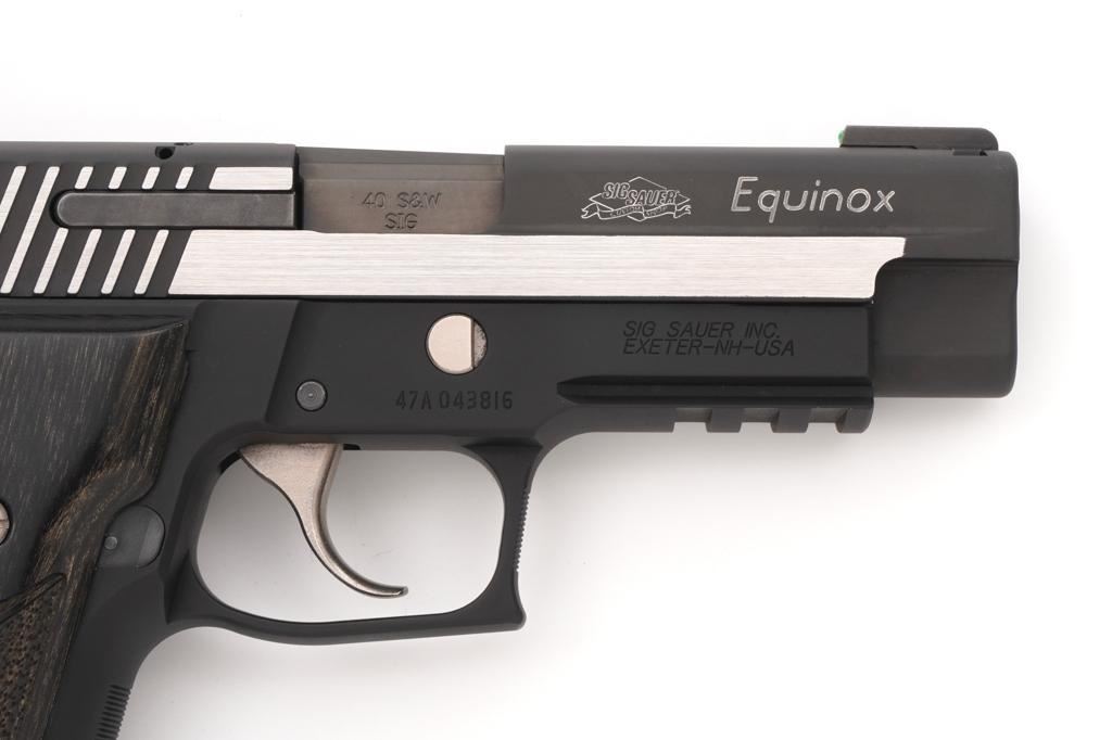 Sig Sauer Model P226 Equinox Semi-Automatic Pistol, #47A043816, .40 S&W cal., 4.4'' barrel, two-tone Nitron finish, textured gray laminated wood two-piece grips, TruGlo TFO front and SigLite tritium rear sights, Picatinny rail on the underside of the frame, with two (2) 10-round Sig magazines. Includes factory plastic hard case with matching end label, instruction manual, and cable lock. Pistol is in excellent overall condition, retaining approx. 99% factory finish. with only a few light handling and storage marks. Grips are in excellent condition, showing little use. Action is crisp and functions smoothly. Bore is bright with sharp rifling. Est.: $700-$900. (Modern)