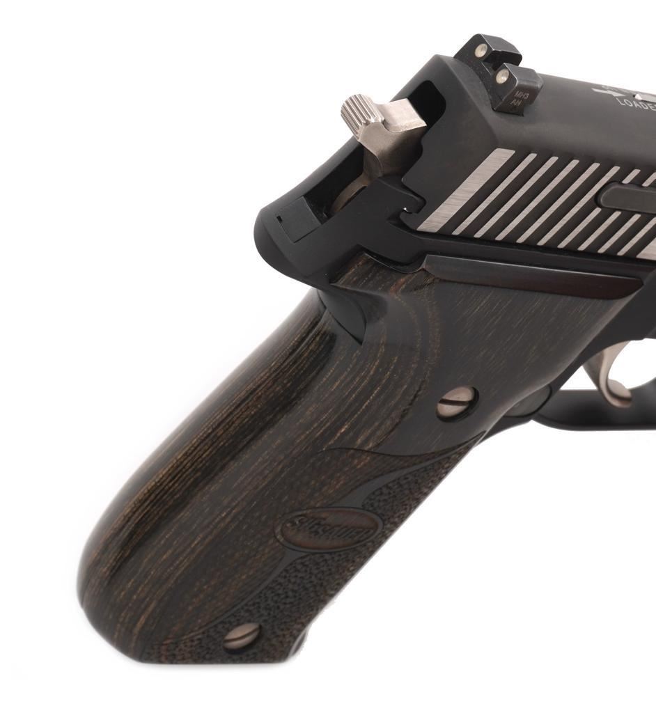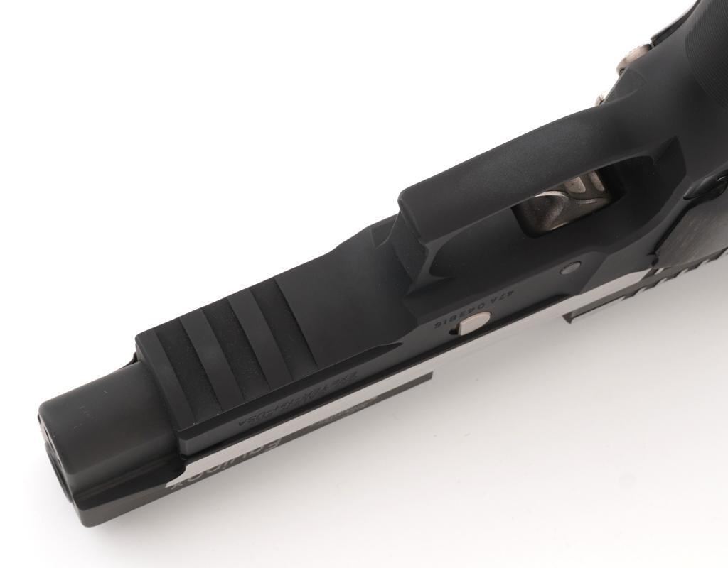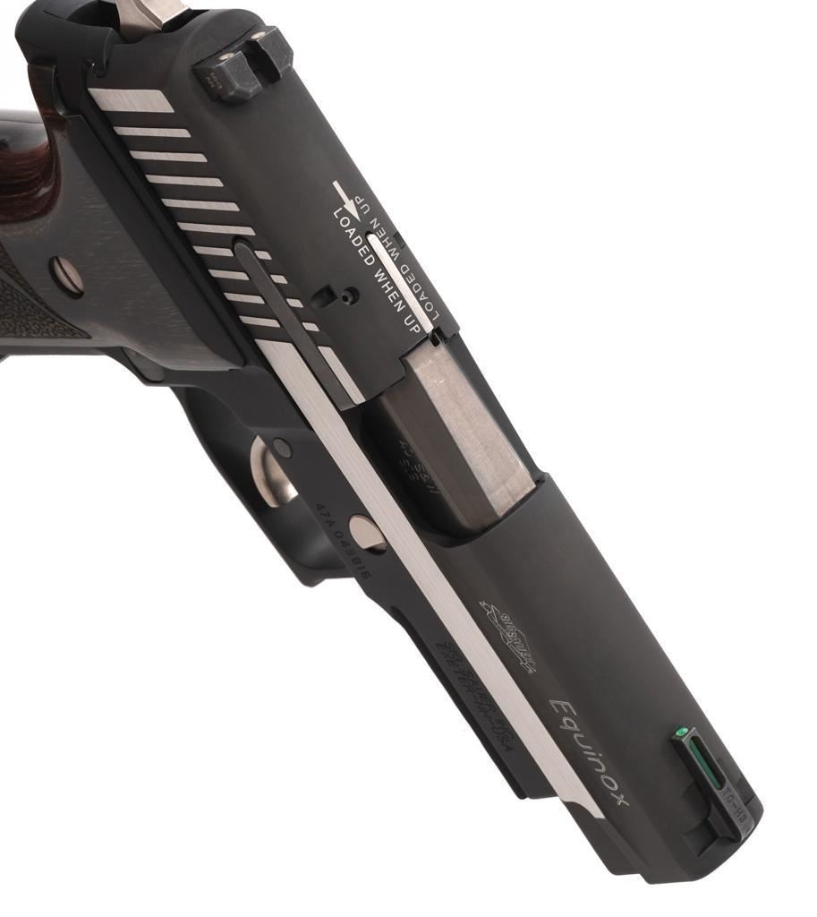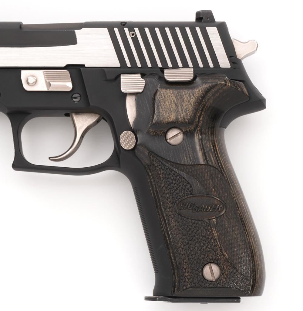 Sig Sauer Model P226 Equinox Semi-Automatic Pistol, #47A043816, .40 S&W cal., 4.4'' barrel, two-tone Nitron finish, textured gray laminated wood two-piece grips, TruGlo TFO front and SigLite tritium rear sights, Picatinny rail on the underside of the frame, with two (2) 10-round Sig magazines. Includes factory plastic hard case with matching end label, instruction manual, and cable lock. Pistol is in excellent overall condition, retaining approx. 99% factory finish. with only a few light handling and storage marks. Grips are in excellent condition, showing little use. Action is crisp and functions smoothly. Bore is bright with sharp rifling. Est.: $700-$900. (Modern)