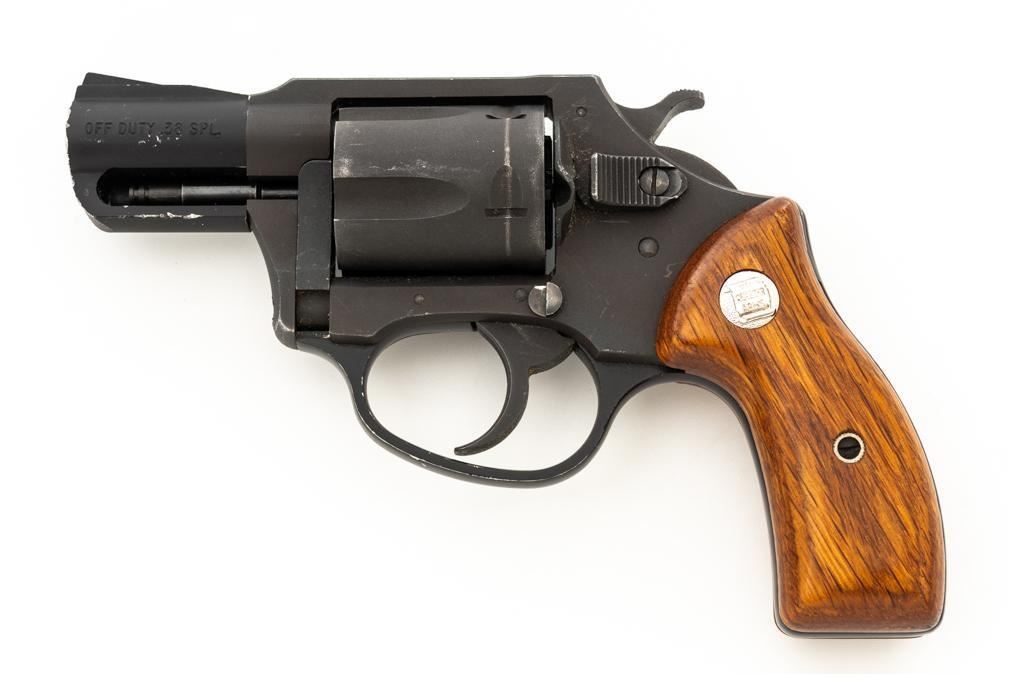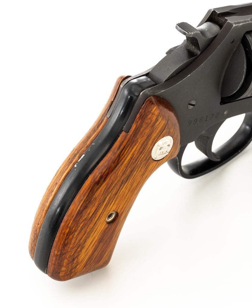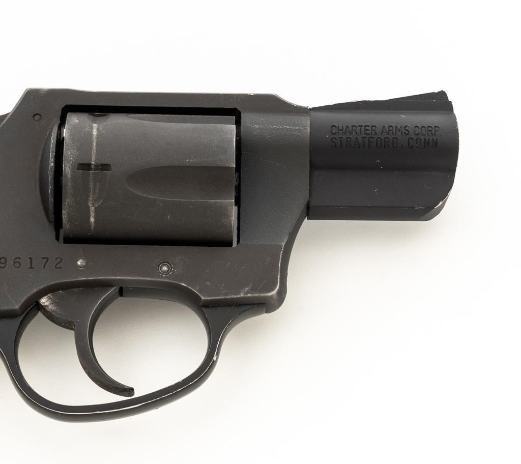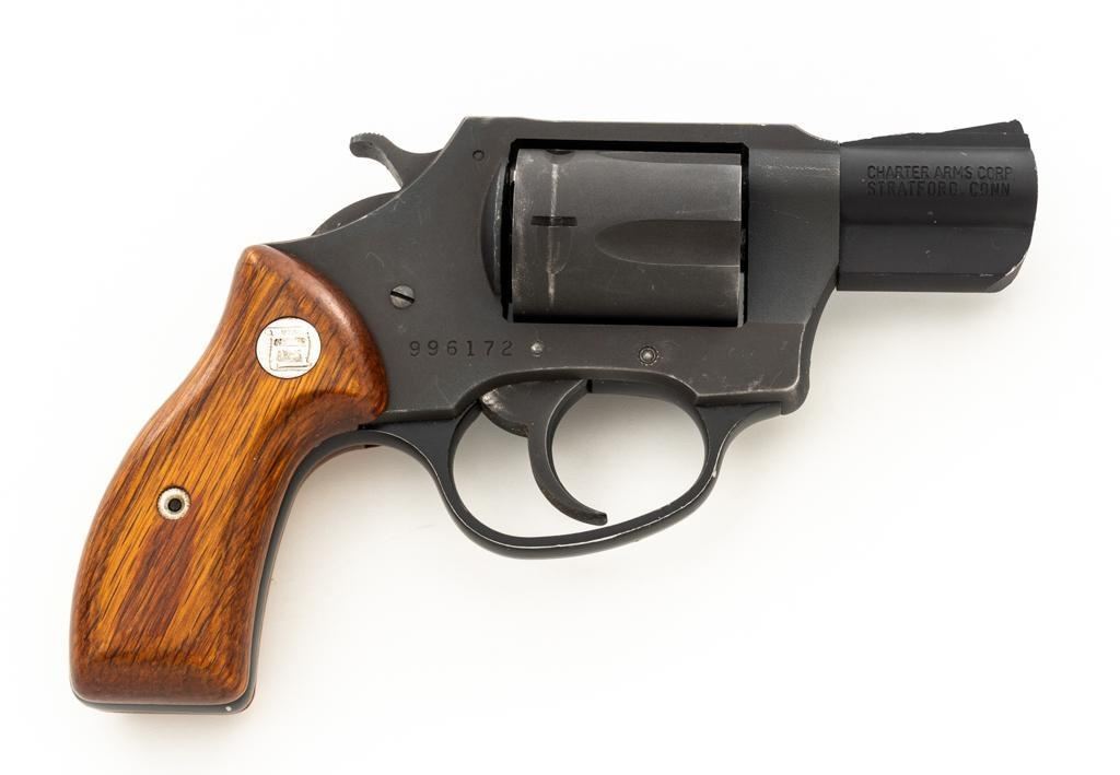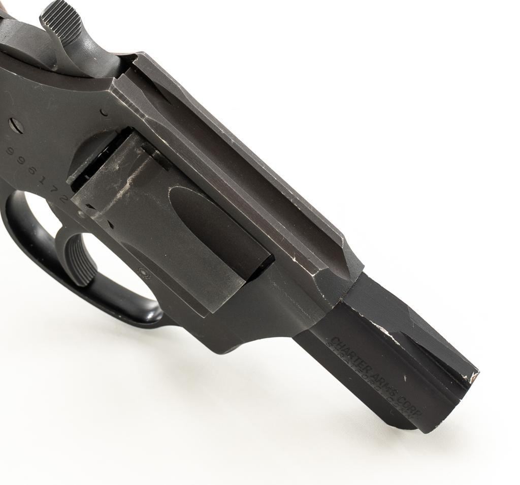Charter Arms Off-Duty Double Action Revolver, #996172, .38 Spec. cal., 5-shot, 2'' barrel, matte black finish, smooth hardwood grips with Charter Arms medallions, standard fixed sights. Revolver is in very good overall condition, metal with general small surface nicks, scratches, and edge wear, approx. 93% finish remains. Grips rate very good+; left grip with a few handling marks above the medallion and along the back edge. Crisp action; near excellent bore. Est.: $125-$250. (Modern/PPT)