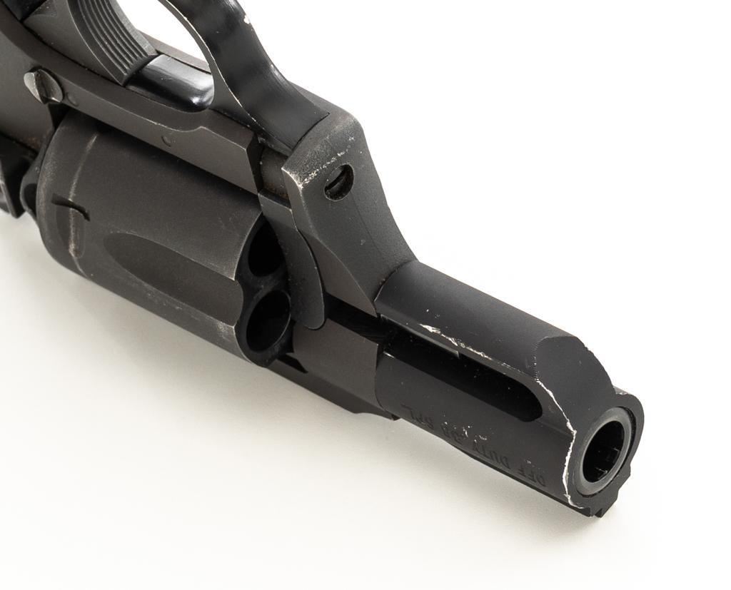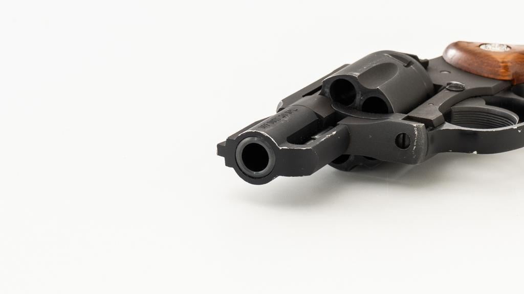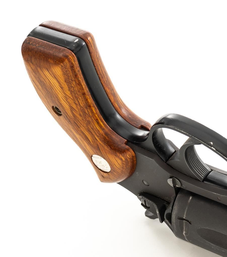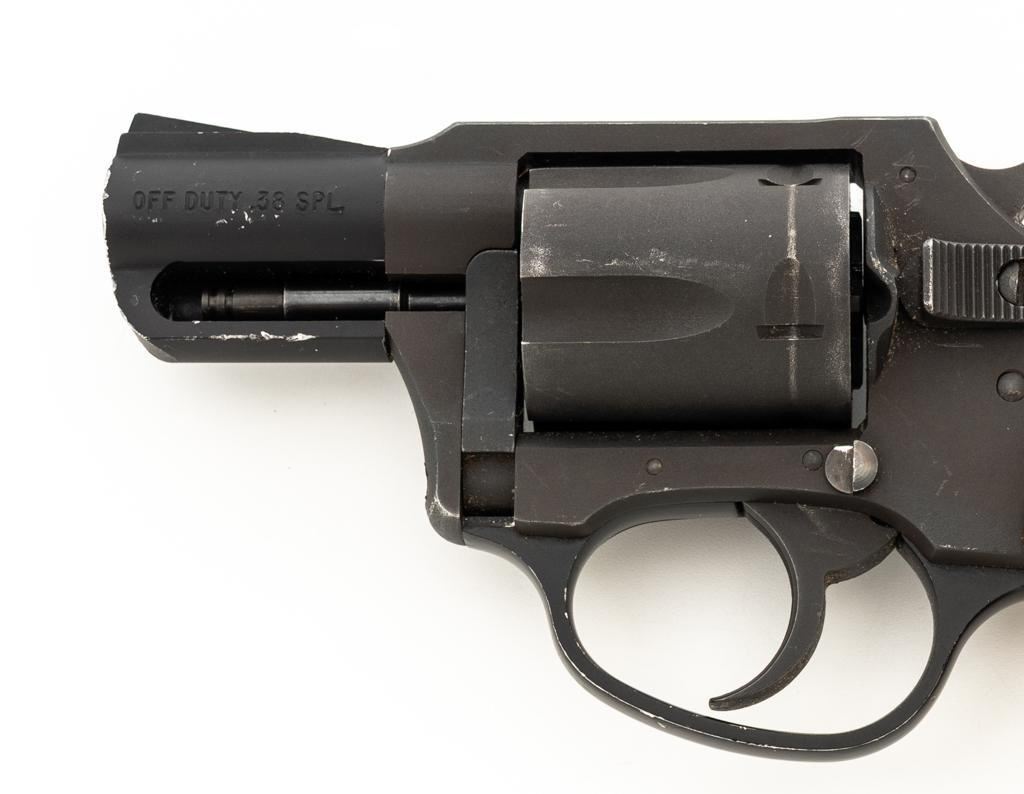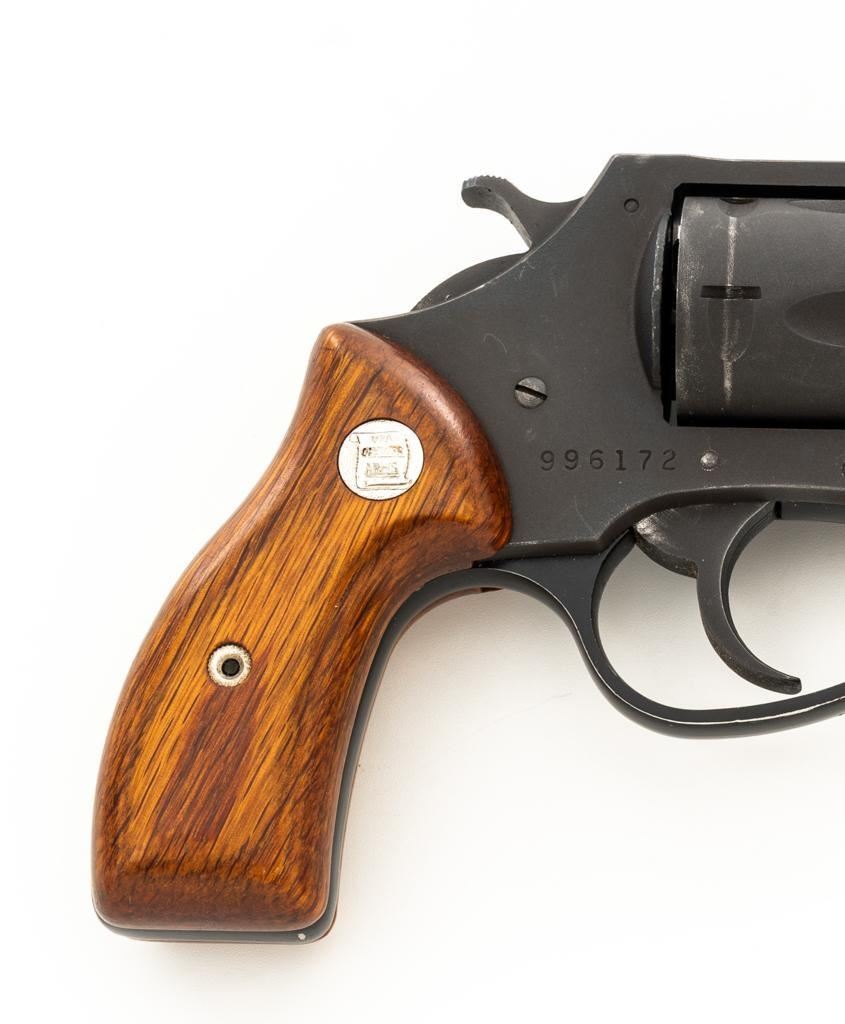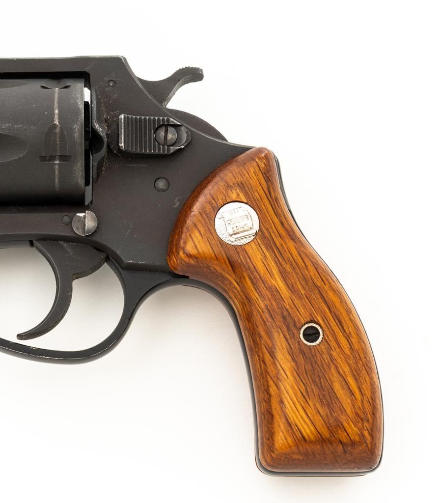Charter Arms Off-Duty Double Action Revolver, #996172, .38 Spec. cal., 5-shot, 2'' barrel, matte black finish, smooth hardwood grips with Charter Arms medallions, standard fixed sights. Revolver is in very good overall condition, metal with general small surface nicks, scratches, and edge wear, approx. 93% finish remains. Grips rate very good+; left grip with a few handling marks above the medallion and along the back edge. Crisp action; near excellent bore. Est.: $125-$250. (Modern/PPT)