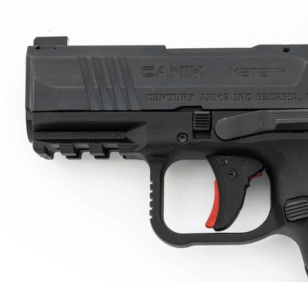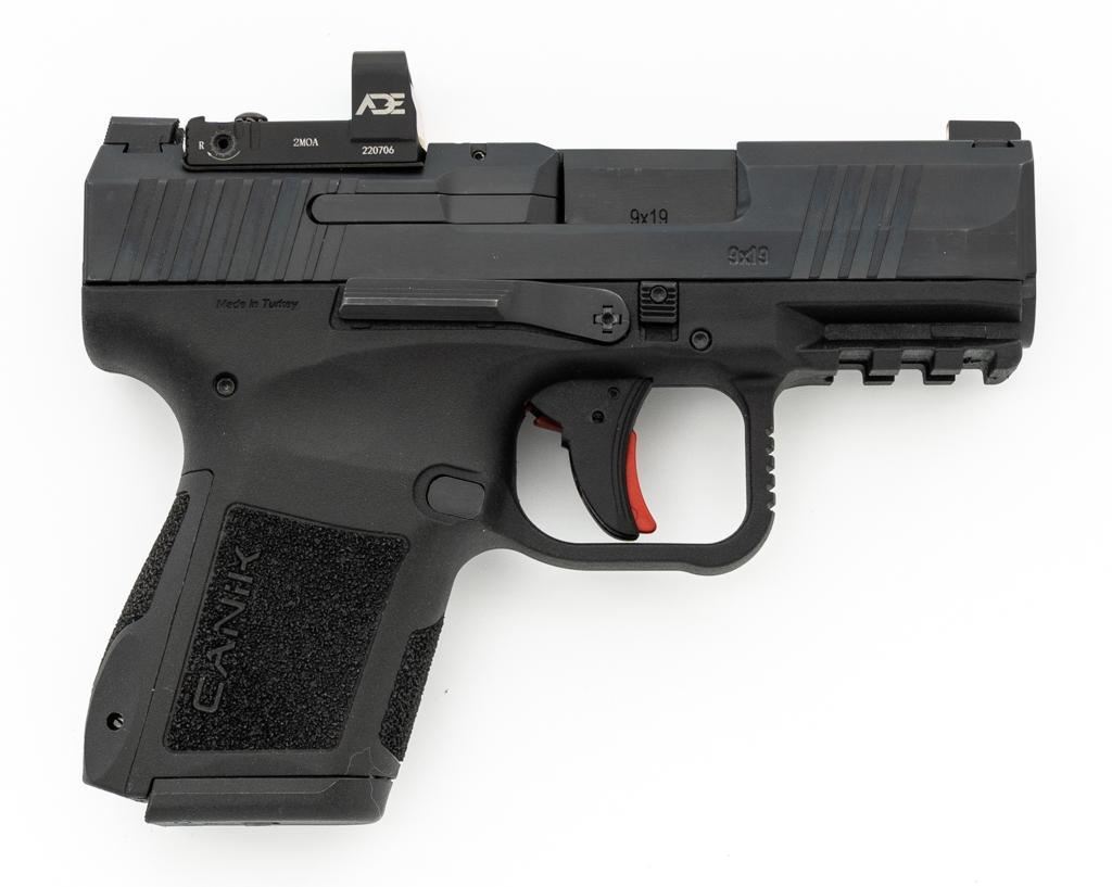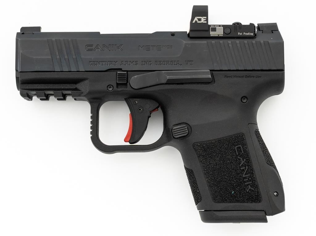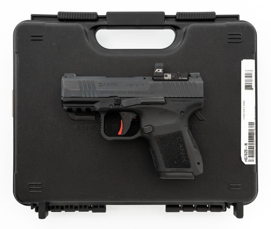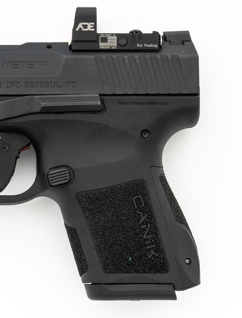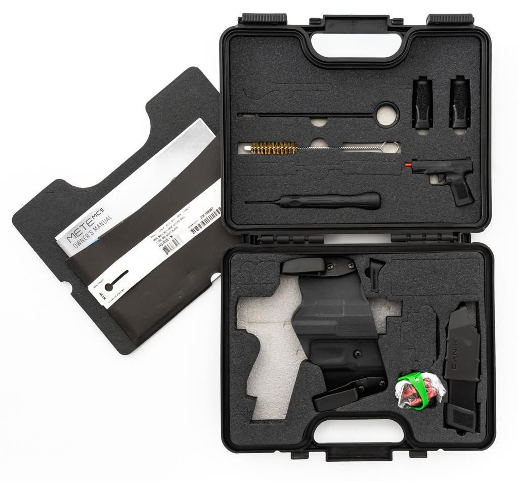 Canik Mete MC9 Semi-Automatic Pistol, #23CT68987, 9mm cal., 3.2'' barrel, matte black finish, textured integral synthetic grip, dovetailed white dot blade front and fixed square-notch rear sight, with an ADE red dot sight added at the rear, accessory rail on the underside of the frame, with one 12-round and one 15-round Canik magazine. Marked ''MADE IN TURKEY'' on right side of the grip and import marked on the left side of the frame. Includes factory plastic hardcase with matching end label, Canik IWB synthetic open-top holster, instruction manual, warranty information, cleaning accessories, backstrap grip inserts, and lock. Pistol is in excellent overall condition, appearing as new, retaining approx. 99%+ factory finish. Action is crisp and functions smoothly. Bore is mirror bright with excellent rifling. Est.: $400-$600. (Modern) (Not available to Calif. residents.) (Magazines with a capacity greater than 10-rounds are not available for sale to CA residents or other states where such items are prohibited.)