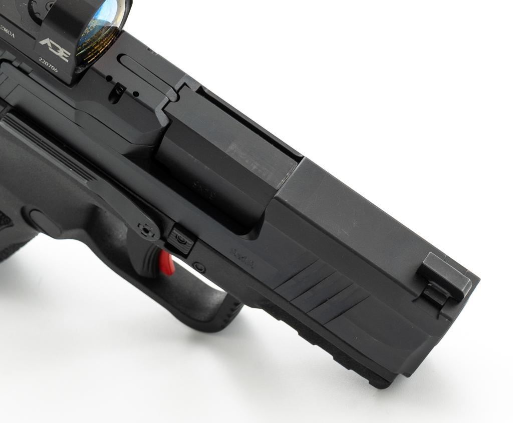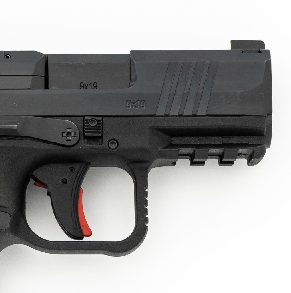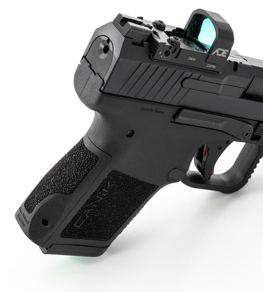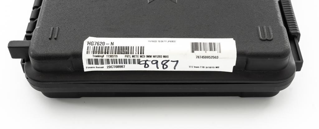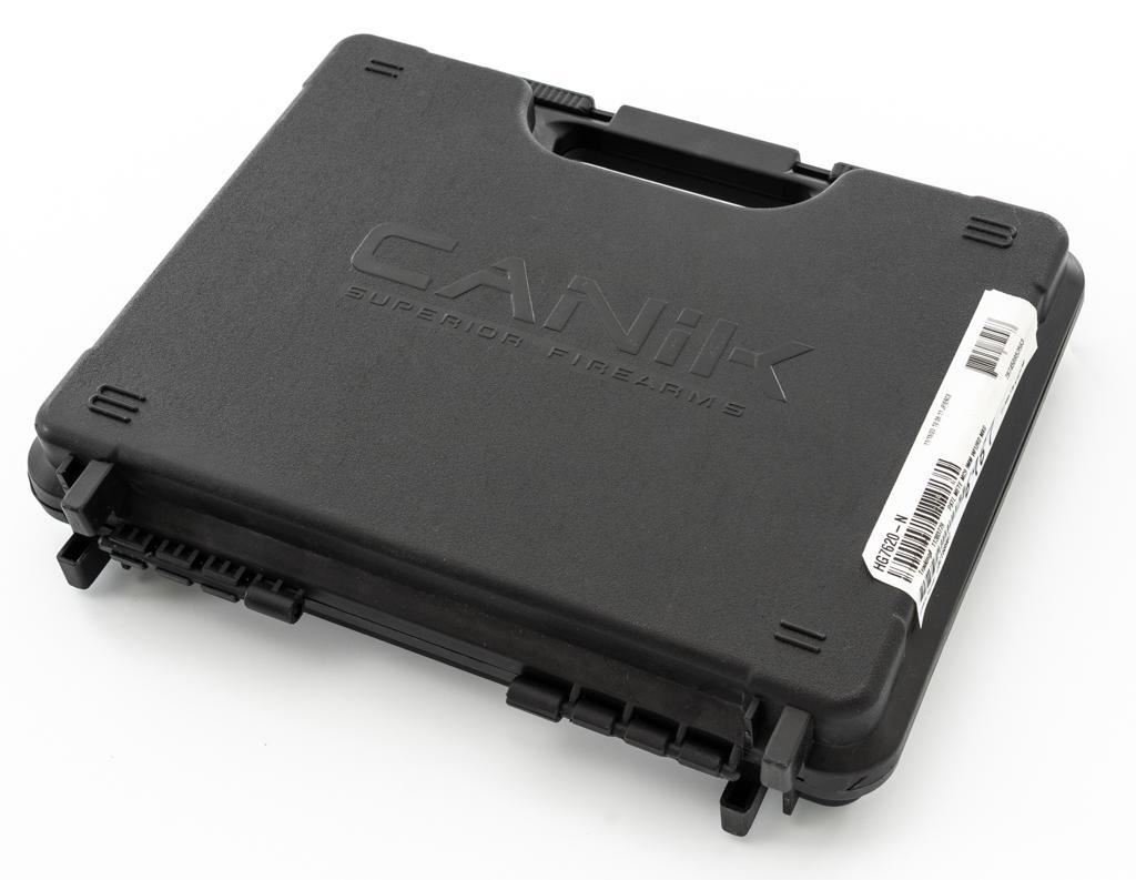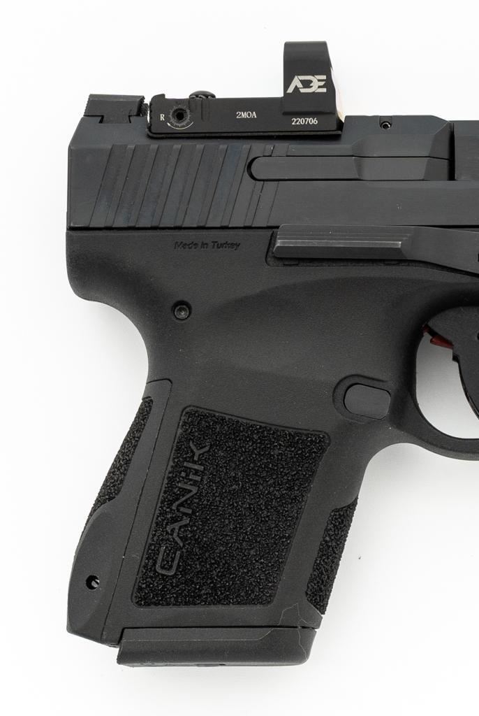 Canik Mete MC9 Semi-Automatic Pistol, #23CT68987, 9mm cal., 3.2'' barrel, matte black finish, textured integral synthetic grip, dovetailed white dot blade front and fixed square-notch rear sight, with an ADE red dot sight added at the rear, accessory rail on the underside of the frame, with one 12-round and one 15-round Canik magazine. Marked ''MADE IN TURKEY'' on right side of the grip and import marked on the left side of the frame. Includes factory plastic hardcase with matching end label, Canik IWB synthetic open-top holster, instruction manual, warranty information, cleaning accessories, backstrap grip inserts, and lock. Pistol is in excellent overall condition, appearing as new, retaining approx. 99%+ factory finish. Action is crisp and functions smoothly. Bore is mirror bright with excellent rifling. Est.: $400-$600. (Modern) (Not available to Calif. residents.) (Magazines with a capacity greater than 10-rounds are not available for sale to CA residents or other states where such items are prohibited.)