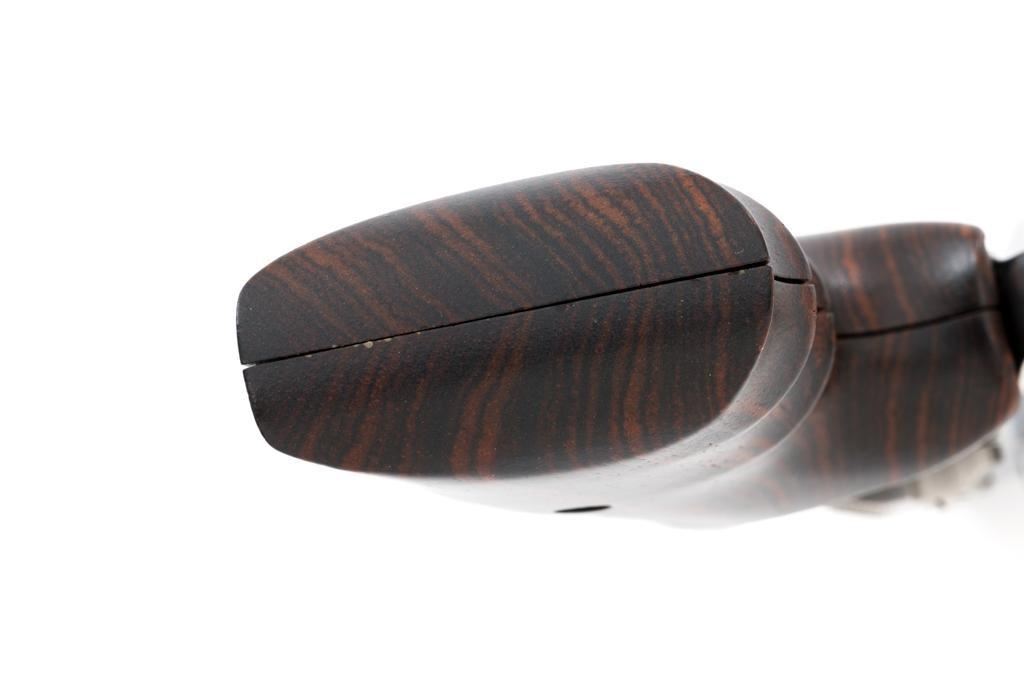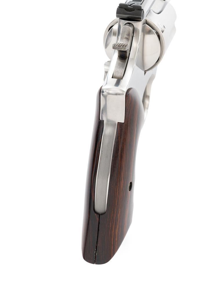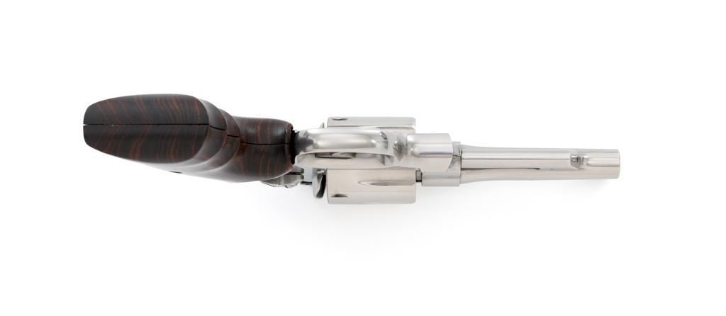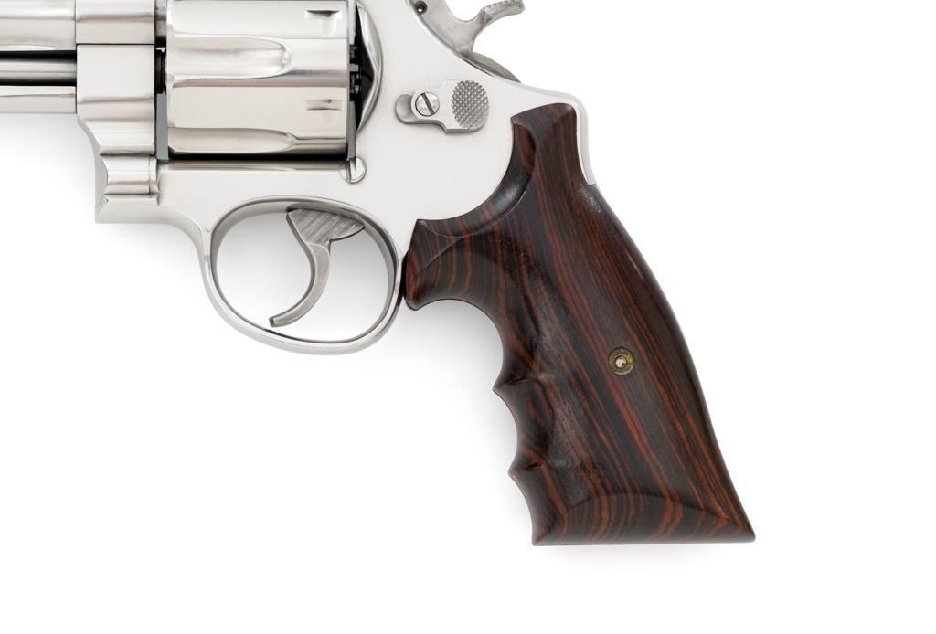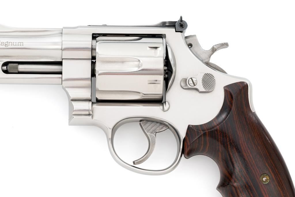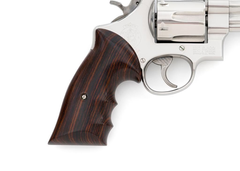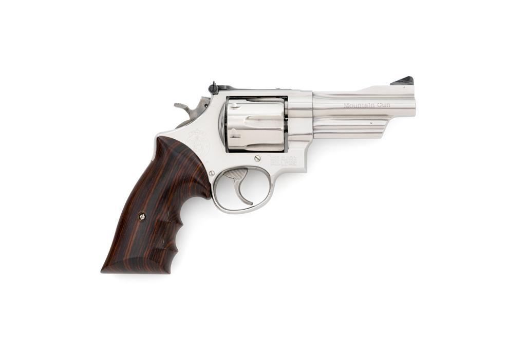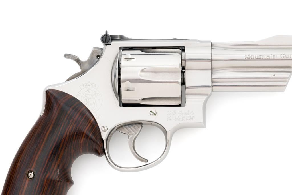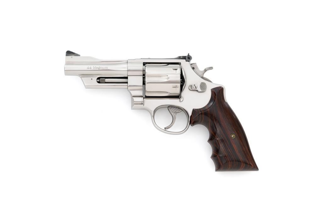 Smith & Wesson Model 629-4 ''Mountain Gun'' Double Action Revolver, #BSU6499, .44 Mag. cal., 4'' barrel, satin stainless finish, attractive aftermarket smooth dark wood grips with finger grooves, ramped blade front sight and adjustable square-notched rear sight. Condition is near excellent. Metal surfaces with general light micro scratching. Grips show normal signs of handling and light use. Action is smooth with a solid lock-up. Bore is bright with well-defined rifling. Est.: $900-$1,200. (Modern)(Not available to Calif. Residents)