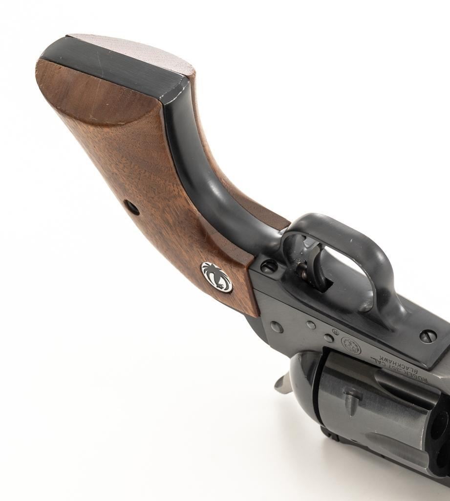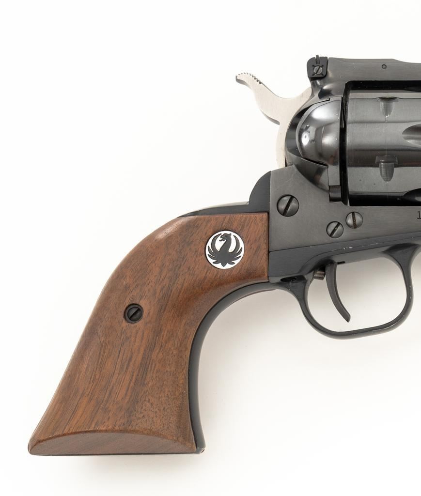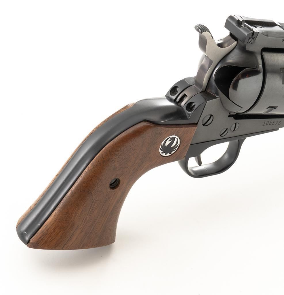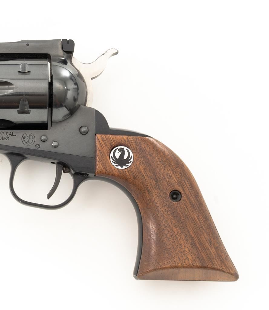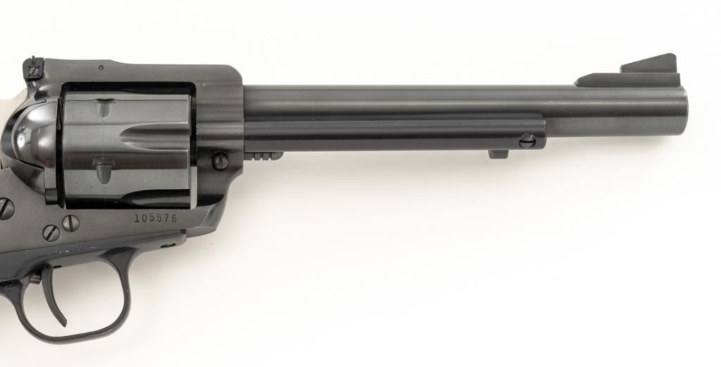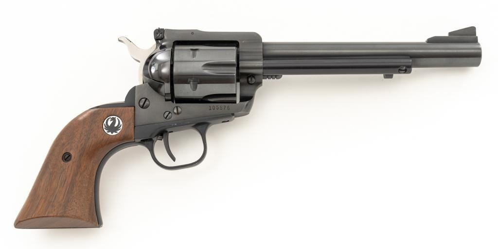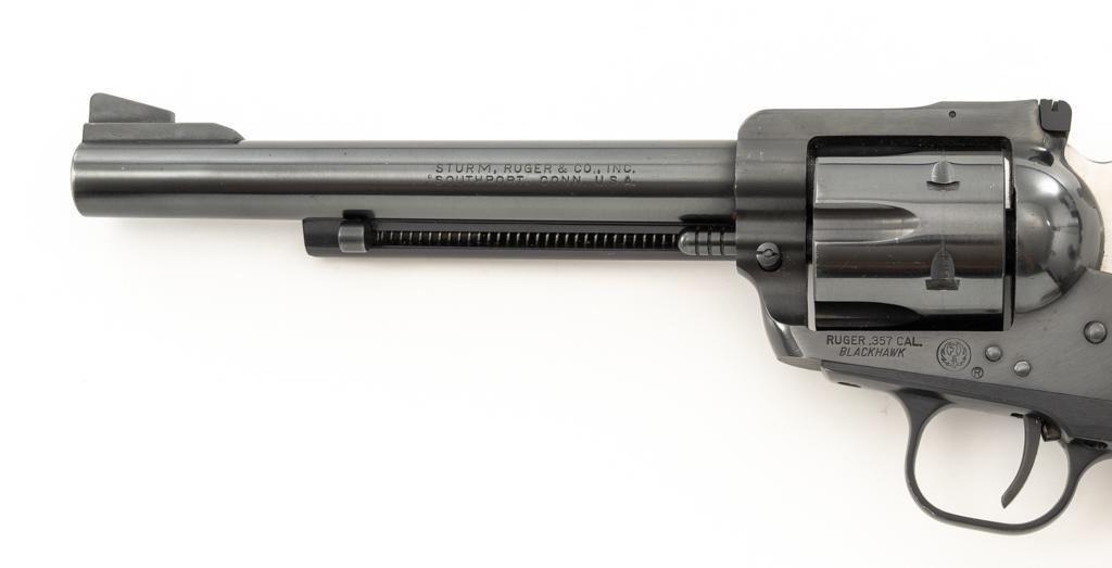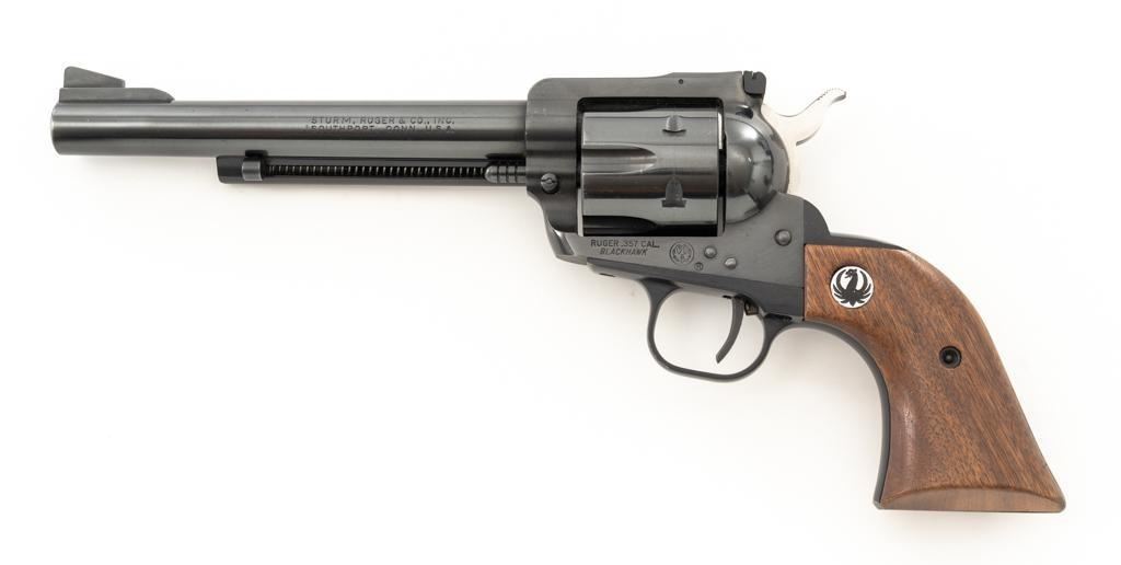 Ruger Old Model Blackhawk Single Action Revolver, #105576, .357 mag. cal, 6.5'' barrel, blue finish, smooth walnut grips with Ruger ''Black Eagle'' medallions, blade front sight, and square-notched rear sight is adjustable for both windage and elevation. Mfg'd 1967. Metal is near excellent, retaining approx. 98% factory blue, with only light marks from handling and use. Cylinder has a very faint index line. Grips are very good, with a few shallow indentations and light scratches. Factory lettering is crisp and clear. Action locks up tight. Bore is bright with excellent rifling. The transfer bar conversion has not been installed; this is still in its original ''3 Screw'' configuration. Est.: $400-$600. (C&R/PPT)