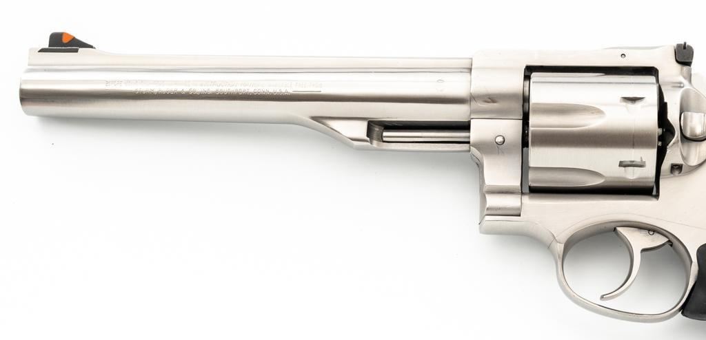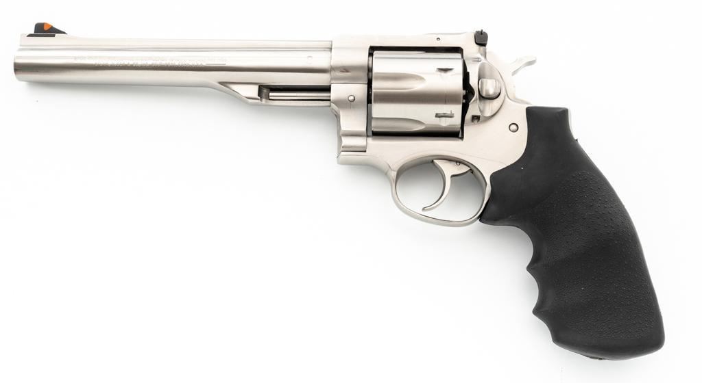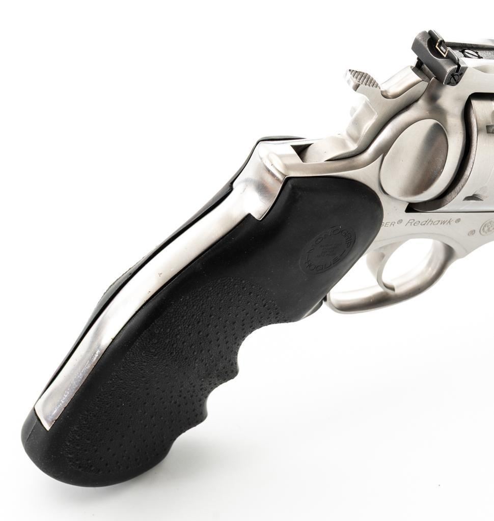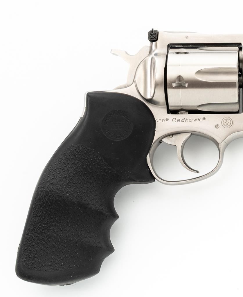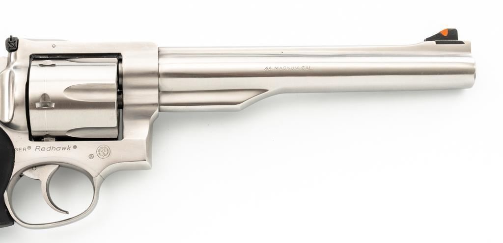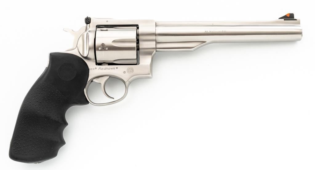 Ruger Redhawk Double Action Revolver, #500-42508, .44 Mag. cal., 7.5'' ribbed barrel, stainless steel finish, textured rubber Hogue Monogrip one-piece grip, ramped blade front sight with orange insert, and adjustable white outline square-notch rear sight. Mfg'd 1982. Revolver is in very good overall condition, with moderate scrapes and scuffs along the barrel; intermittent light scuffs and scratches on the frame. Grips are in near excellent condition. Action functions well and locks up securely. Bore is bright and rates near excellent, with well-defined rifling. Est.: $500-$700. (Modern/PPT)