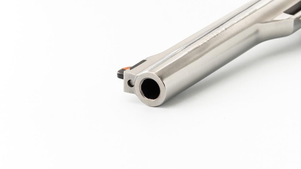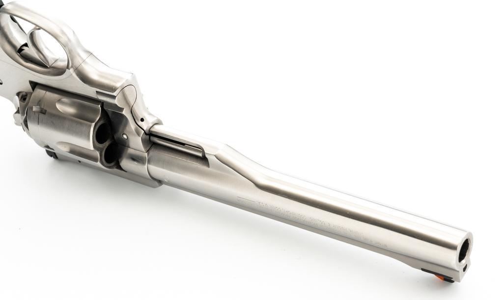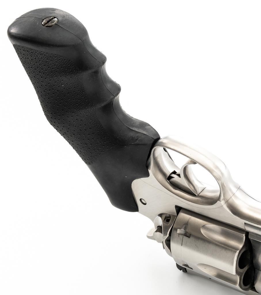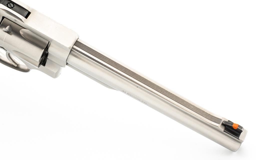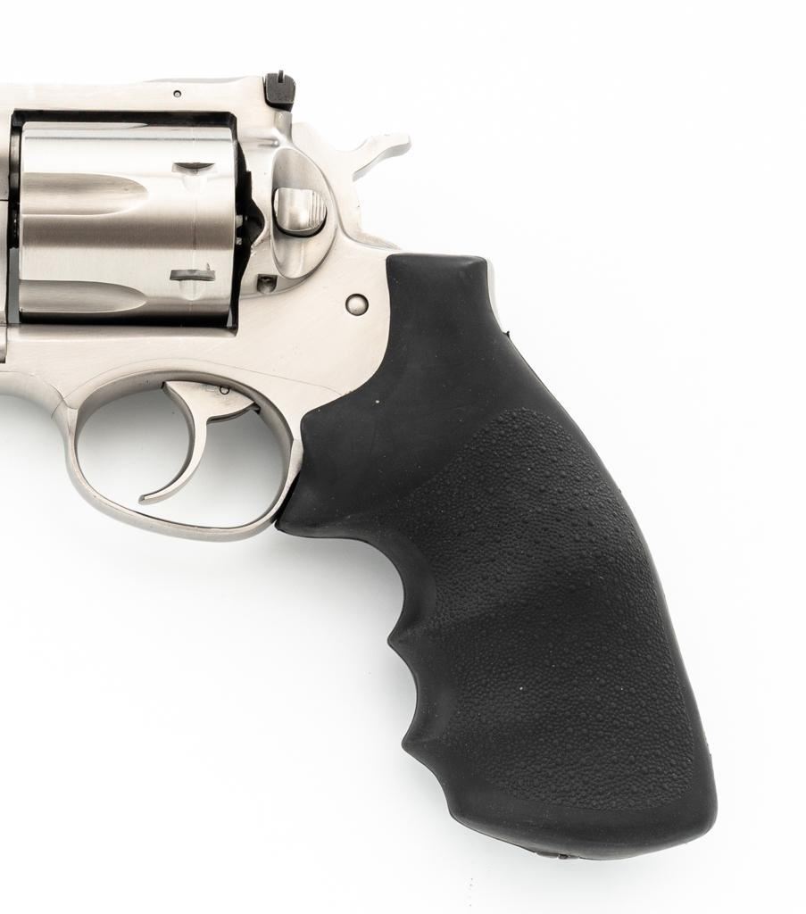 Ruger Redhawk Double Action Revolver, #500-42508, .44 Mag. cal., 7.5'' ribbed barrel, stainless steel finish, textured rubber Hogue Monogrip one-piece grip, ramped blade front sight with orange insert, and adjustable white outline square-notch rear sight. Mfg'd 1982. Revolver is in very good overall condition, with moderate scrapes and scuffs along the barrel; intermittent light scuffs and scratches on the frame. Grips are in near excellent condition. Action functions well and locks up securely. Bore is bright and rates near excellent, with well-defined rifling. Est.: $500-$700. (Modern/PPT)