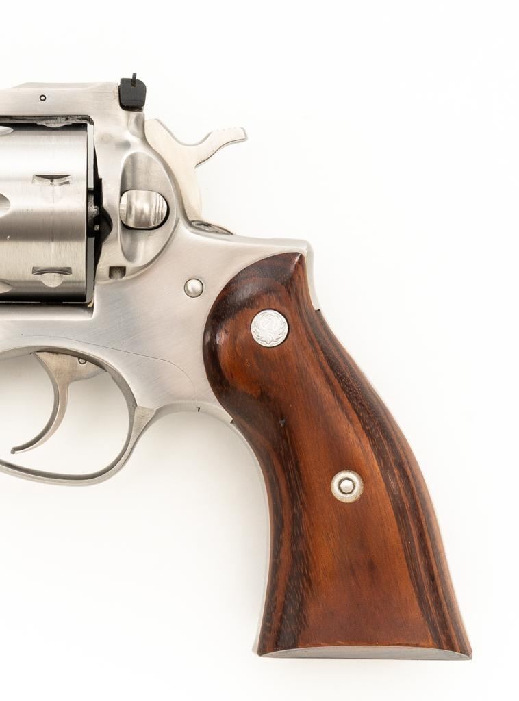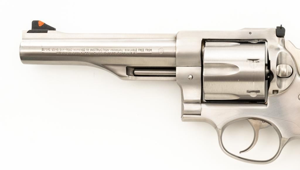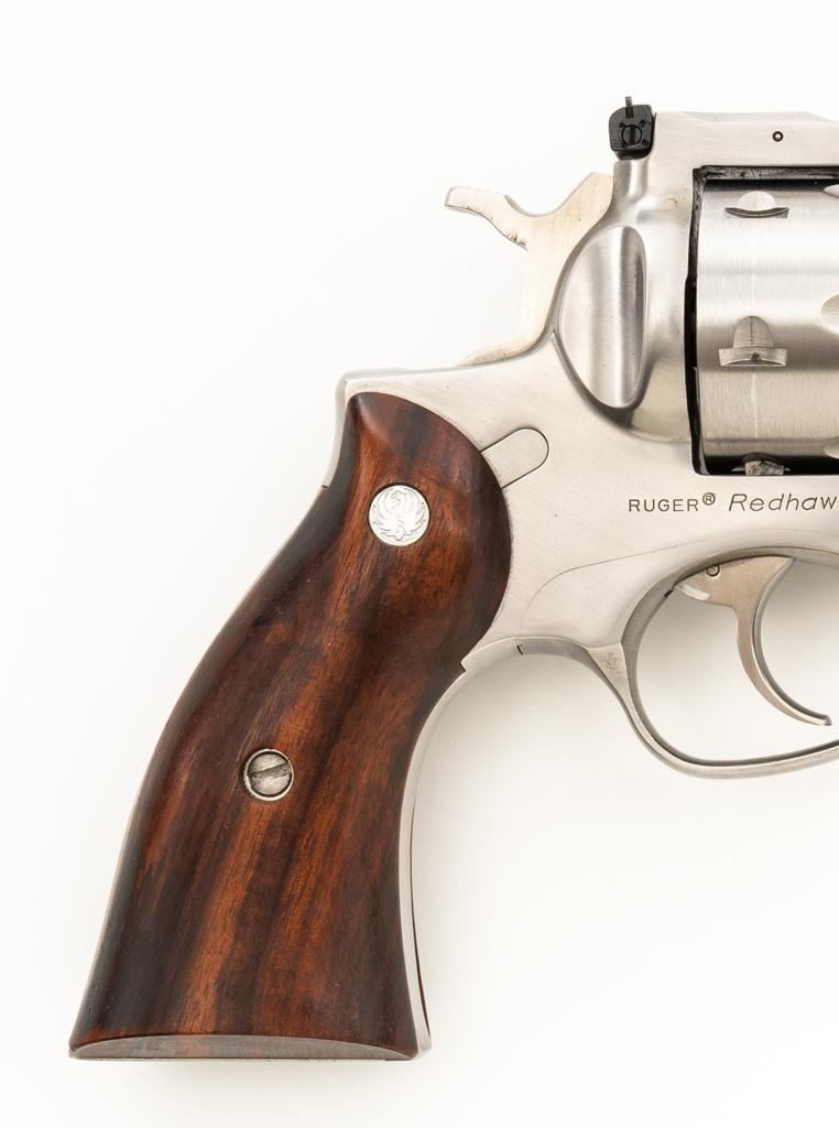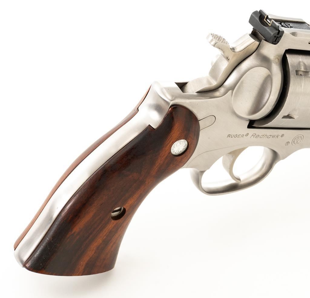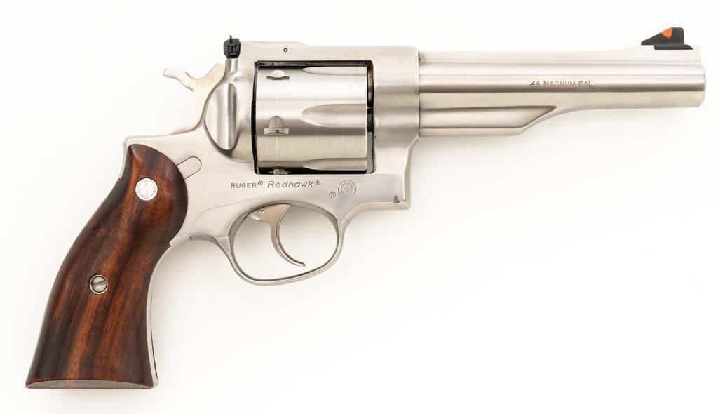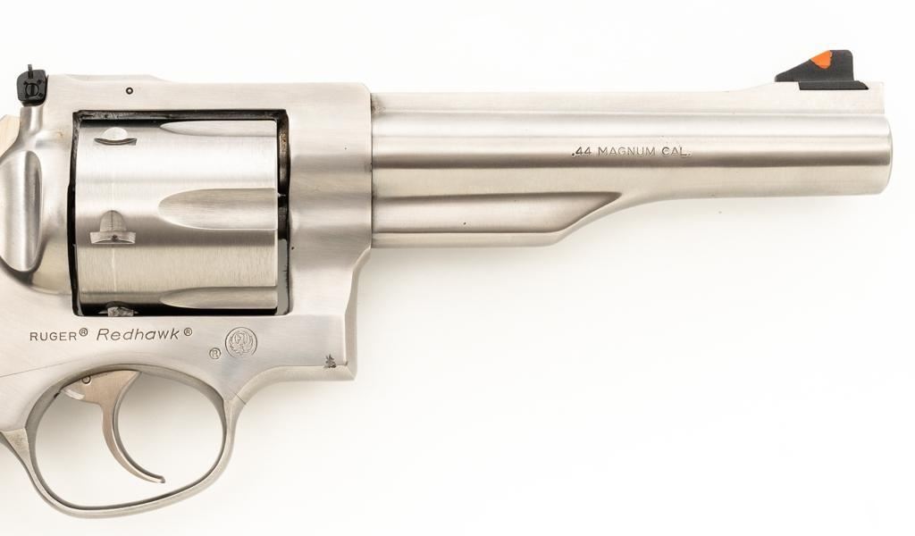 Ruger Redhawk Double Action Revolver, #501-51433, .44 Mag. cal., 5.5'' ribbed barrel, satin stainless steel finish, smooth rosewood two-piece grips with Ruger medallions, red insert ramped blade front sight, and adjustable white outline square-notch rear sight. Mfg'd 1985. Revolver is in excellent overall condition, showing only light handling marks, and a faint index line on the cylinder. Factory markings are crisp. Grips are excellent with bright medallions. Action functions smoothly and locks up securely. Bore is excellent with crisp rifling. Est.: $700-$900. (Modern/PPT)