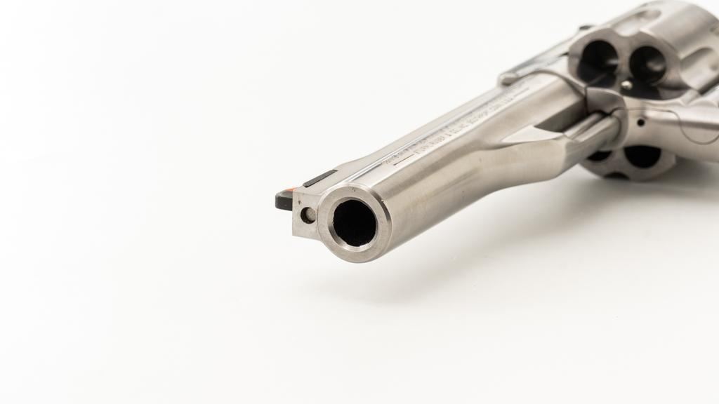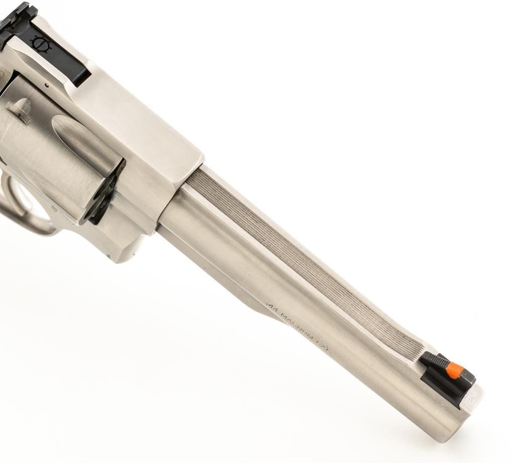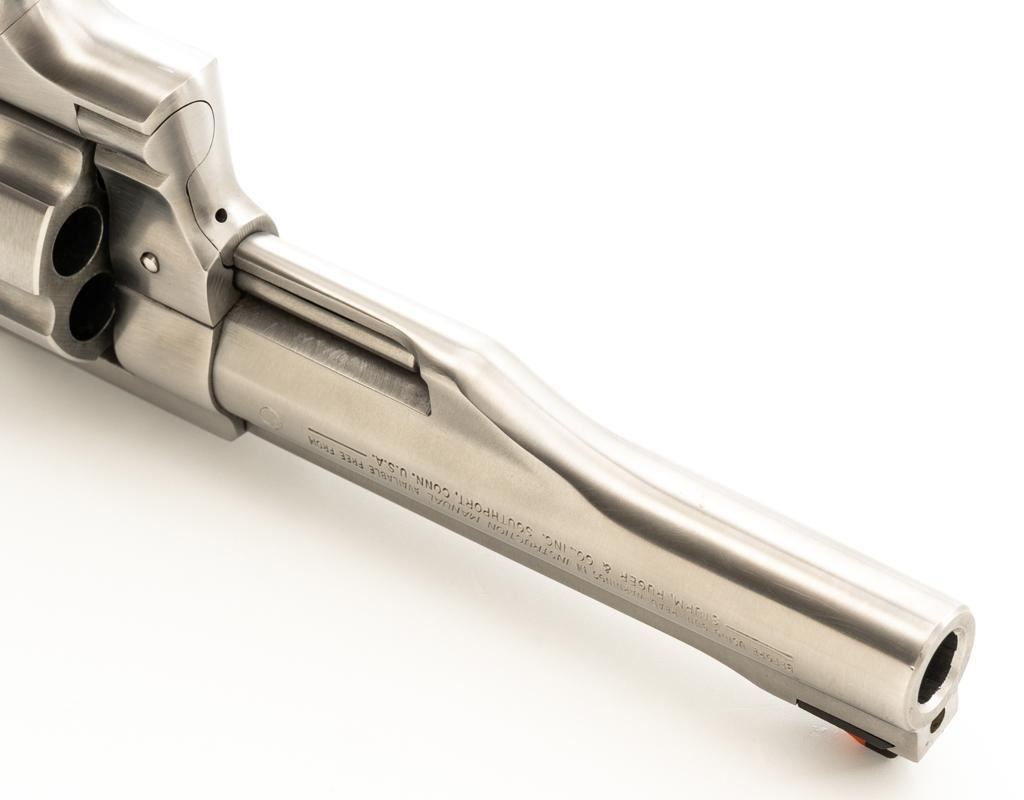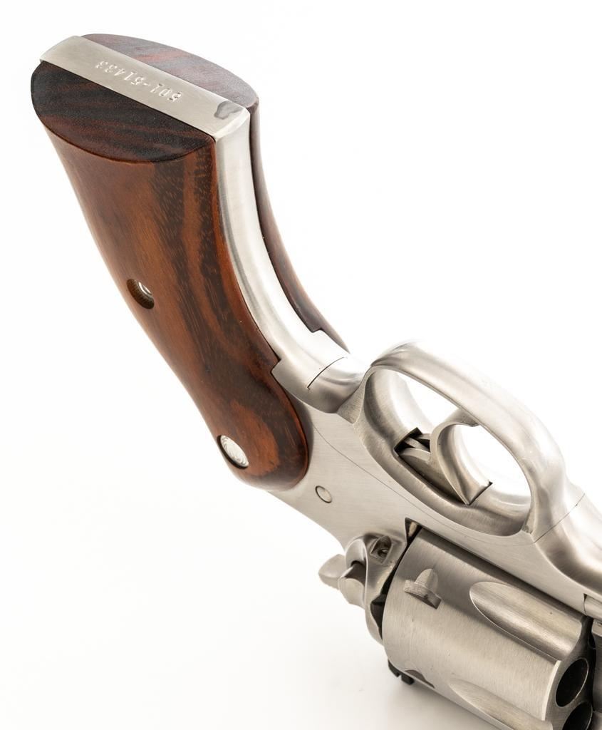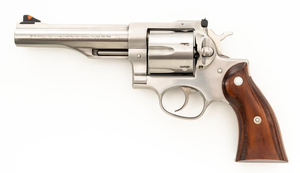Ruger Redhawk Double Action Revolver, #501-51433, .44 Mag. cal., 5.5'' ribbed barrel, satin stainless steel finish, smooth rosewood two-piece grips with Ruger medallions, red insert ramped blade front sight, and adjustable white outline square-notch rear sight. Mfg'd 1985. Revolver is in excellent overall condition, showing only light handling marks, and a faint index line on the cylinder. Factory markings are crisp. Grips are excellent with bright medallions. Action functions smoothly and locks up securely. Bore is excellent with crisp rifling. Est.: $700-$900. (Modern/PPT)