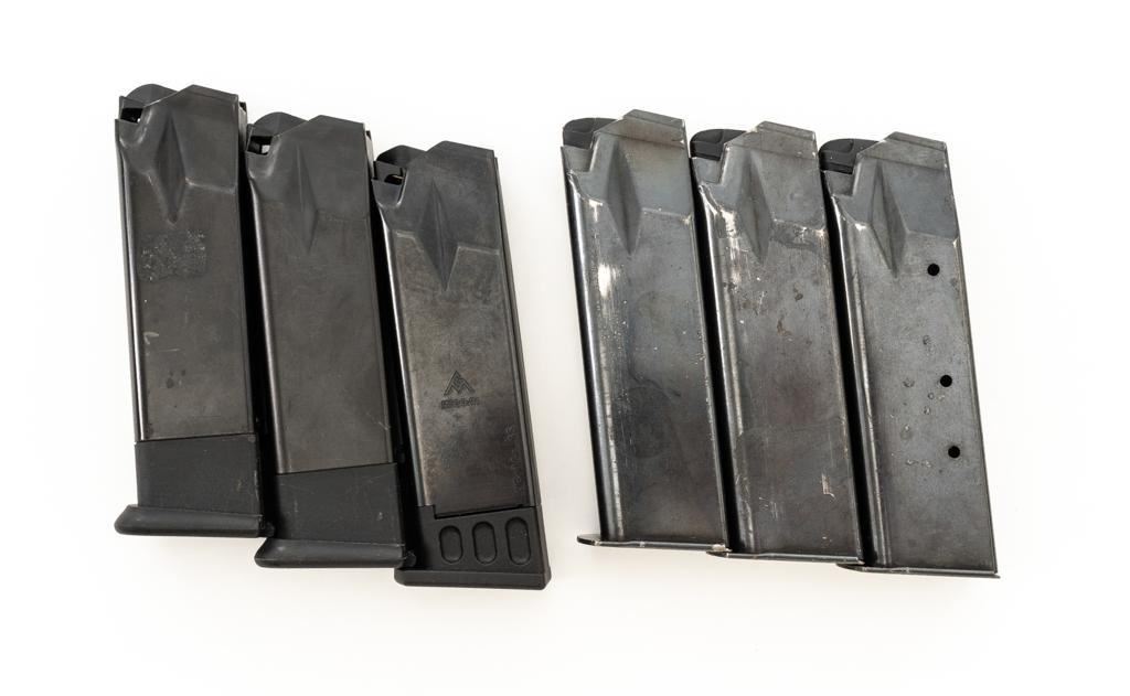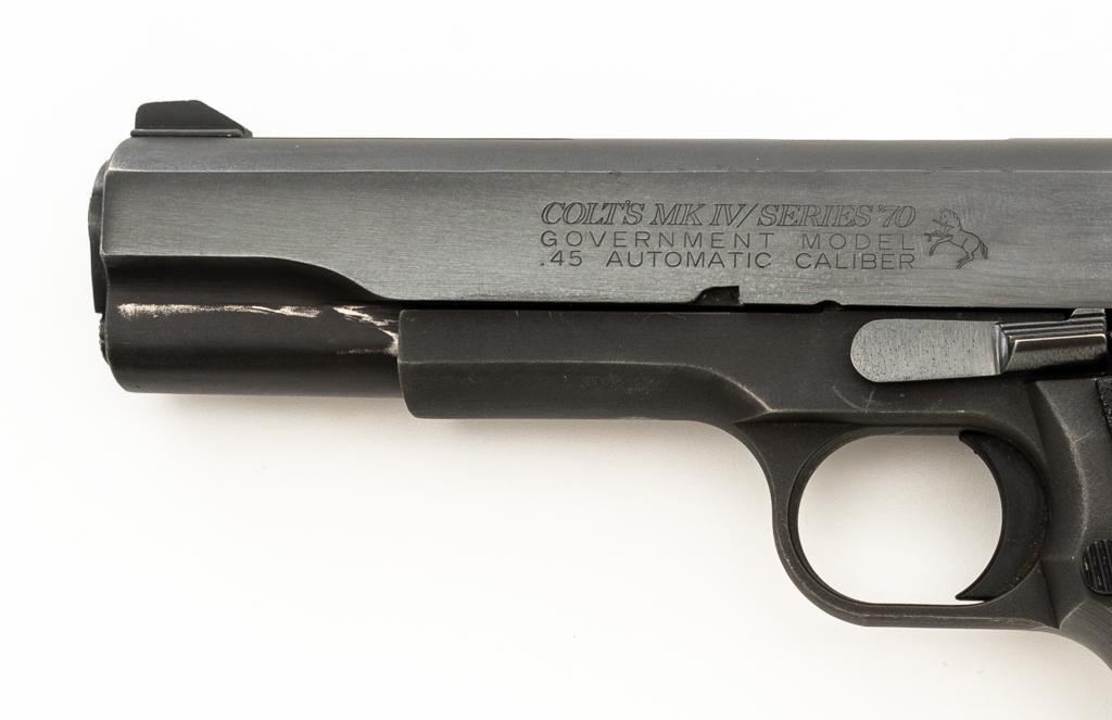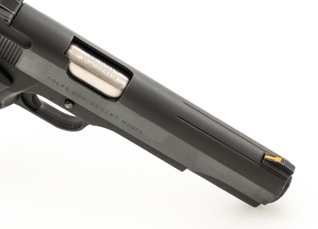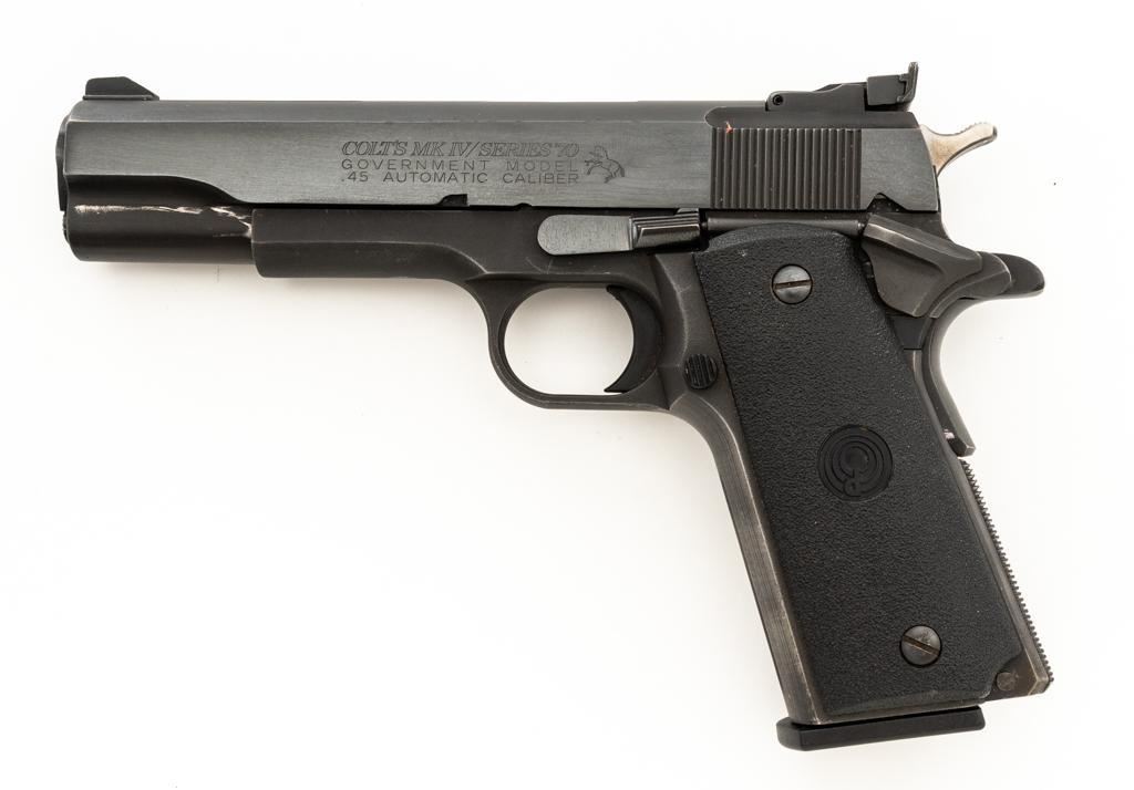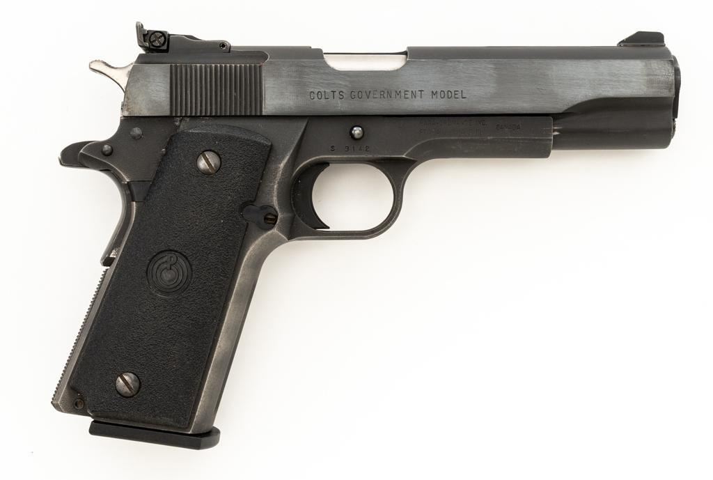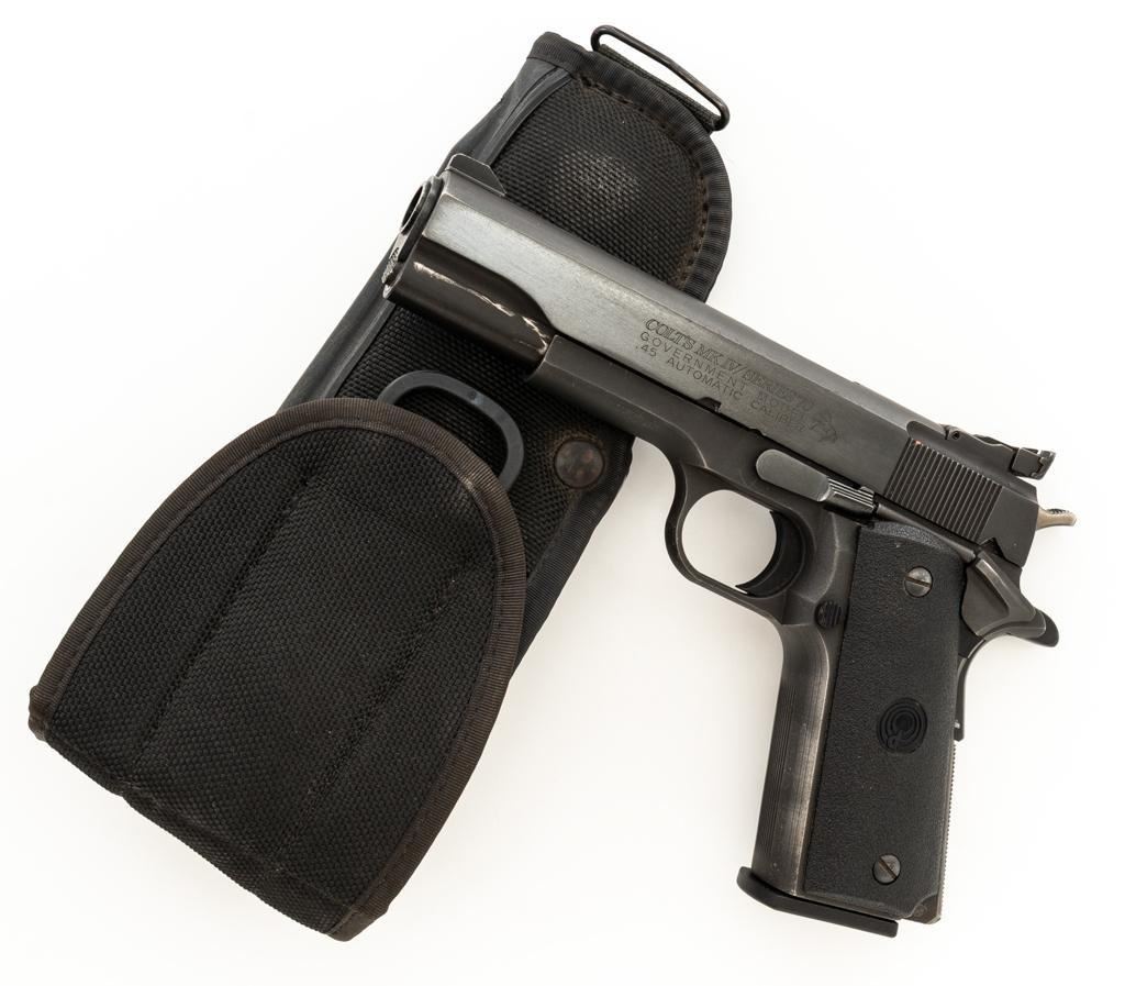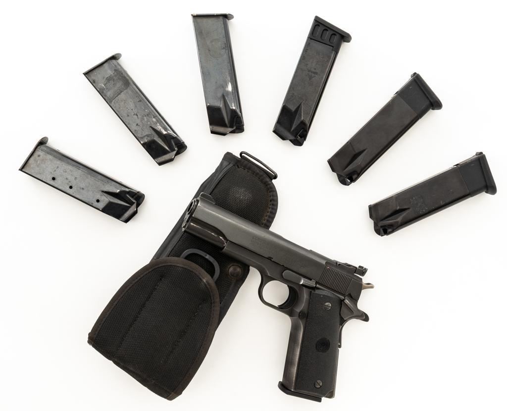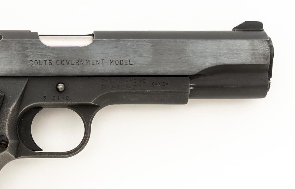 Custom Para-Ordnance 1911 Semi-Automatic Pistol with Colt Slide, #S3142, .45 ACP cal., 5'' barrel, blue finish, textured plastic two-piece Para Ordnance grips, Colt Series 70 Government Model slide, orange blade front, and white outline adjustable square-notch rear sight. Includes a Bianchi International ballistic nylon right hand flap holster, in very good condition. This pistol also comes with a total of seven (7) magazines; three (3) 14-round Para-Ordnance magazines, two (2) 10-round Mec-Gar magazines, and two (2) unmarked 10-round magazines. Pistol is in very good+ overall condition, retaining approx. 90%-95% blue finish on the slide. Frame retains approx. 88%-90% parkerized finish, with edgewear and handling marks. Grips with scattered minor handling marks. Action functions smoothly. Bore is very good with defined rifling. Est.: $600-$800. (Modern/PPT) (Magazines with a capacity greater than 10-rounds are not available for sale to CA residents or other states where such items are prohibited.)