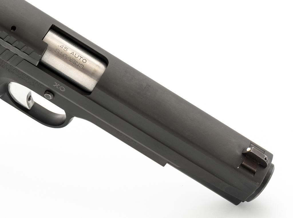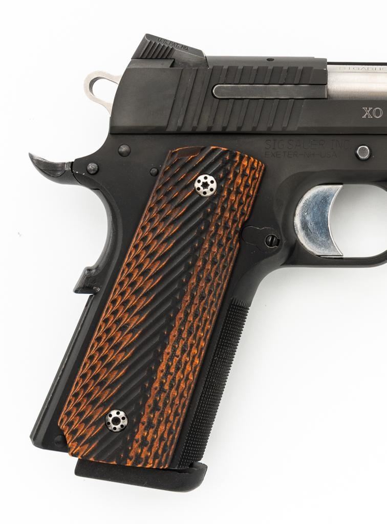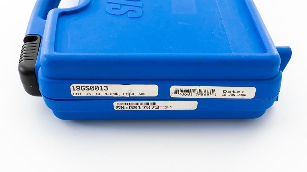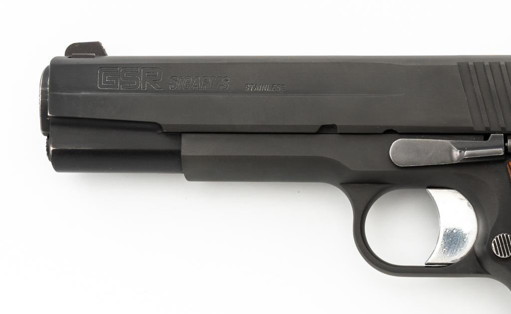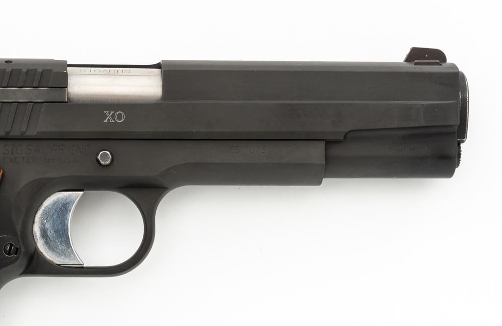 Sig Sauer Model 1911 XO GSR Semi-Automatic Pistol, #GS17073, .45 ACP cal, 5'' match grade barrel, black Nitron finish, textured G-10 two-piece grips, three-white dot sighting system, skeletonized hammer, with two (2) 8-round stainless steel magazine. Includes factory hardcase with matching end label, instruction manual, warranty information, and cable lock. Pistol is in excellent overall condition, retaining approx. 98%-99% factory finish, with modest wear at the muzzle, and intermittent light handling marks. Grips are in excellent condition with aggressive texture and good fit. Action is crisp and locks up securely. Bore is excellent with sharp rifling. Est.: $700-$900. (Modern)
