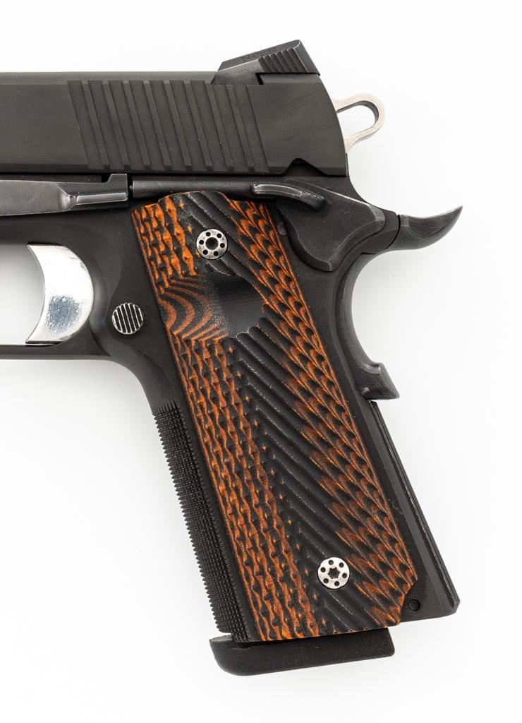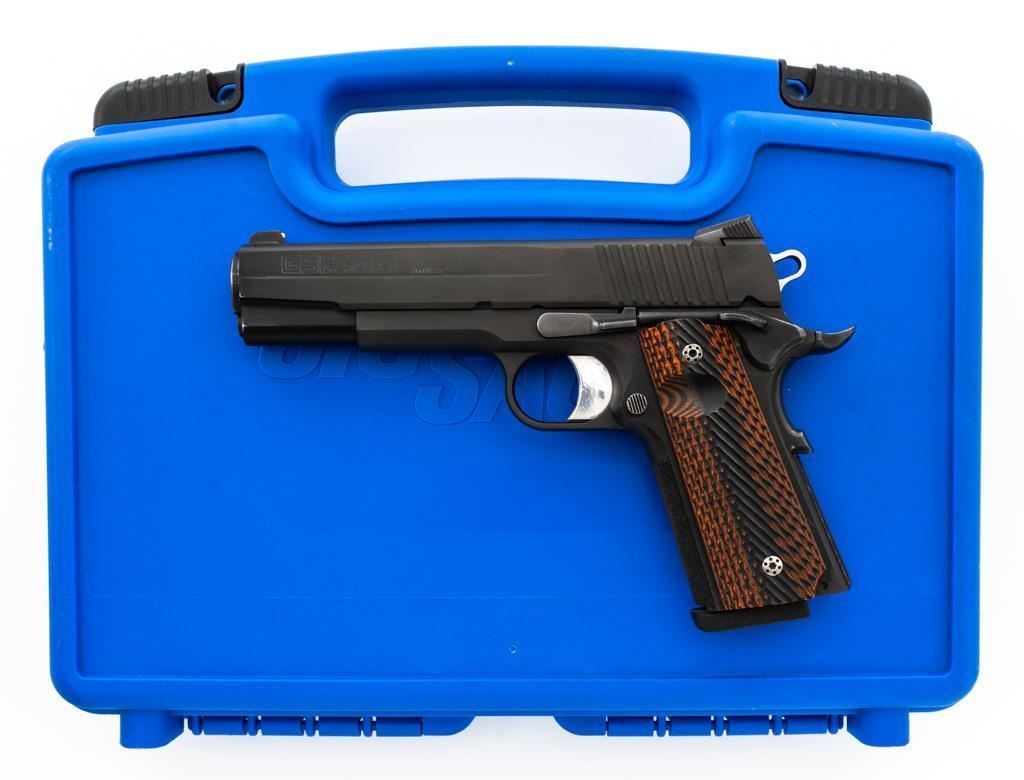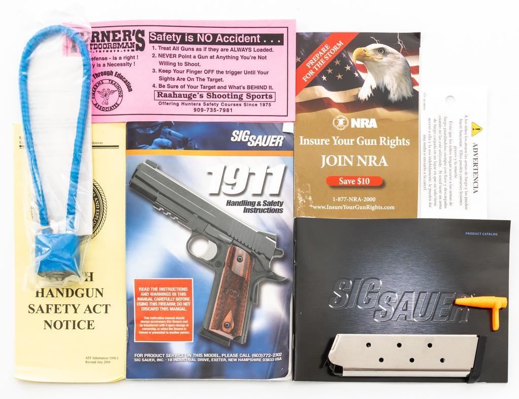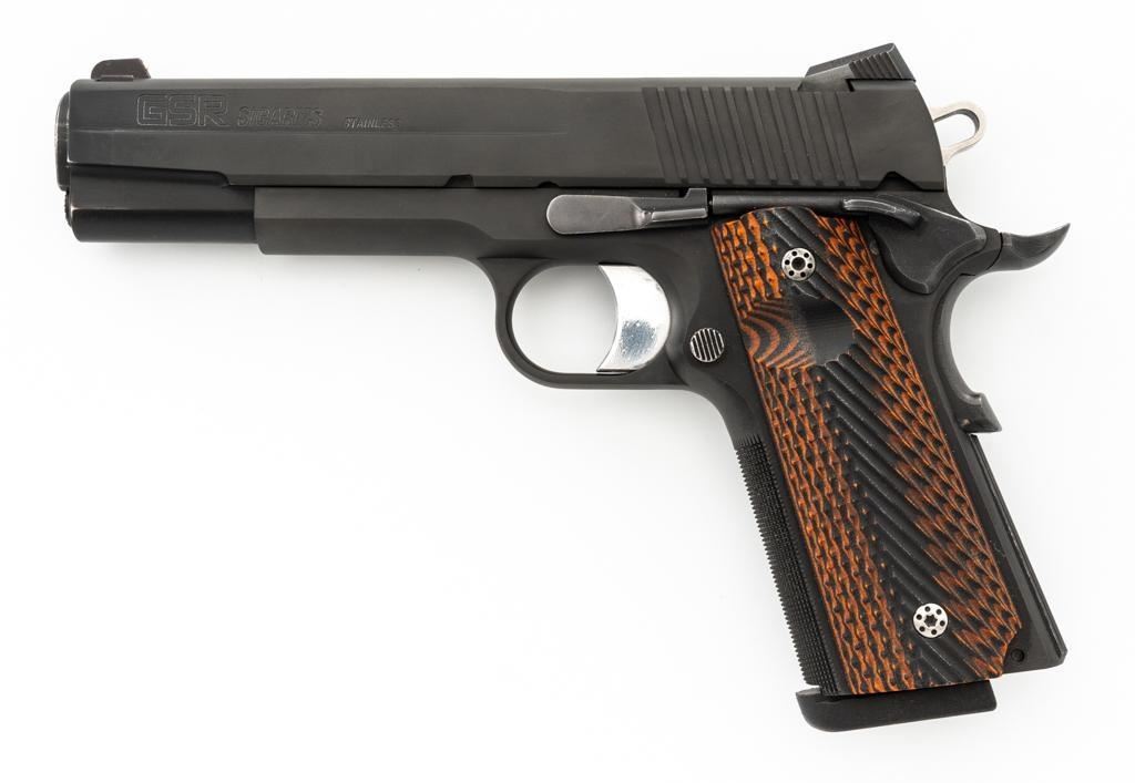 Sig Sauer Model 1911 XO GSR Semi-Automatic Pistol, #GS17073, .45 ACP cal, 5'' match grade barrel, black Nitron finish, textured G-10 two-piece grips, three-white dot sighting system, skeletonized hammer, with two (2) 8-round stainless steel magazine. Includes factory hardcase with matching end label, instruction manual, warranty information, and cable lock. Pistol is in excellent overall condition, retaining approx. 98%-99% factory finish, with modest wear at the muzzle, and intermittent light handling marks. Grips are in excellent condition with aggressive texture and good fit. Action is crisp and locks up securely. Bore is excellent with sharp rifling. Est.: $700-$900. (Modern)