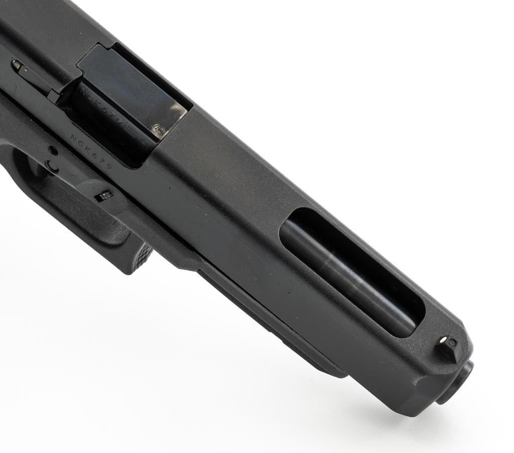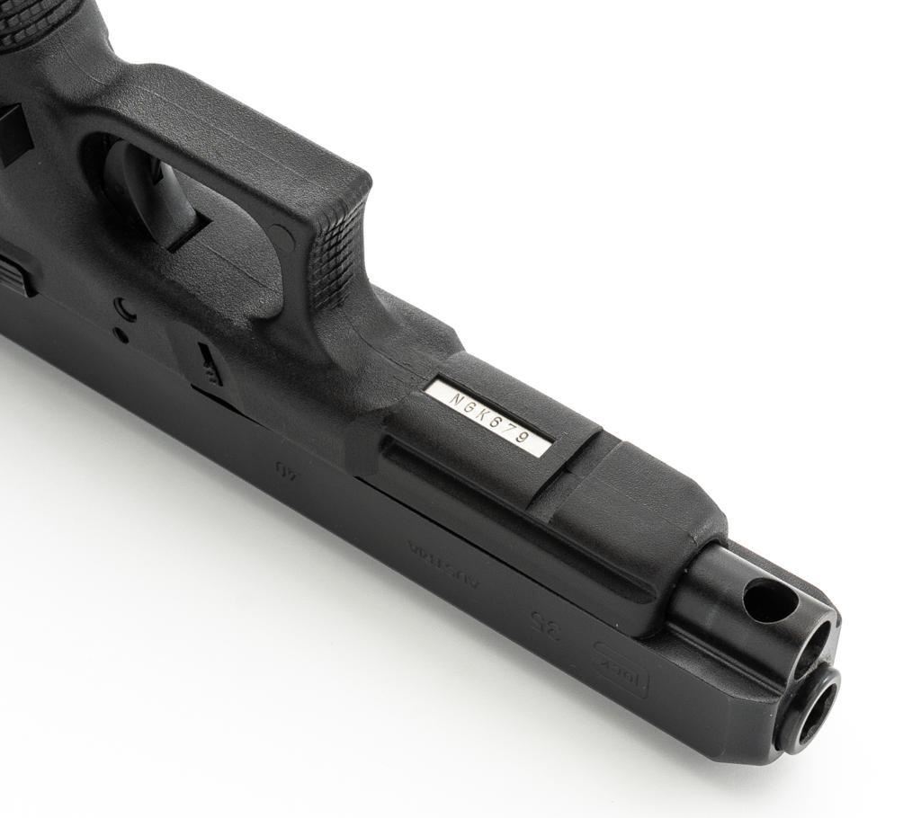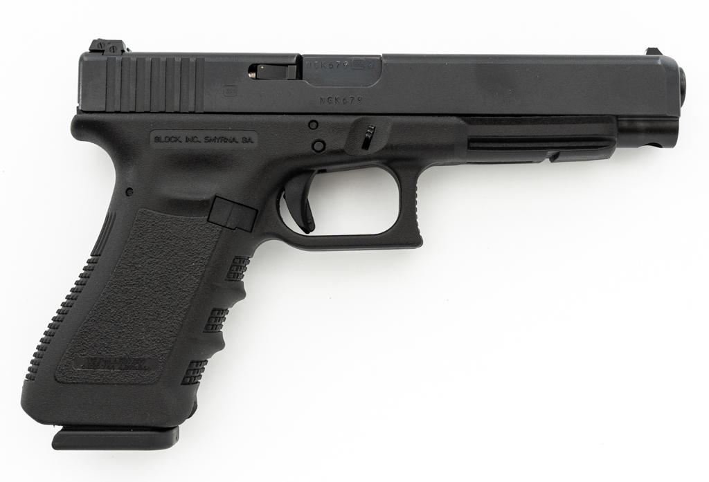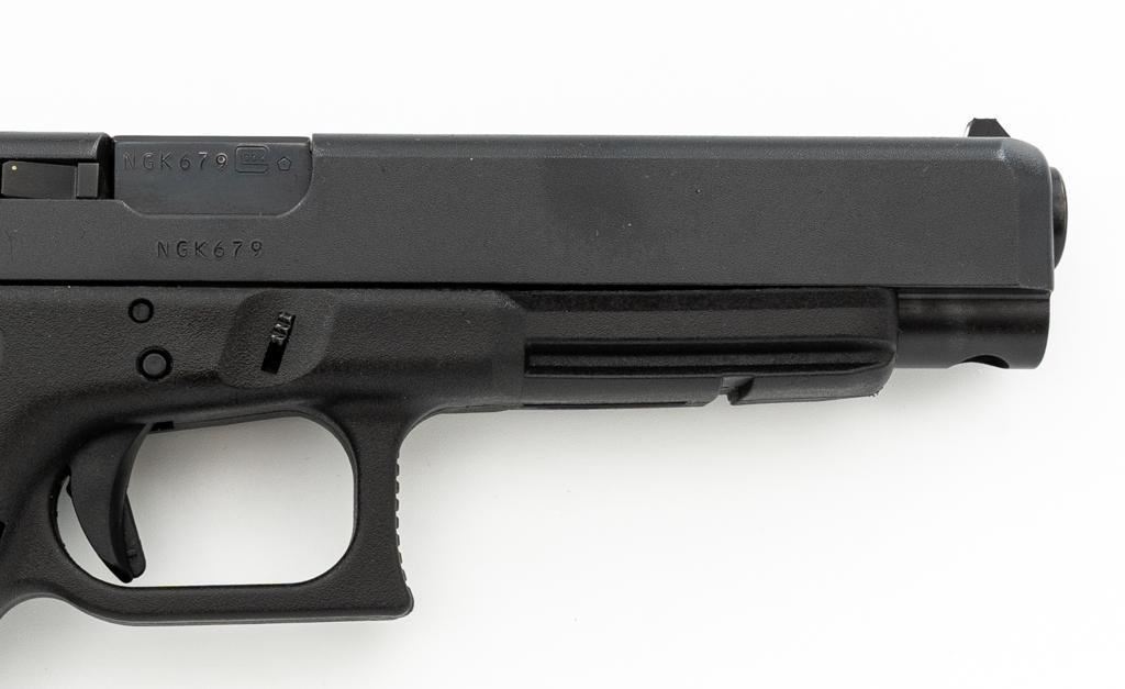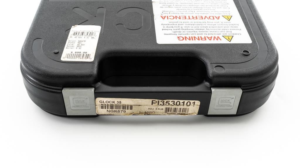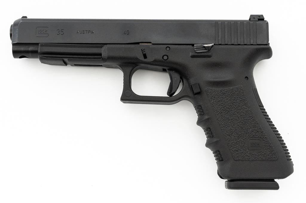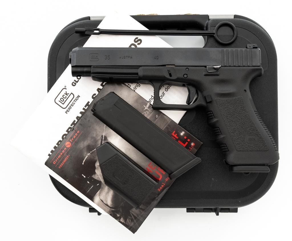 Glock Model 35 Gen 3 Competition Semi-Automatic Pistol, #NGK679, .40 S&W cal., 5.31'' barrel, matte black finish, polymer frame, white dot blade front, and adjustable white-outline rear sight, with two (2) 10-round Glock magazines. Includes factory hardcase with matching label, cleaning rod, instruction manual, and Crimson Trace DVD. Pistol is in excellent overall condition, retaining approx. 98%-99% factory finish, with only a few light handling marks. Action is crisp. Bore is mirror bright with excellent rifling. Est.: $500-$700. (Modern/PPT)