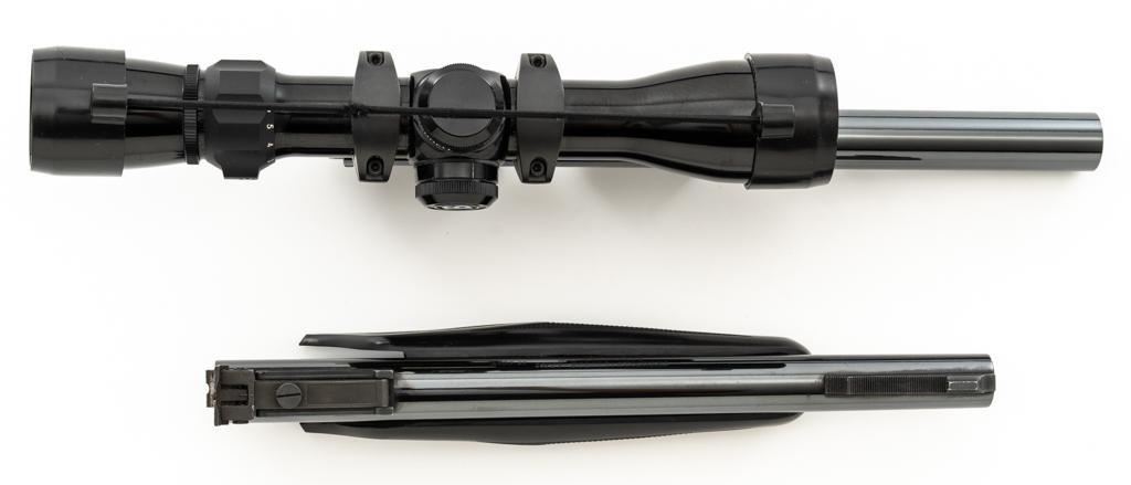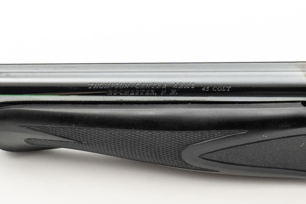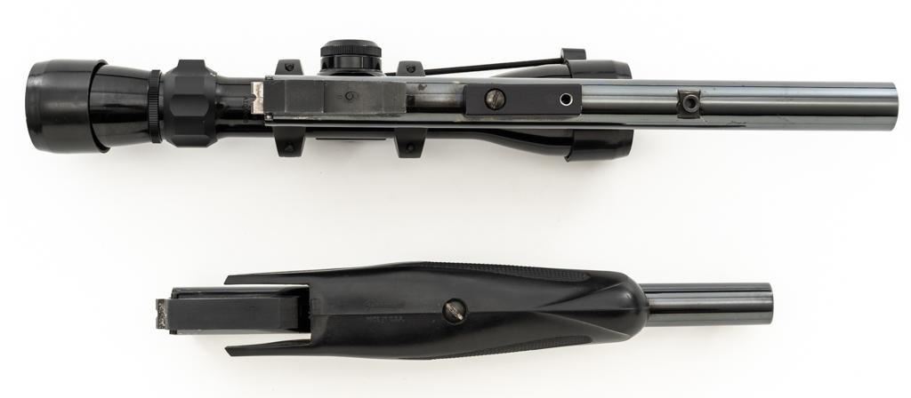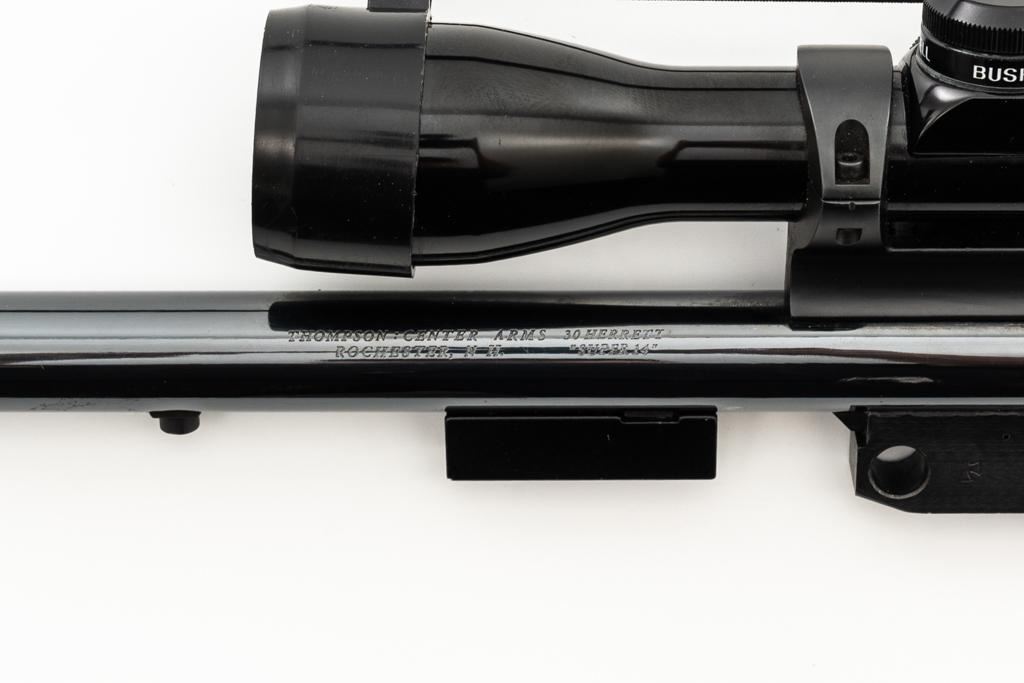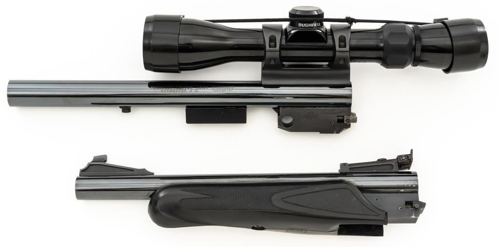 Lot of Two (2) Thompson Center Arms Contender Barrels: 1.) 10'' barrel, .30 Herrett cal., blue finish with Bushnell 2-6x32mm handgun scope. 2.) 10'' .45 Colt cal., black rubber Pachmayr forend, and standard sights, including a fully adjustable rear sight. Both are in near excellent condition with scattered slight micro-scratching and approx. 97%-98% blue remains. The .30 Herrett barrel was originally a ''Super 14'' and has been cut to its present length. Pachmayr forend is excellent. Both bores are bright with well-defined rifling. Bushnell scope with 1'' tube and duplex reticle; optics are bright and clear. Est.: $200-$400/lot.