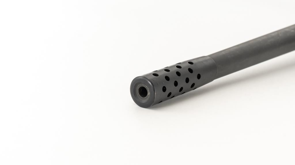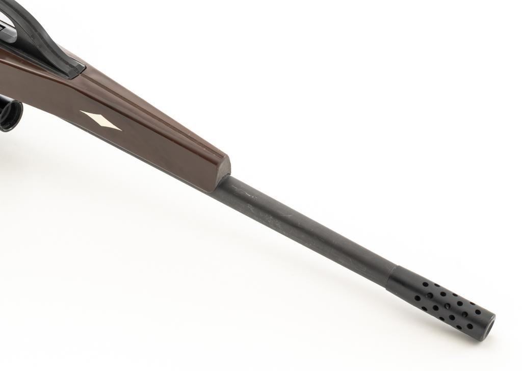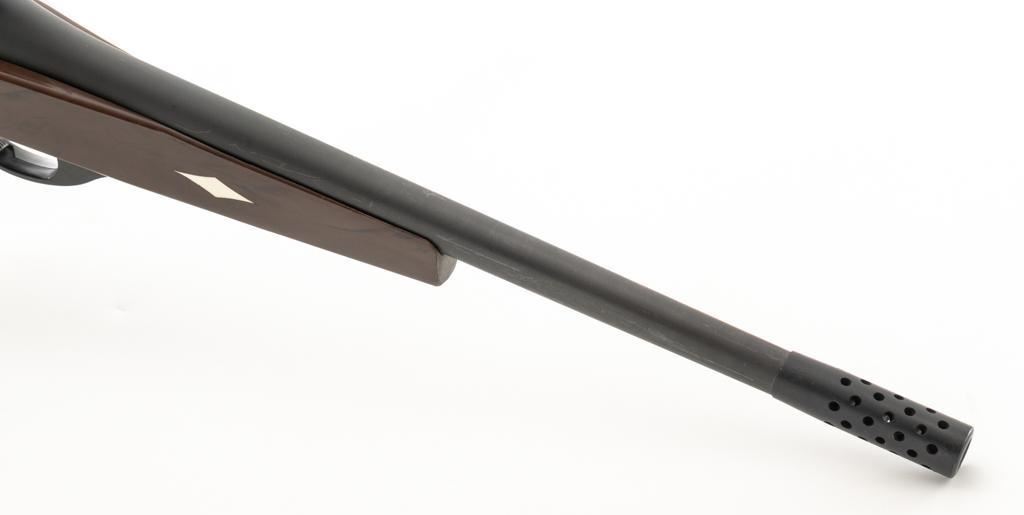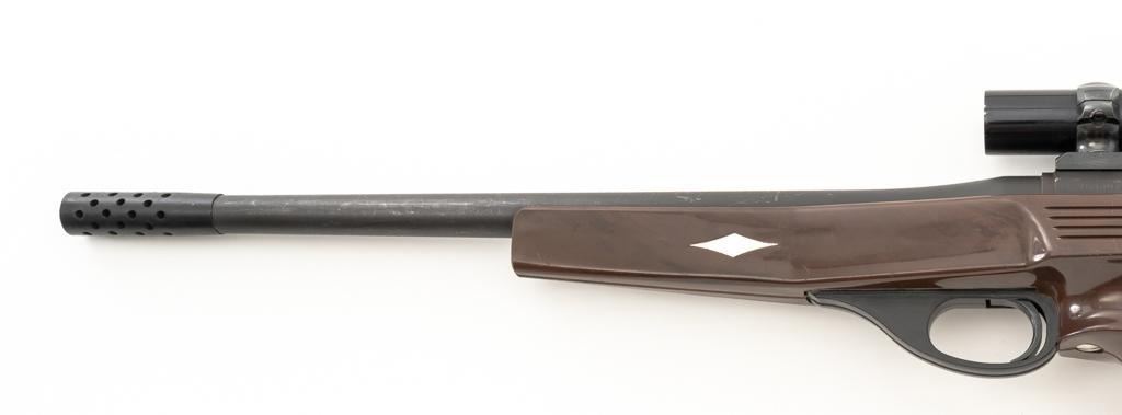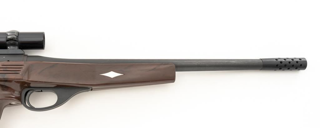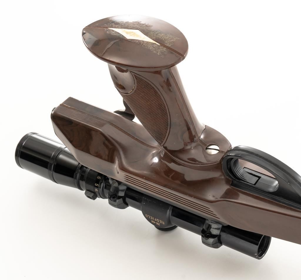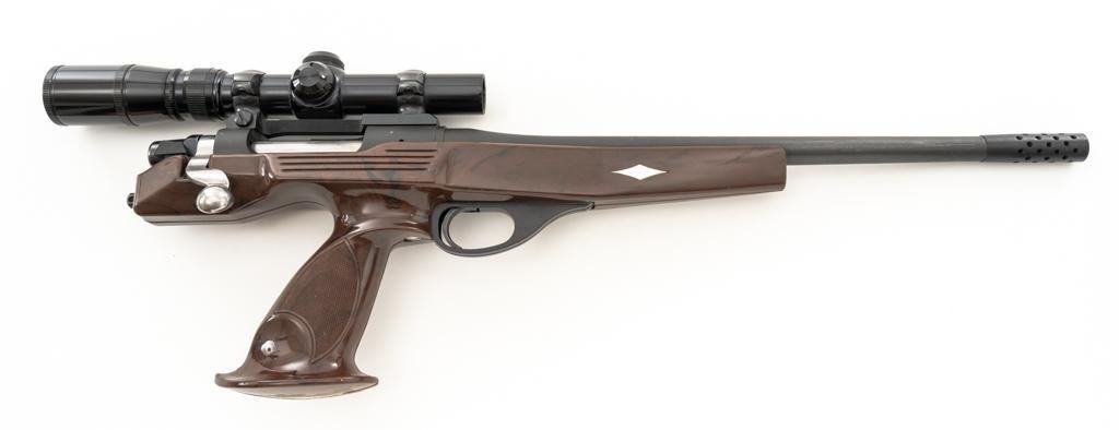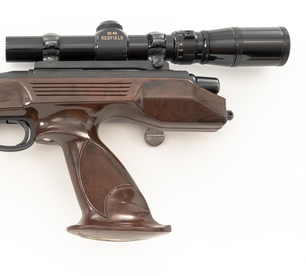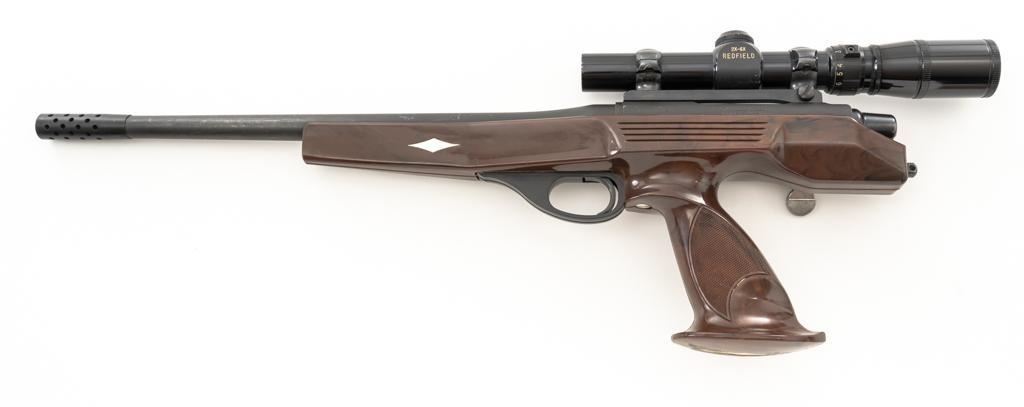 Custom Remington Model XP-100 Bolt Action Single Shot Pistol, #B7506998, .221 Rem. Fireball cal., 16'' barrel with ported muzzle brake, matte blue finish, dog leg bolt handle, checkered one-piece brown DuPont Zytel nylon pistol grip stock with diamond pattern inlays in the forend and pistol grip. There is no provision for sights. Topped with a Redfield one-piece base, rings, and Redfield 2-6x pistol scope, with gloss black finish, and duplex reticle. Scope is near excellent with clear optics. Pistol is in near fine overall condition, retaining approx 93%- 94% thinning finish with intermittent scrapes and scratches along the barrel. Stock with sharp checkering detail and old adhesive on the bottom of the grip which should clean. Action functions smoothly. Bore is bright with defined rifling. Est.: $700-$1,000. (Modern/PPT)