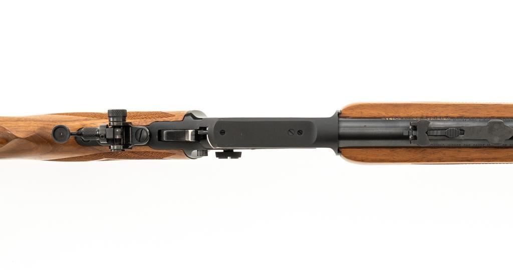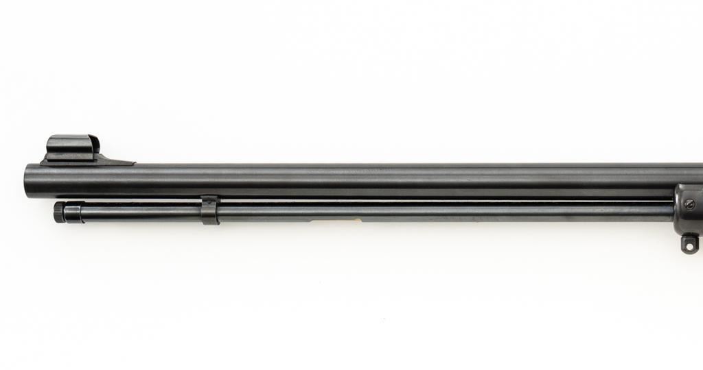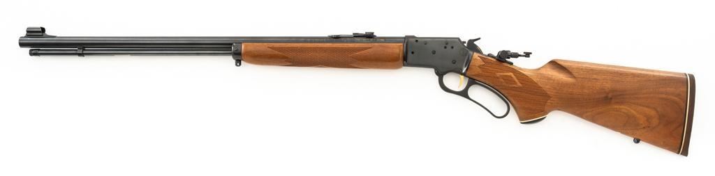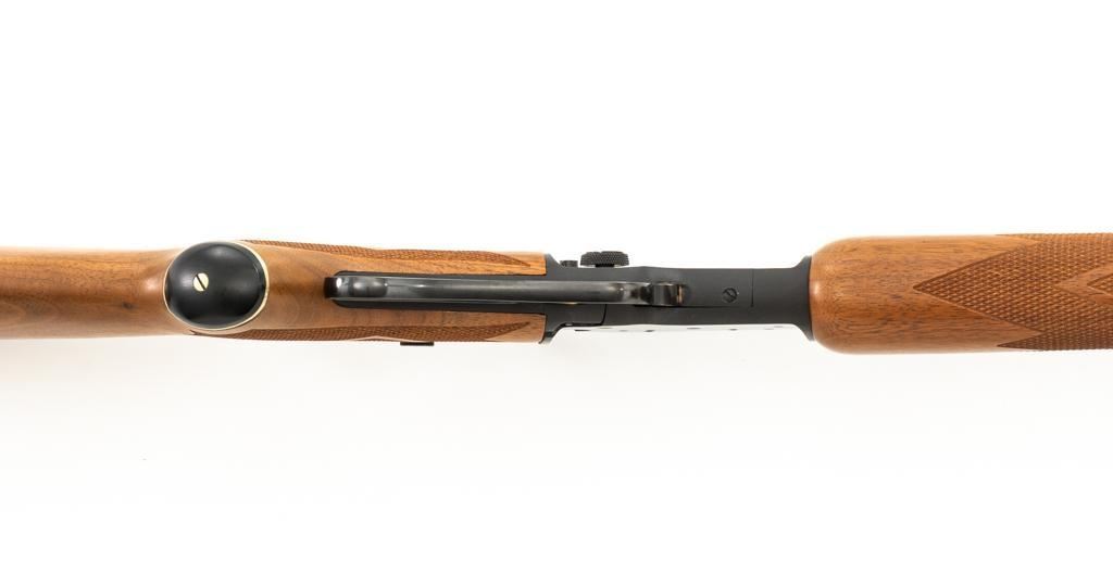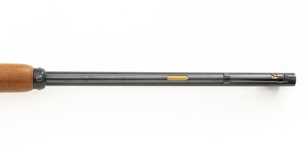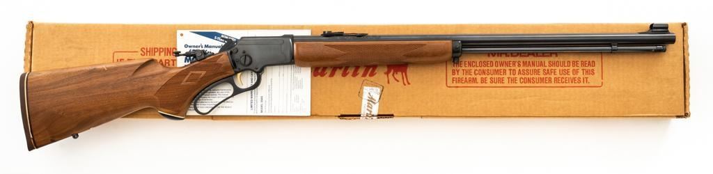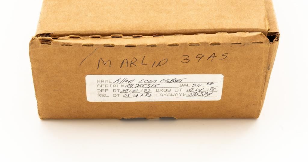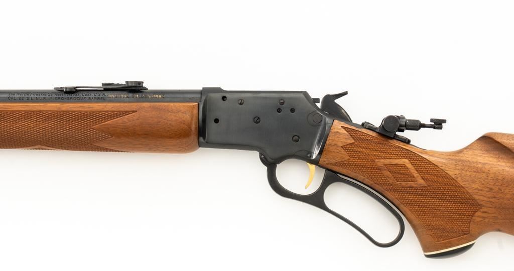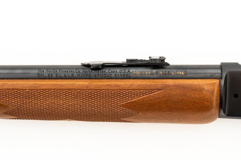 Marlin Original Golden Model 39AS Lever Action Takedown Rifle, #08255315, .22 S-L-LR cal., 24'' ''JM'' marked micro-groove round barrel, with blue finish. Checkered American black walnut forend and pistol grip stock with sling swivel studs, ebony grip cap, Marlin ''bullseye'', and ends with a ribbed solid rubber Marlin recoil pad, providing a 13.75'' LOP. Rifle also features a hooded brass beaded ramped blade front and folding semi-buckhorn rear sight, modern folding aperture sight added to the tang, and gold colored trigger. Includes factory cardboard box with instruction manual, warranty card, and associated packaging materials. Mfg'd 1992. Rifle is in excellent, near new overall condition, with only a few light handling marks to the metal. Stock with an indentation on the right side of the comb and discoloration on the right side of the buttstock at the pad. Action operates smoothly. Bore is bright with excellent rifling. Est.: $600- $800. (Modern/PPT)