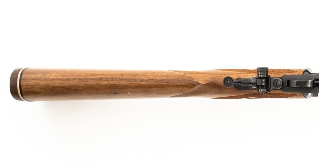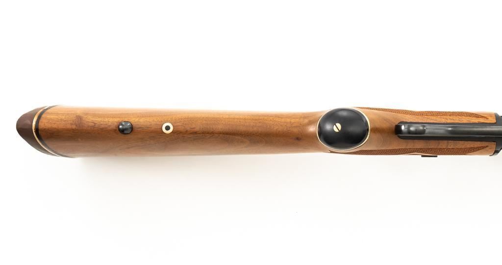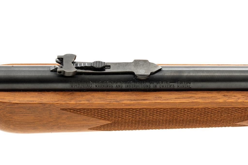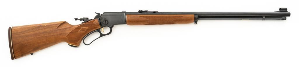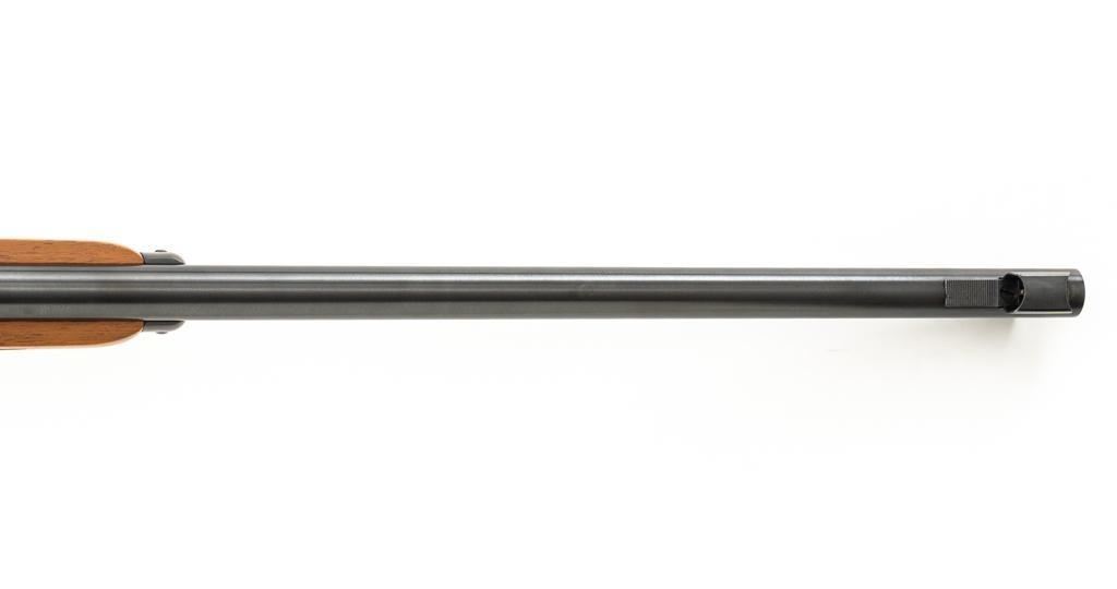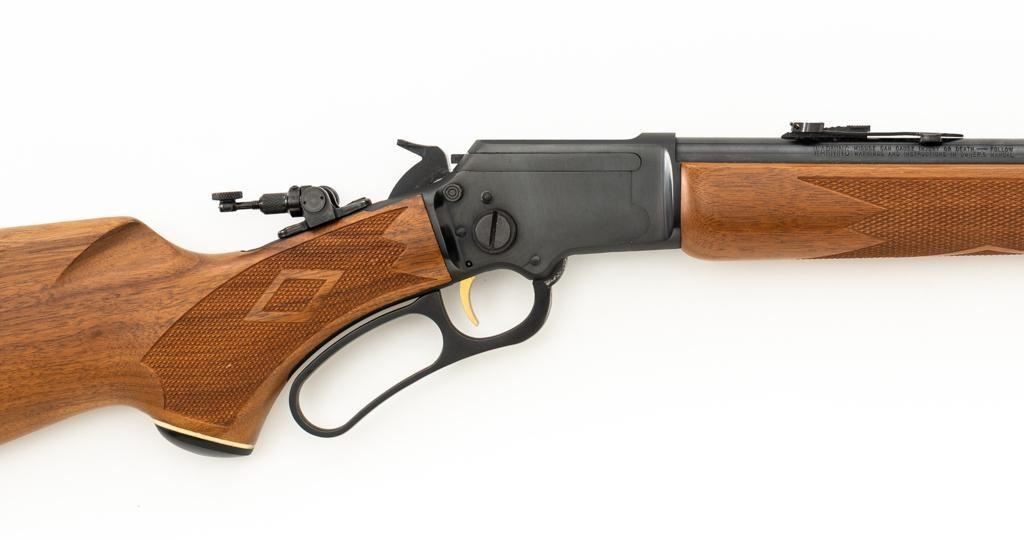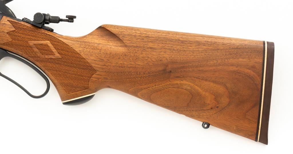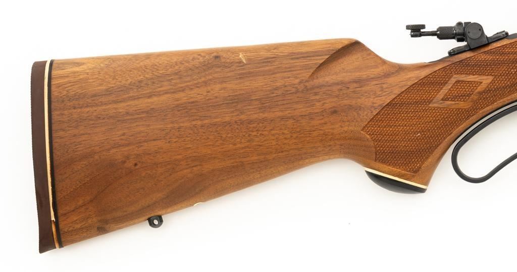 Marlin Original Golden Model 39AS Lever Action Takedown Rifle, #08255315, .22 S-L-LR cal., 24'' ''JM'' marked micro-groove round barrel, with blue finish. Checkered American black walnut forend and pistol grip stock with sling swivel studs, ebony grip cap, Marlin ''bullseye'', and ends with a ribbed solid rubber Marlin recoil pad, providing a 13.75'' LOP. Rifle also features a hooded brass beaded ramped blade front and folding semi-buckhorn rear sight, modern folding aperture sight added to the tang, and gold colored trigger. Includes factory cardboard box with instruction manual, warranty card, and associated packaging materials. Mfg'd 1992. Rifle is in excellent, near new overall condition, with only a few light handling marks to the metal. Stock with an indentation on the right side of the comb and discoloration on the right side of the buttstock at the pad. Action operates smoothly. Bore is bright with excellent rifling. Est.: $600- $800. (Modern/PPT)