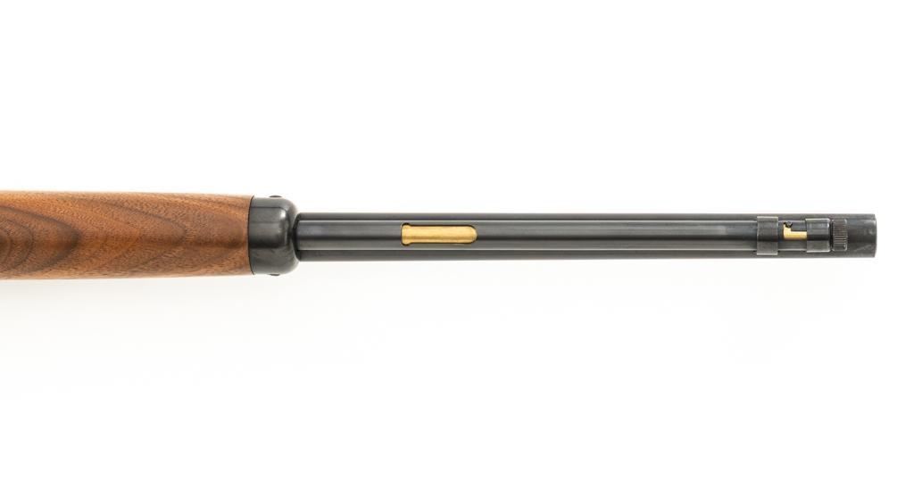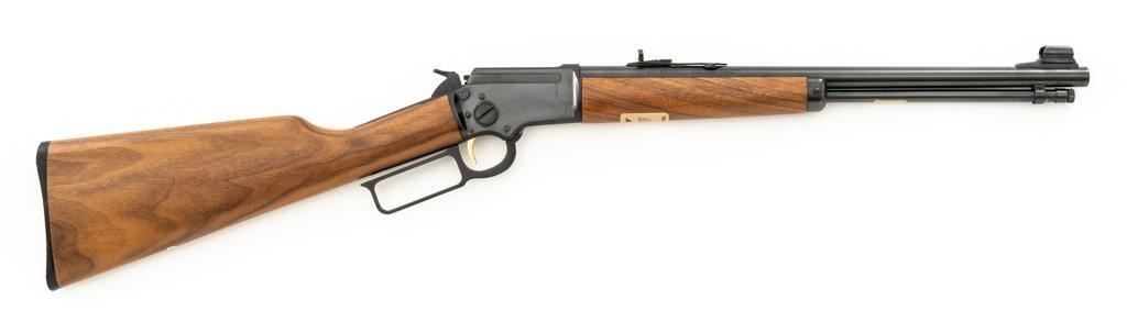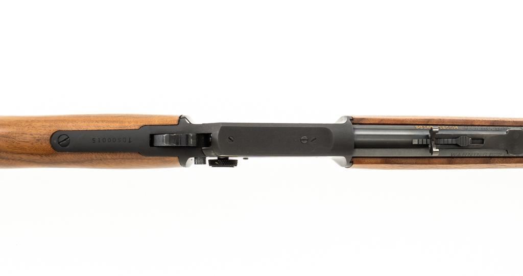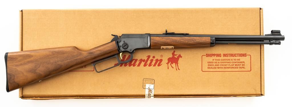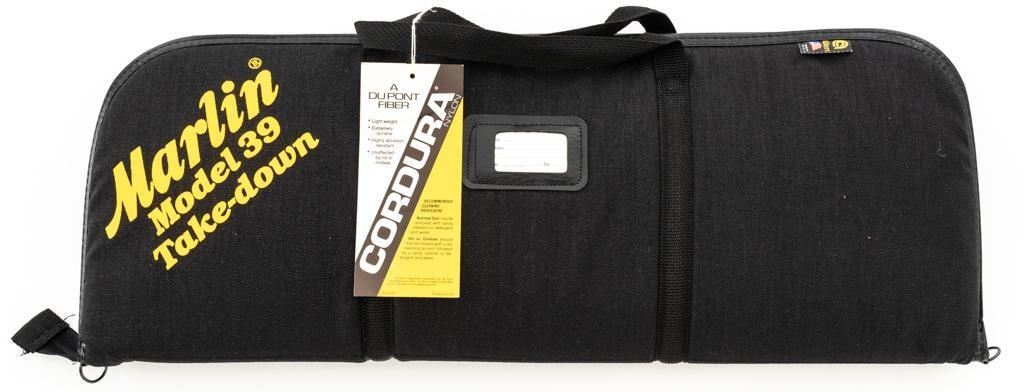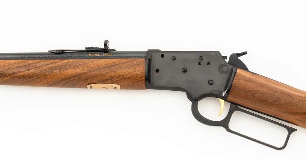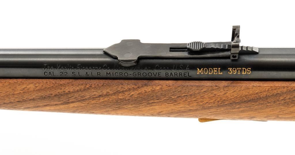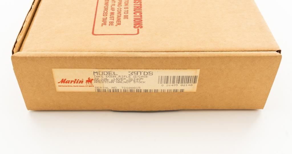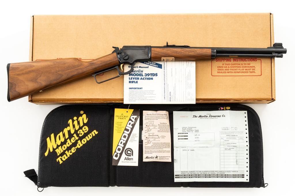 1st Year Production Marlin Model 39 TDS Lever Action Trapper Carbine, #TDS00015, .22 S-L-LR cal., 16.5'' ''JM'' marked micro-groove barrel, blue finish, smooth walnut forend and straight grip stock, ending with a checkered plastic Marlin buttplate, providing a 13.5'' LOP. Carbine also features a hooded ramped blade front and adjustable semi-buckhorn rear sight, factory drilled and tapped receiver, and gold colored trigger. Includes the factory cardboard box with matching end label, shipping box, hanging instruction manual, and Marlin padded boot. Mfg'd 1988. Carbine is in excellent, as new condition, with only light storage marks, appearing unfired. The original Marlin inspector's sticker is still on the forend. Action is crisp. Bore is mirror bright with excellent rifling. Est.: $900-$1,200. (Modern/PPT)